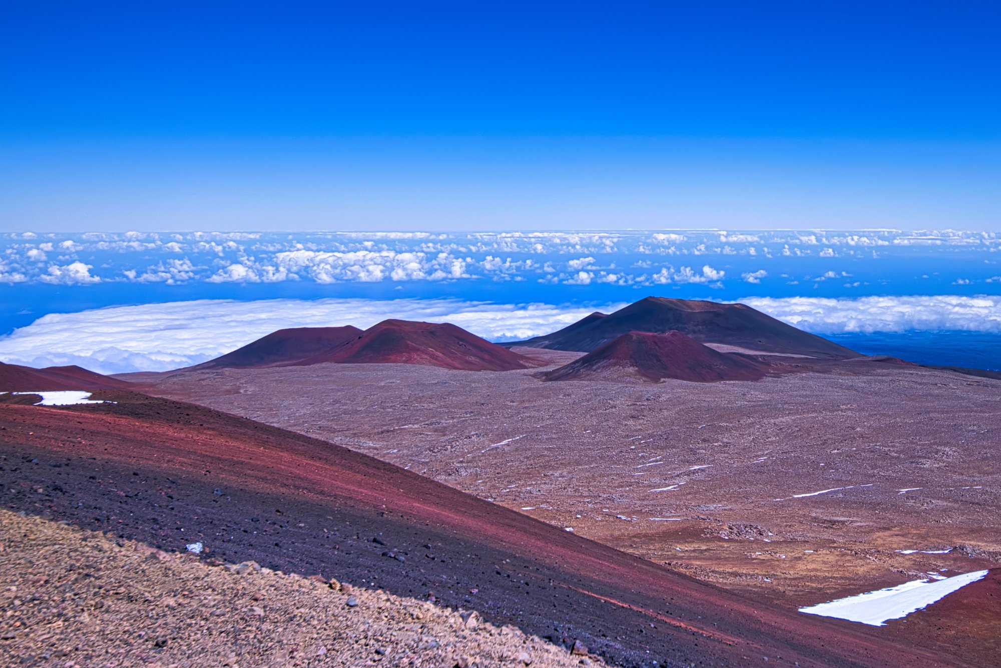 Wir erhielten eine ausführliche Lektion, wie wir uns zu verhalten hätten, welche Gefahren uns drohten und es waren etliche, was wir in welchem Fall, wie zu machen hätten. Der Ranger half uns sogar, die richtige Einstellung 4*4 low einzustellen. Dann ging es 4 Meilen eine Schotterstraße wirklich steil bergauf, die dann die restlichen Kilometer bis zum Gipfel asphaltiert war. Die Luft wurde dünner, Toma maß ihre Sauerstoffsättigung im Blut mit ihrer Fitnessuhr. Es war kalt und wir zogen uns die restlichen warmen Sachen an, die wir noch nicht im Visitorzentrum aufgelegt hatten. Ich spürte nicht die Anzeichen von Höhenkrankheit, wie wir sie gespürt hatten, als wir in Peru auf 4000 Meter Höhe in die Anden gefahren sind, auch direkt vom Sealevel. Wir hatten Sonne satt, einen fantastischen Blick über die Insel, bis zu den Wolken am Meer.