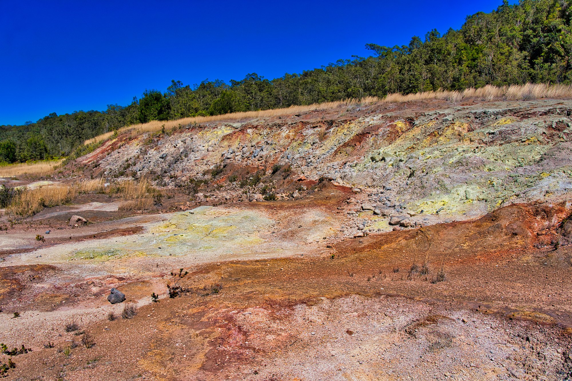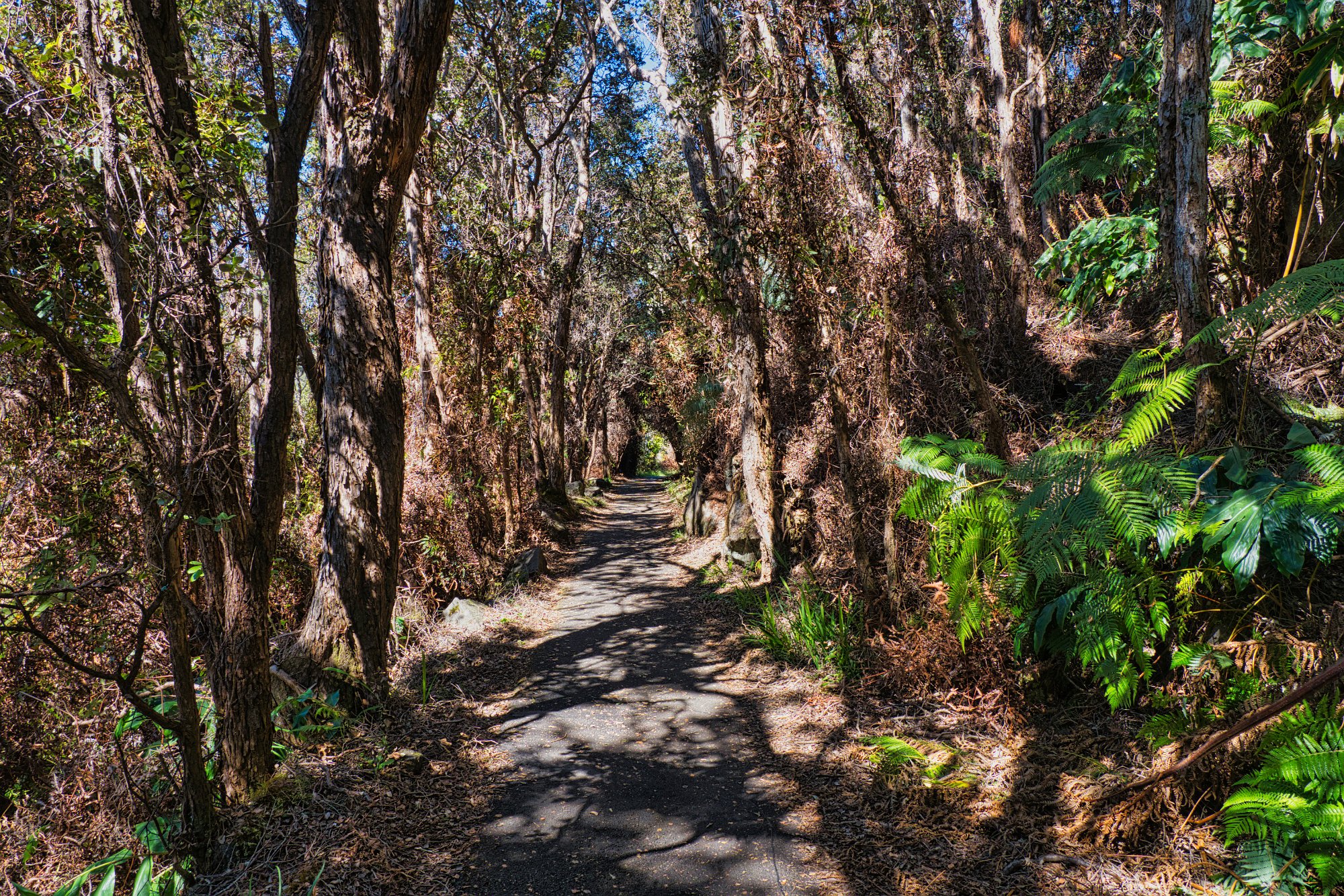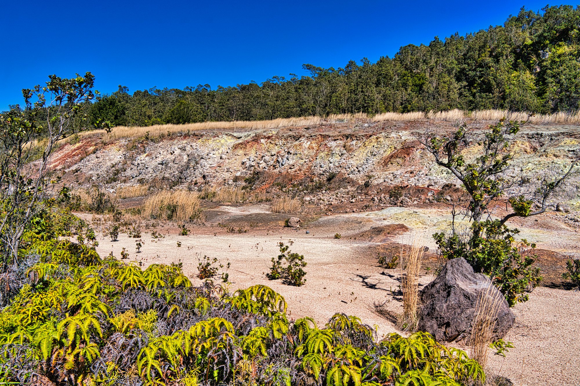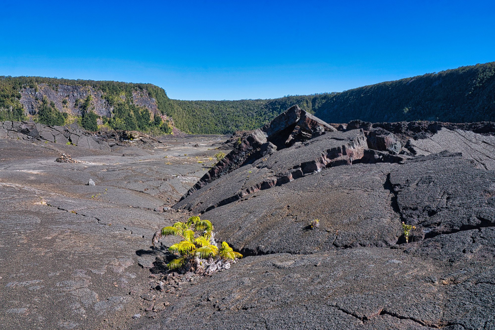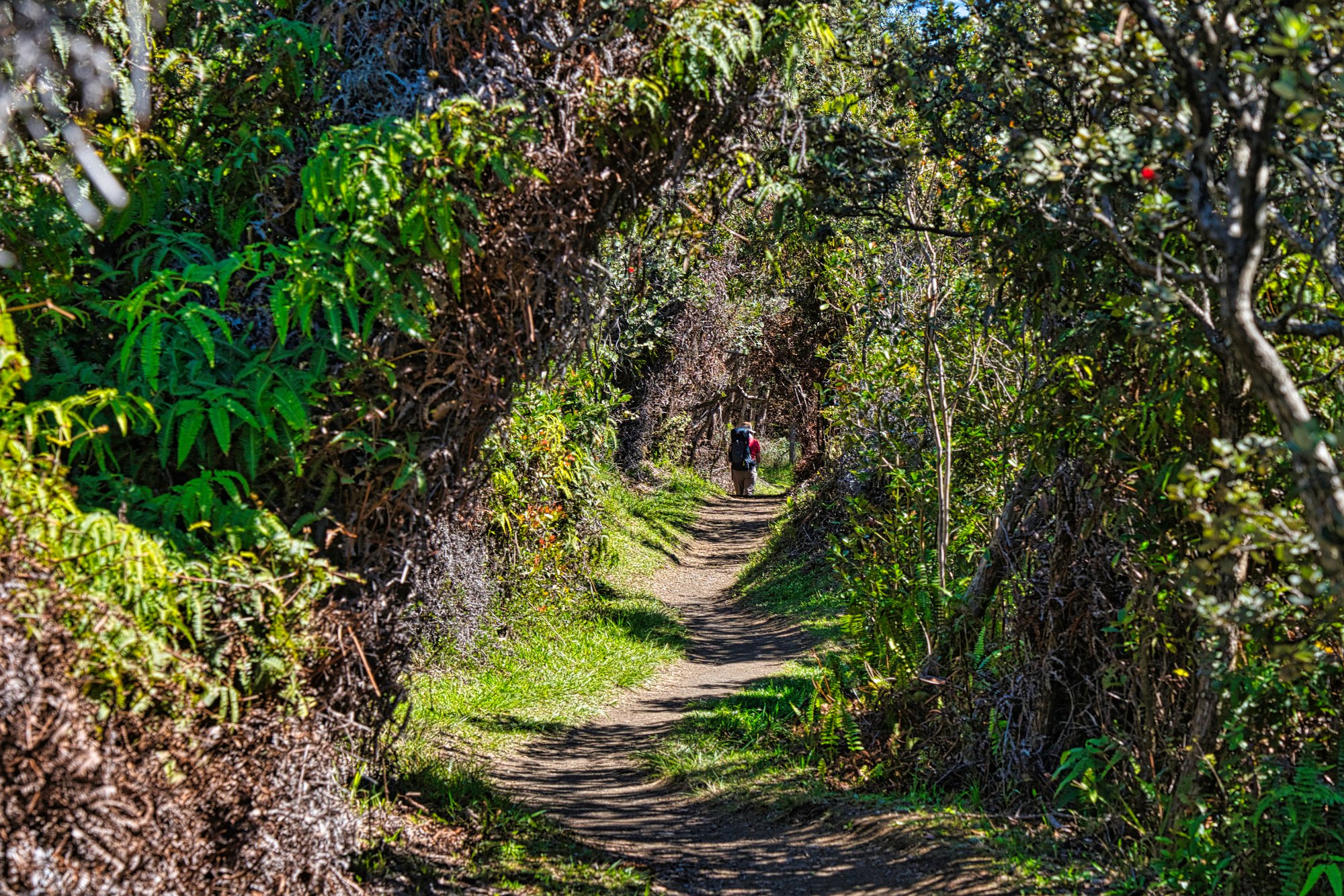 Wir liefen durch einen schönen Wald mit Baumfarne am Rand des Kraters entlang, bis dann der Weg, der Iki-Trail, sich hinabwand in die Caldera des Iki-Vulkans, ein Seitenkrater, der im vergangenen Jahrhundert ausbrach.