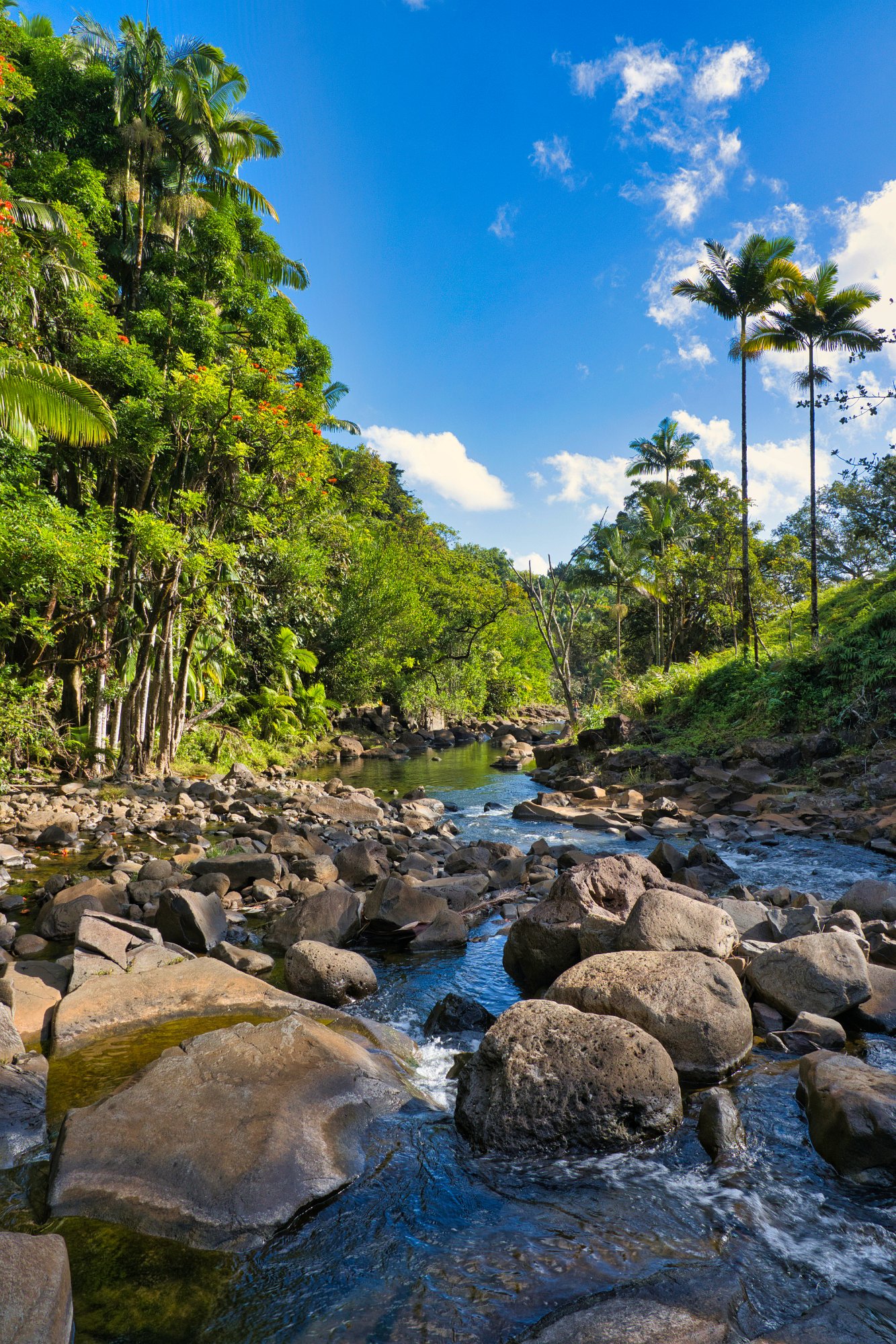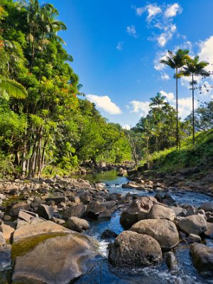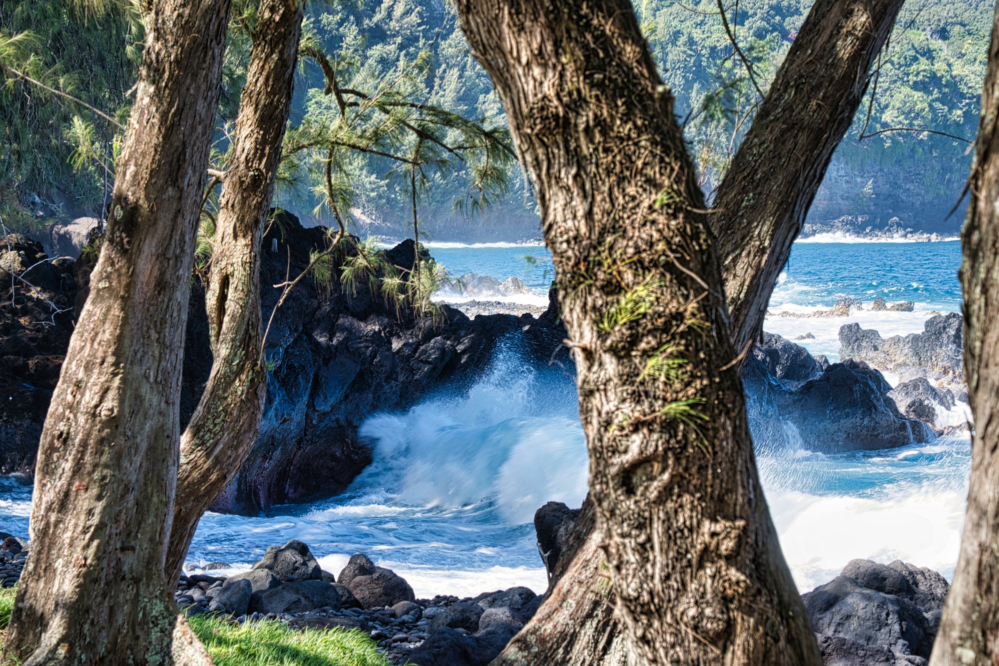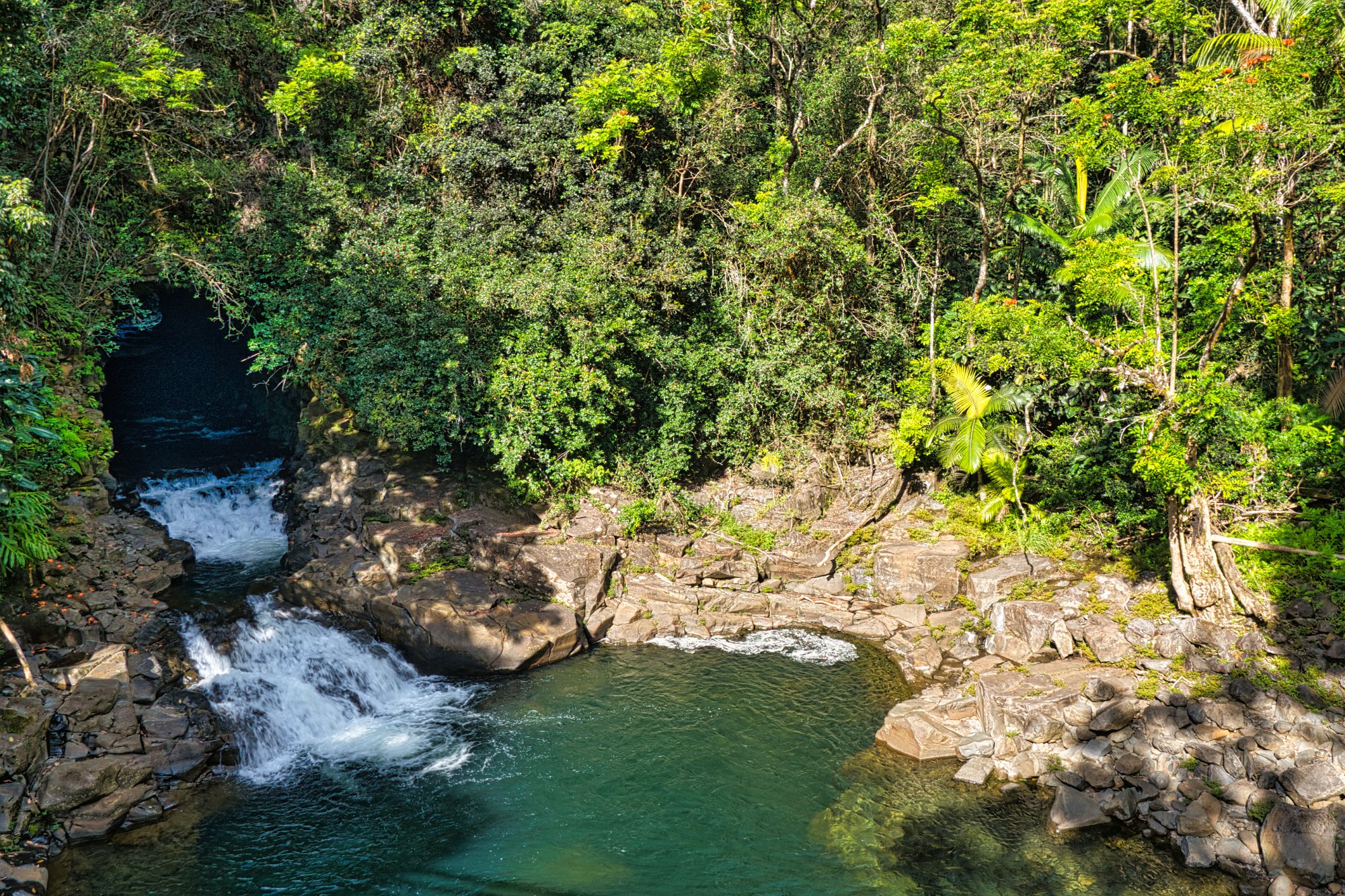 Nach einigen Kilometern / Meilen, ging es ab von der Hauptstraße auf die „Scenic Route“. Sie führte durch exotisches Grün, entlang von Buchten und über Brücken, von denen man auf die Bäche / Flüsse schauen konnten, die von den Bergen in das Meer mündeten. Einer solcher Brücke hielten wir an und gingen auf einem kleinen, steilen Pfad hinunter zum Fluss, der mit zwei kleinen Wasserfällen aus einem Lavatunnel austrat und in einem Pool mündete. Total romantisch eingerahmt von vielen riesigen Palmen und Zimmerpflanzen, eben nur in groß.