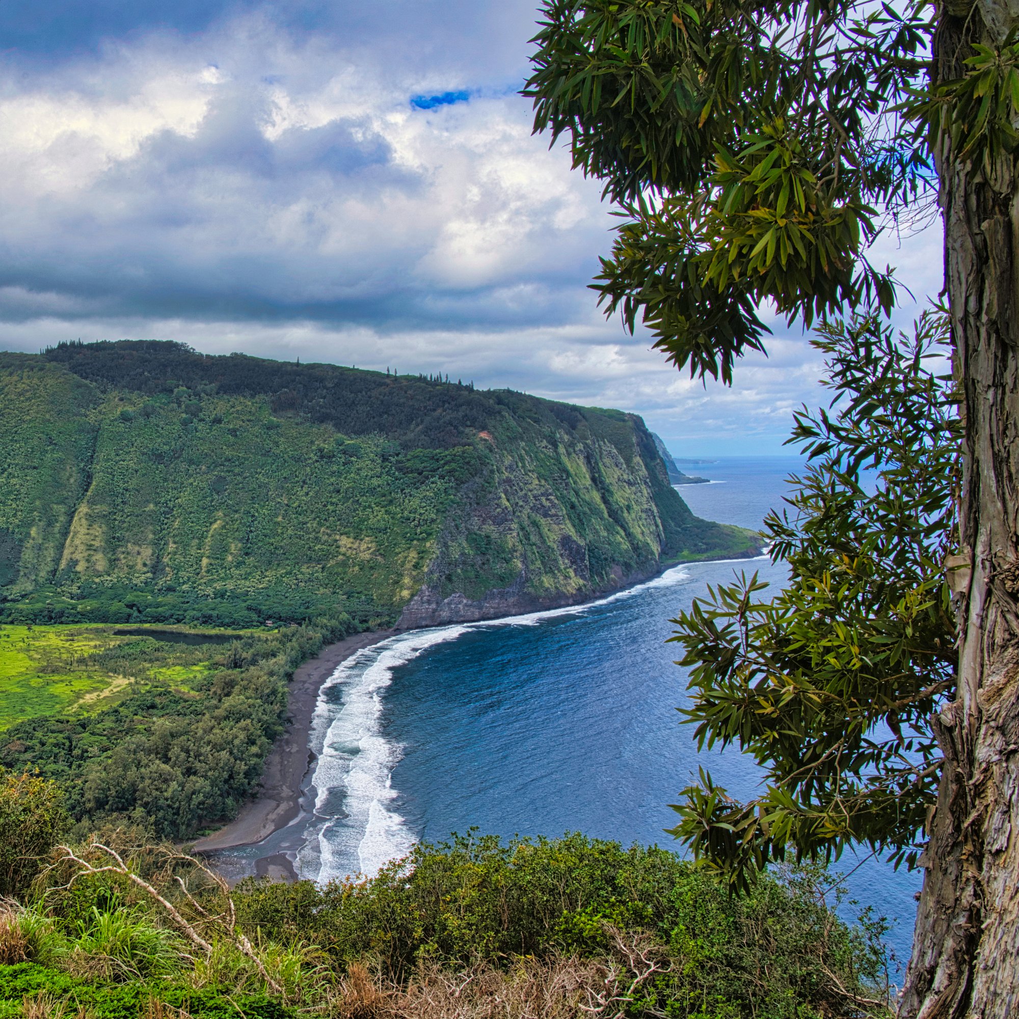 Weiter ging es zum Laupahoehoe, eine Art Campingplatz am Meer. Ein wunderschönes Fleckchen Erde! Blaues Meer mit Brandung an den Lavafelsen, Palmen, Blumen. Hier verweilten wir. Fotos, Drohne (sie kam zum ersten Mal über dem Meer zum Einsatz) und Picknick, denn es war erstaunlicherweise schon Viertel vor Zwölf.