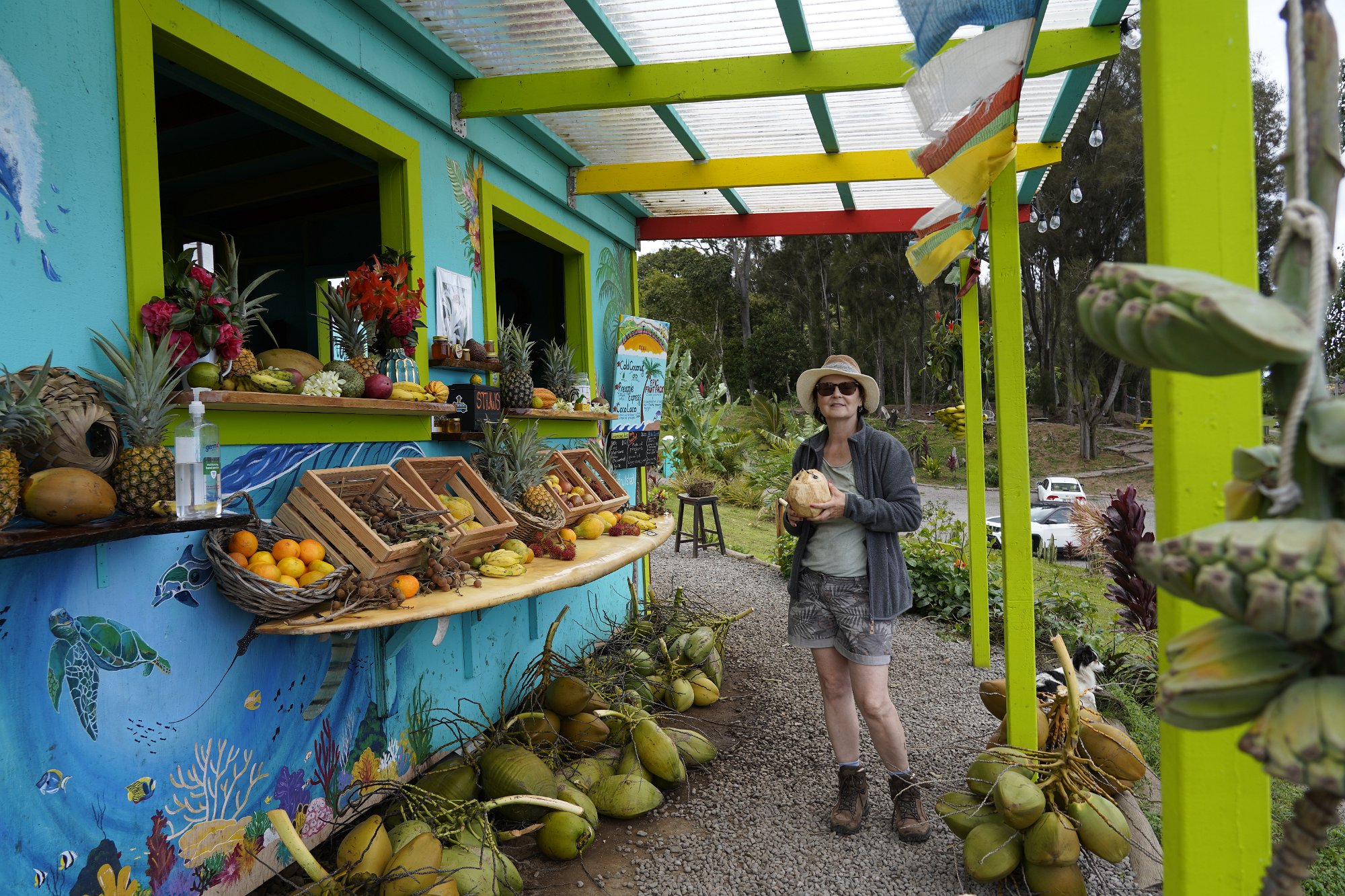Rückfahrt und Stopp gleich an dem ersten Fruchtstand, Kokosnuss essen. Sehr stylisher Fruchtkiosk mit typischem Hawaiianer. Dachten wir. Es war ein Russe. Geboren in Russland und als Waisenkind von Amerikanern adoptiert mit 6 Monaten.