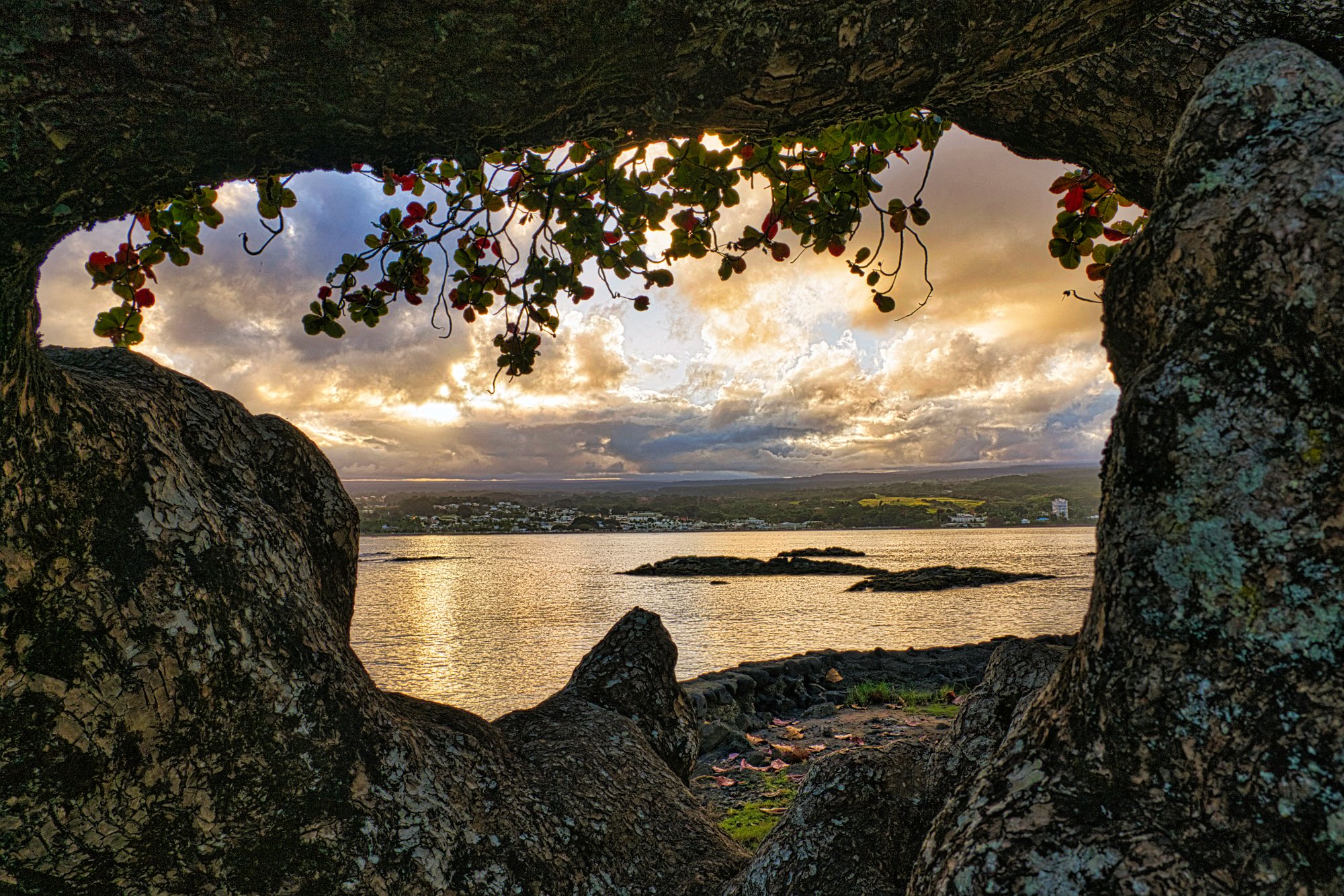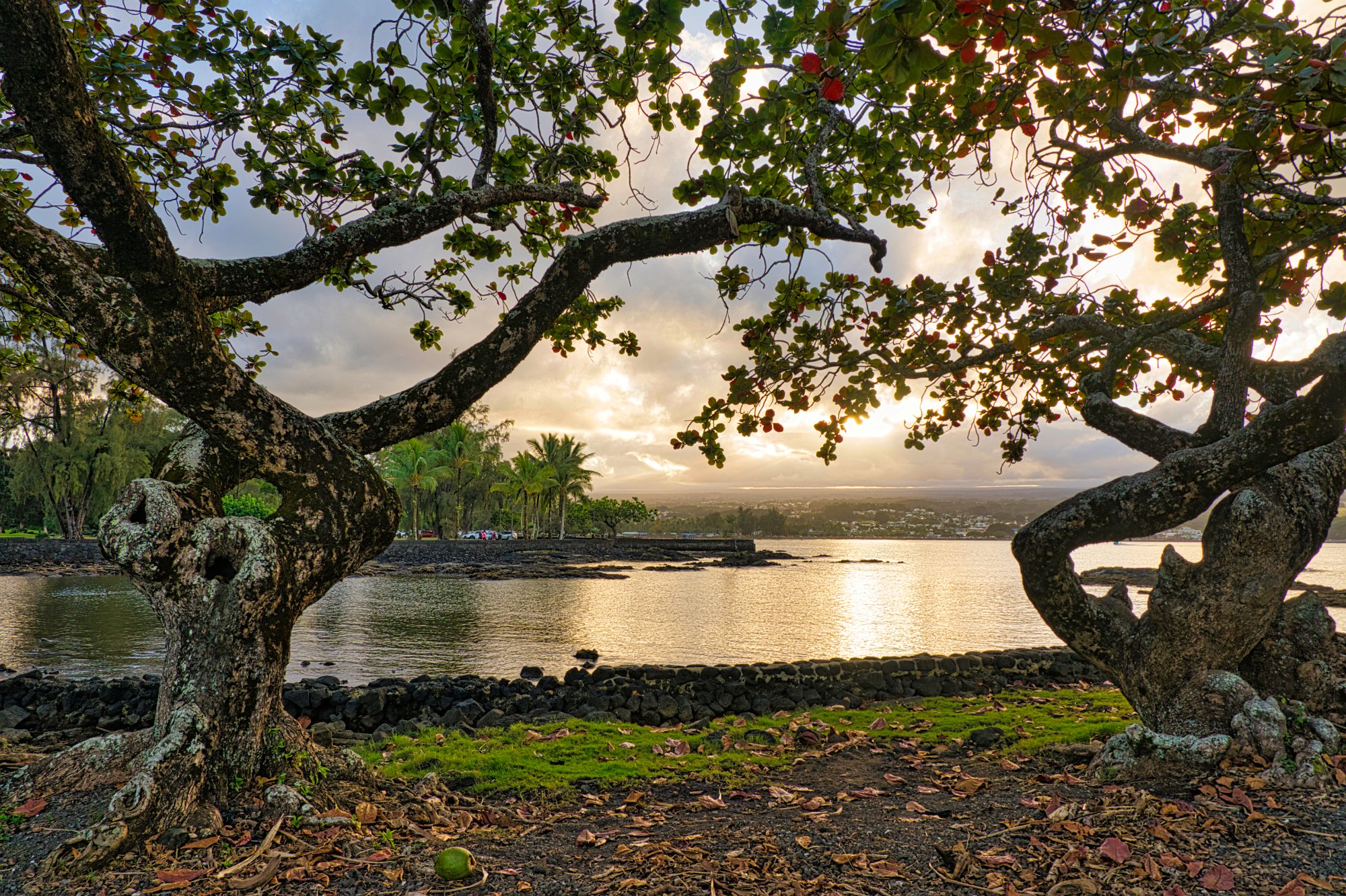 Den botanischen Garten schafften wir nicht mehr, da er schon um 16 Uhr geschlossen hatte. Also kamen wir recht zeitig im Hotel an und machten noch einen Spaziergang in die nähere Umgebung. Sonnenuntergang in den Wolken, die über dem Inselvulkan hingen. Heute habe ich mal meinem Graufilter draufgeschraubt. Als es dann dunkel war, fuhren wir zum Thai und ließen uns lecker bekochen (zum Mitnehmen). Gestern war es eindeutig zu viel, sodass wir heute nur ein Hauptgericht (Curry) nahmen.