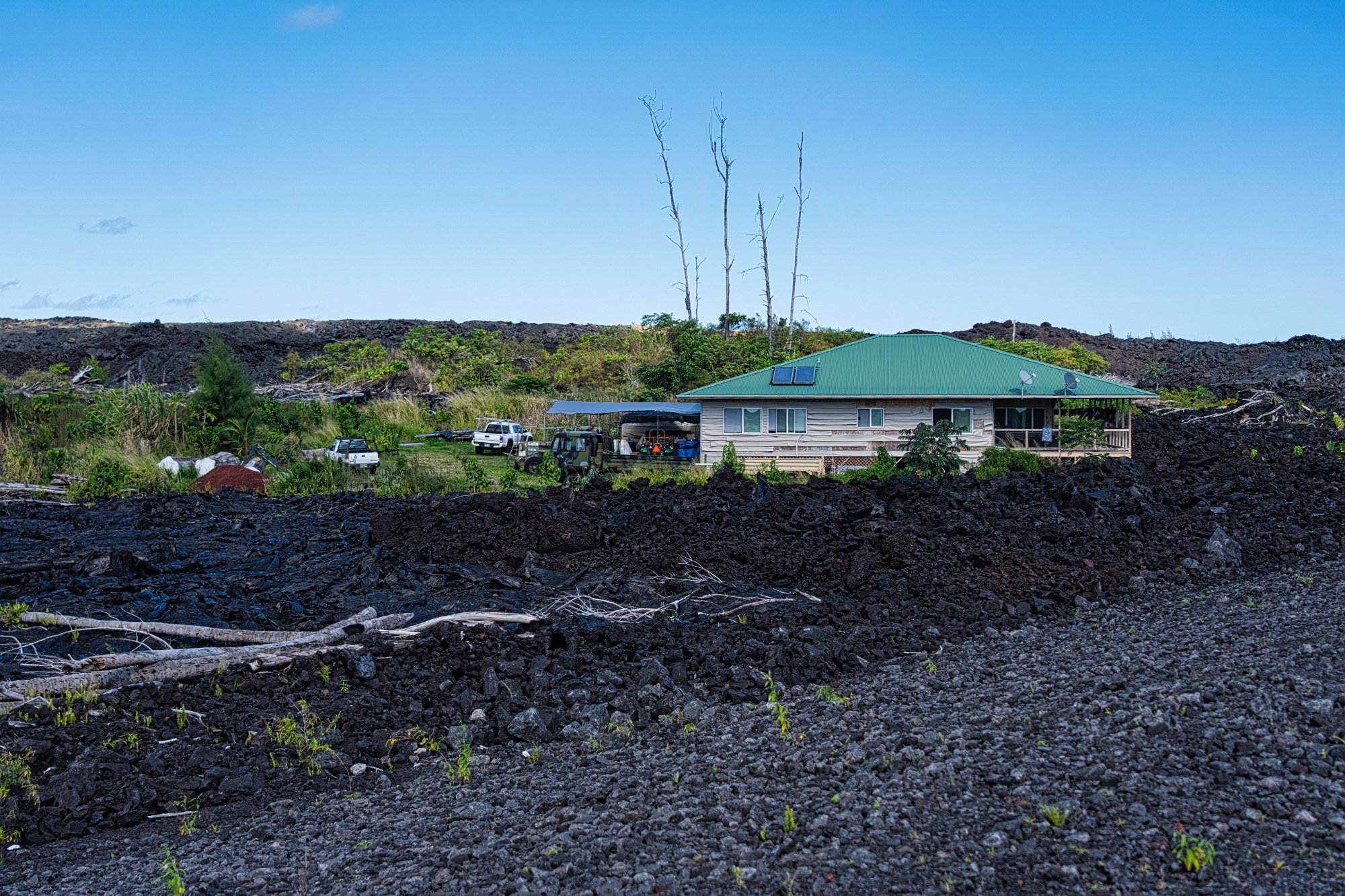 Als nächstes in eine Siedlung angeschaut, die direkt in der Nähe des Ausbruchs von 2018 liegt. Manche Anwesen sind von Lava überdeckt, auf manchen Grundstücken strömt noch Dampf aus der Erde. Daneben leben ganz normal Menschen.