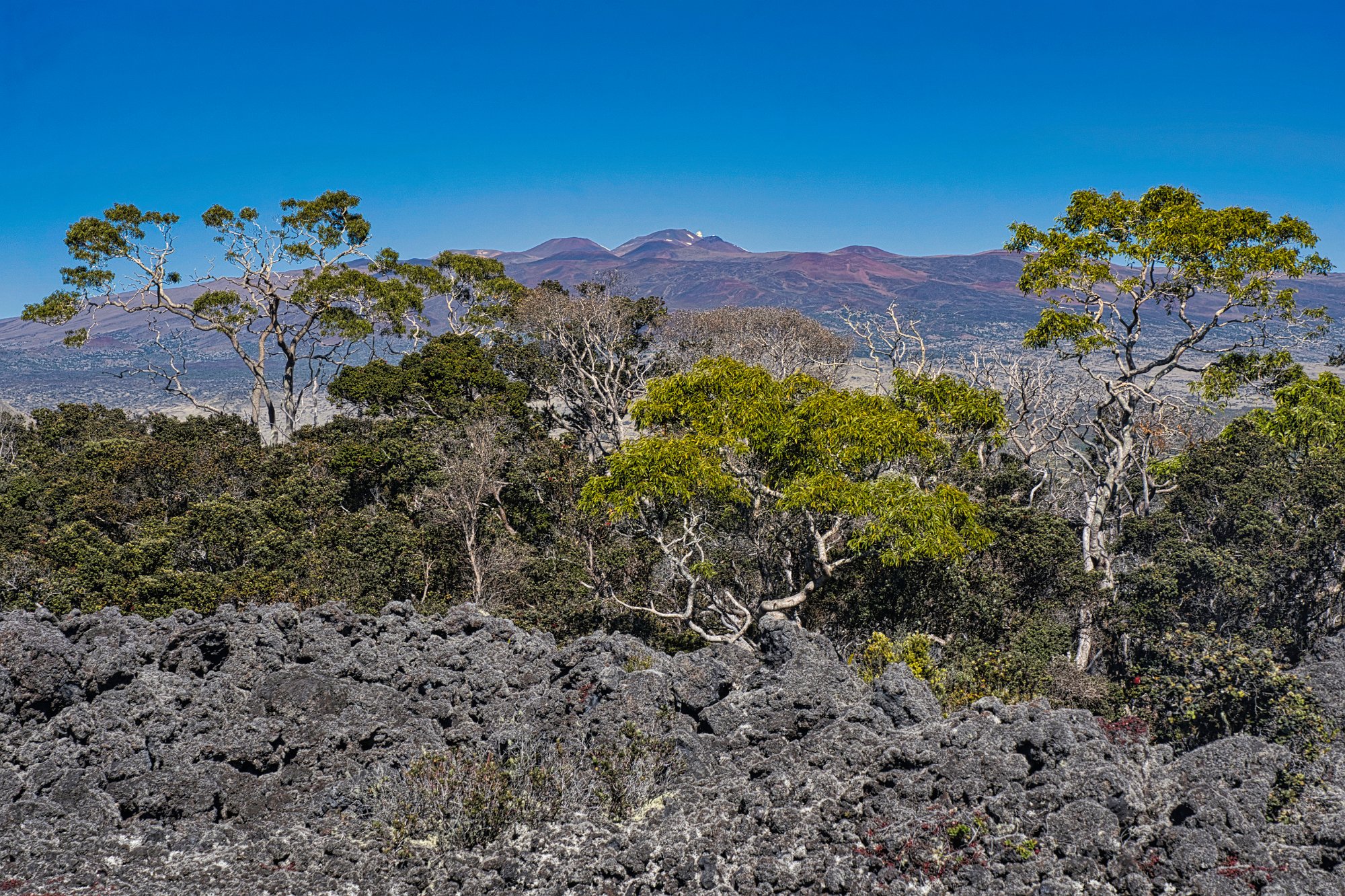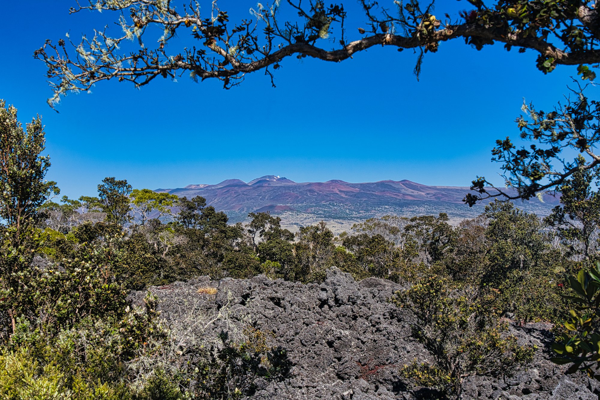Wir fuhren die Rennstrecke (abschnittsweise waren 60 Meilen erlaubt, was knapp 100 km/h Stunde entsprach) bergauf und an dem ersten Parkplatz mit Sicht auf den Vulkan Maui Kea hielten wir an. Toma kam mit einer Rentnerin, die ganz entzückt von den deutschen Nonnen sprach und schon in Oberammergau war, insGespräch. Sie riet uns den kleinen Weg/Walk durch den endemischen Wald mitten in dem Lavafeld zu machen. Machten wir und fanden es ganz nett. Als wir zurückkamen, wusste schon der ganze Parkplatz, dass wir Kelemania waren.