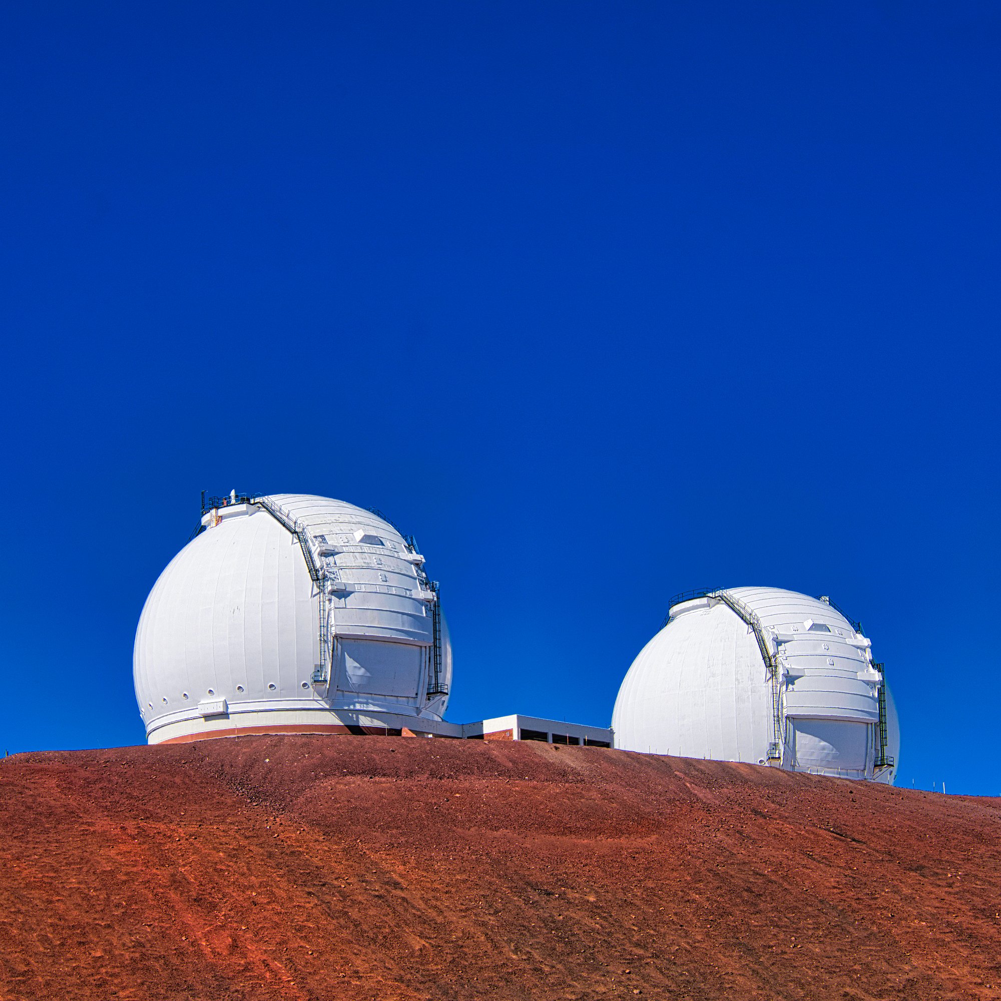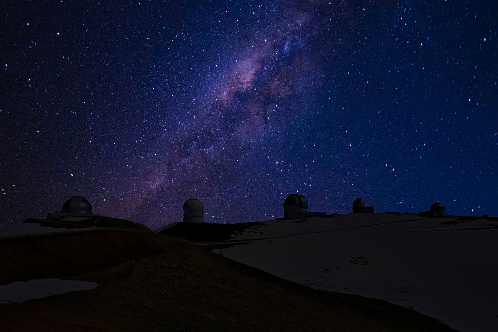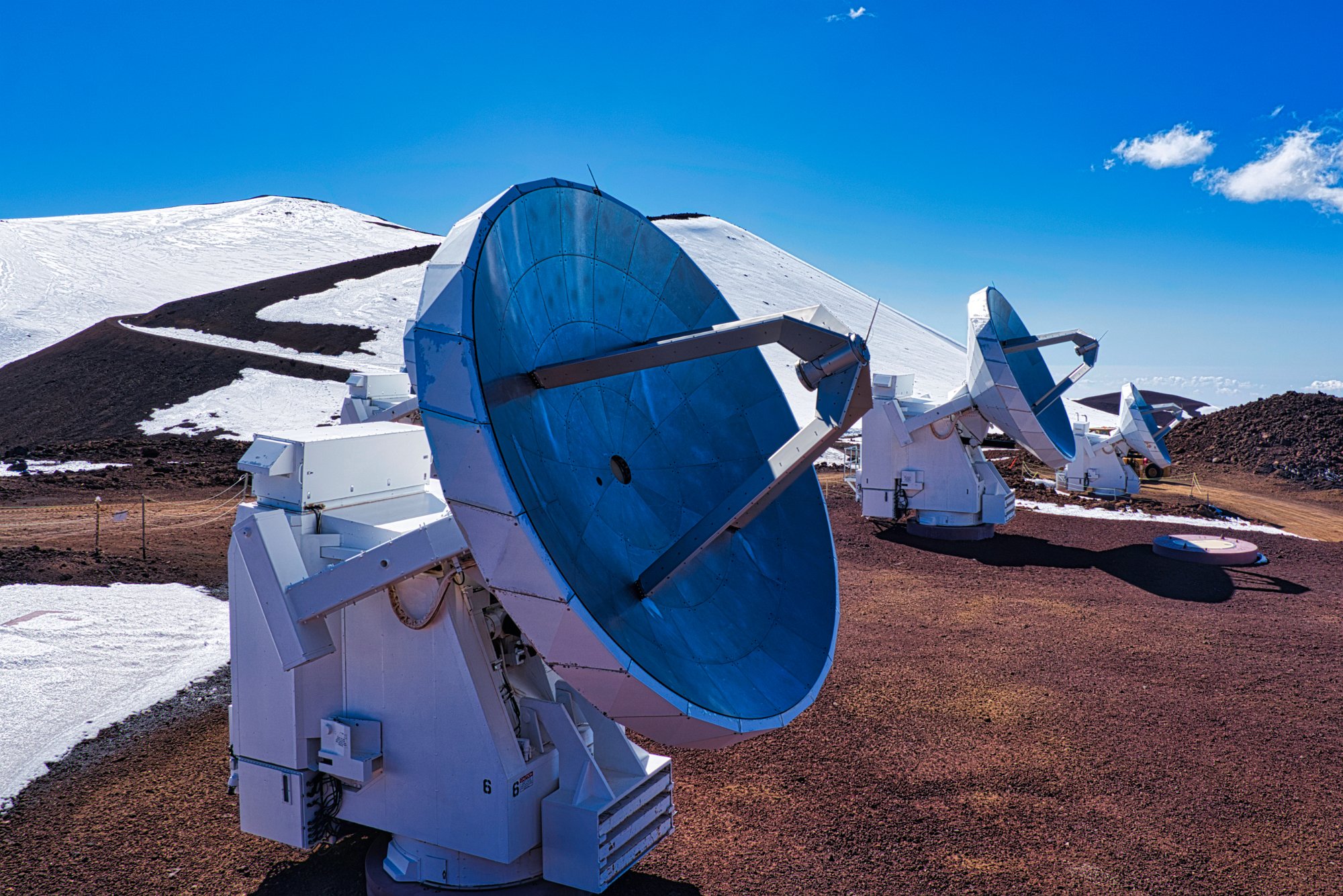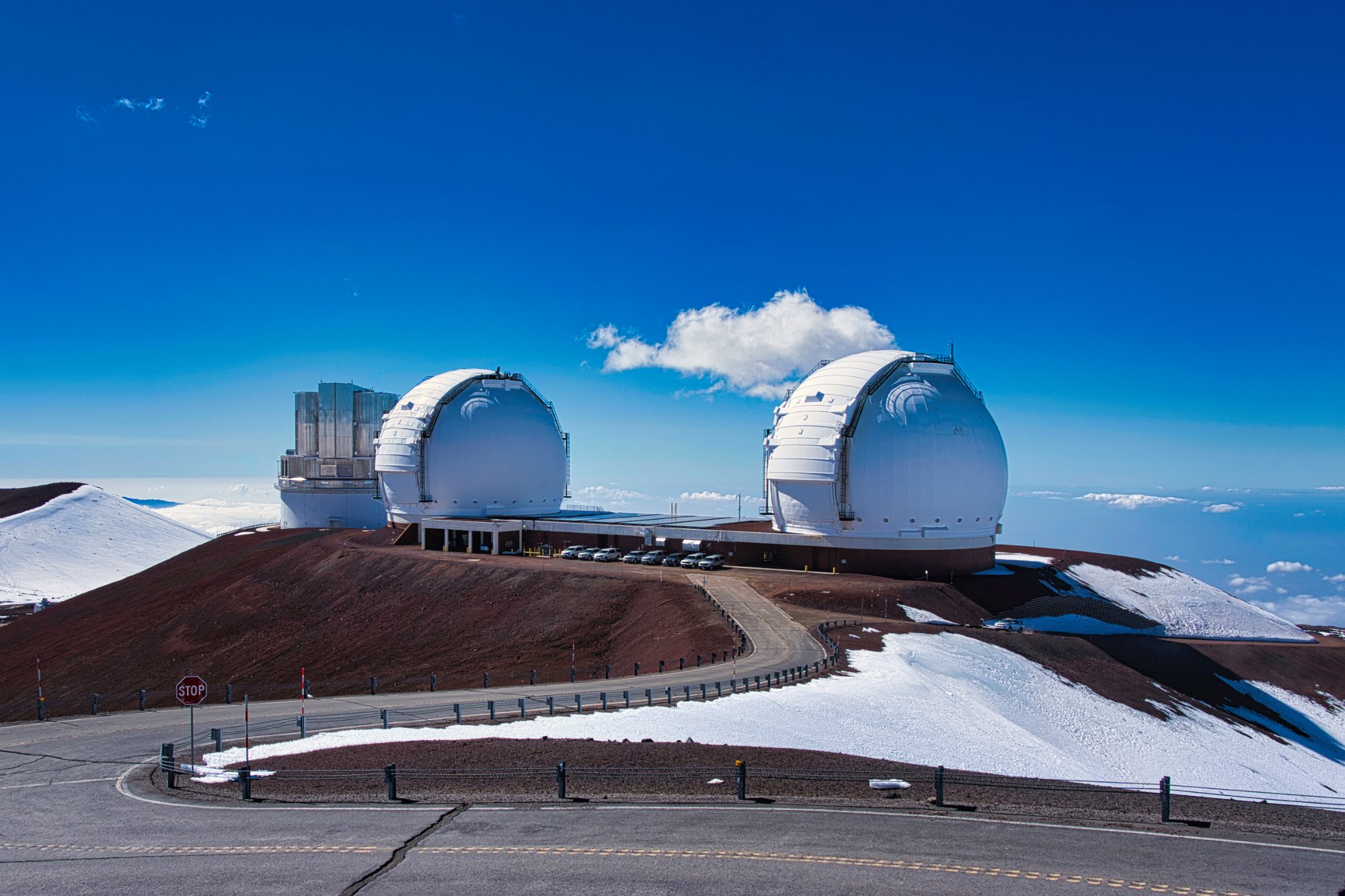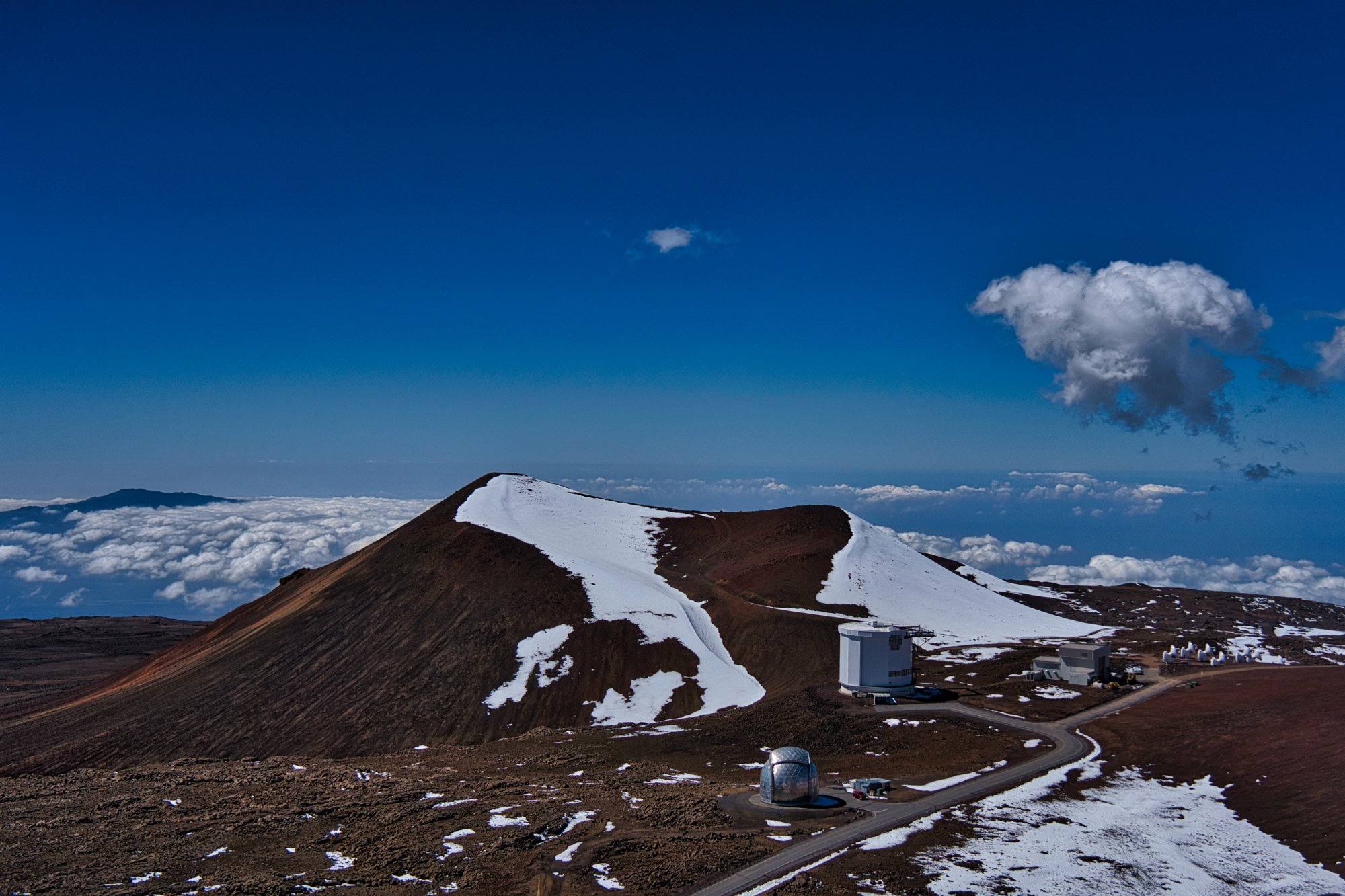 Auf dem Gipfel oder besser rings um den Gipfel herum, denn der war nicht steil, eher platt, waren viele Teleskope. Und es waren richtig große. Die Webseite sagt, es seien die größten der Welt. Aber alle waren geschlossen. Man konnte zwar direkt an die Tür klopfen und davor parken, aber Einlass wurde uns wegen Corona nicht gewährt. Es gab noch Schnee auf über 4000 Meter. Wir haben ja auch Winter! Wenn es dunkel ist, darf man kein Licht machen, sogar die Handynutzung ist verboten, Drohnen natürlich nicht erlaubt. Alles ist dem Erfolg der Himmelsbeobachtung untergeordnet.