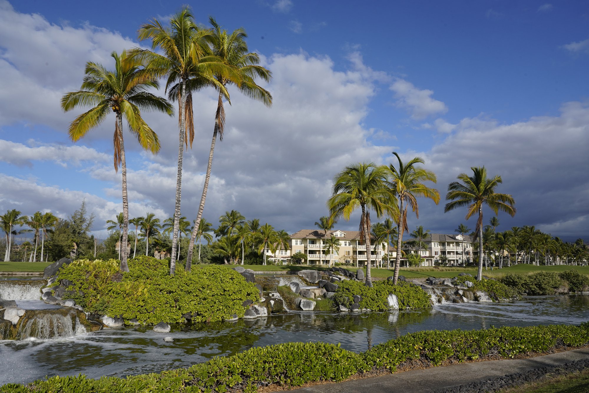 Künstliche Wasserfälle in einer der Lavalandschaft abgerungenen „Oase“, einer Wohlfühloase, für diejenigen, die das nötige Kleingeld dafür haben.