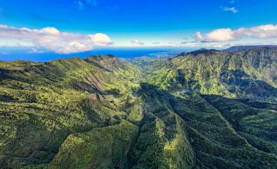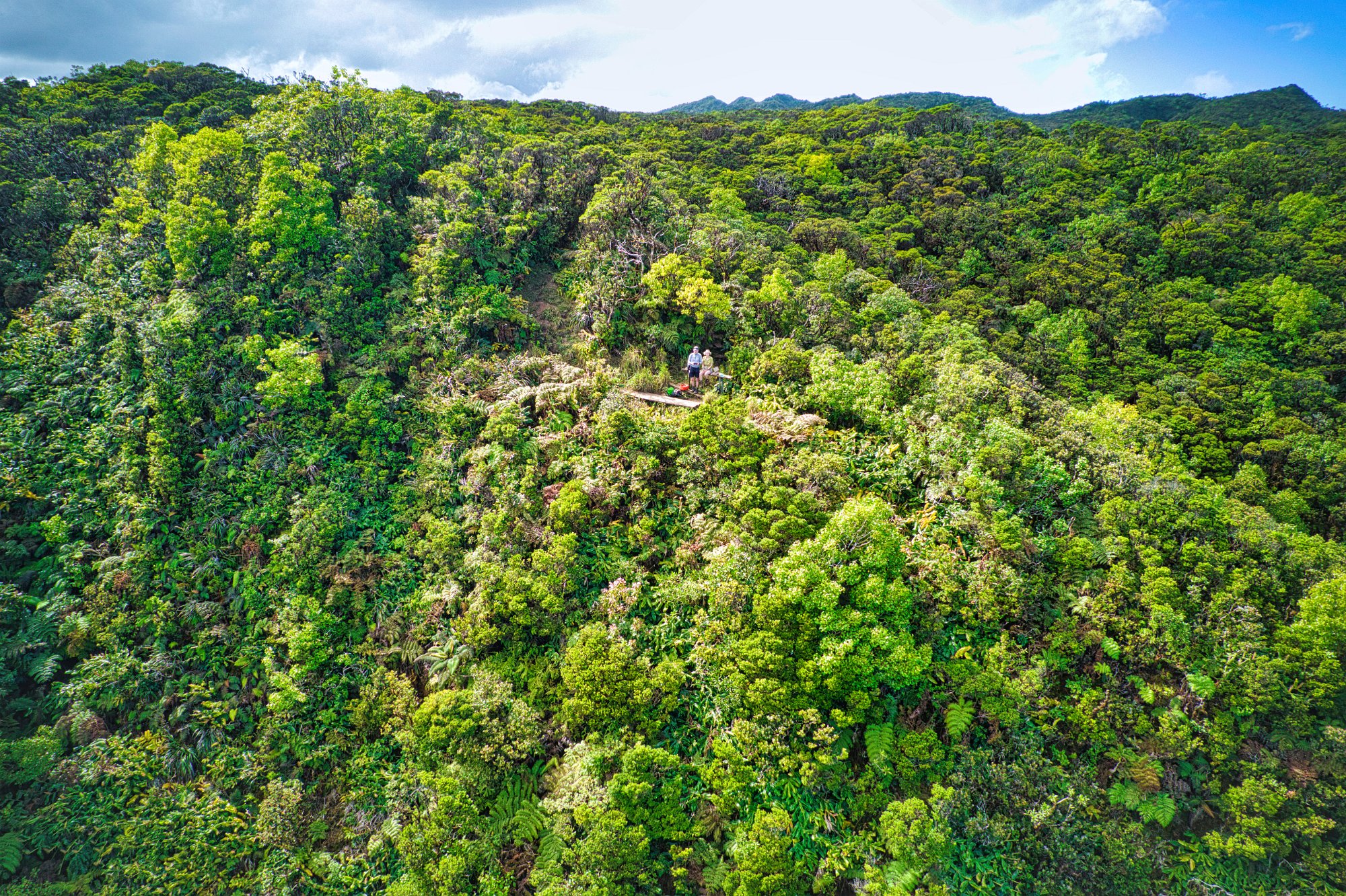 Die Bretter führten uns bergab, über einen Bach mussten wir die Steine zur Überquerung nutzen, dann ging es wieder bergauf. Ab und zu gab es Ausblicke in die Landschaft. Alles sehr wild und durchgängig bewaldet / bewachsen. Als wir die Anhöhe erreicht hatten liefen wir über die Stege und unter uns war eine Art Hochmoor, Sumpf. Hier gab es keine Bäume, hier hatte man einen freien Blick. Nach zweieinhalb Stunden hatten wir das Ziel erreicht den Outlook …. Ins berühmte …tal, wonach auch der berühmte Trail auf Kauai benannt ist. Der Pfad hörte einfach auf an der Kante die steil in das Tal abfiel und man hatte eine wirklich überwältigende Aussicht in das Tal und zum Meer. Toma machte Mittag (also Brotzeit), ich ließ die Drohne steigen. Startplatz waren zwei Bretter, viel Ebeneres gab es hier nicht.