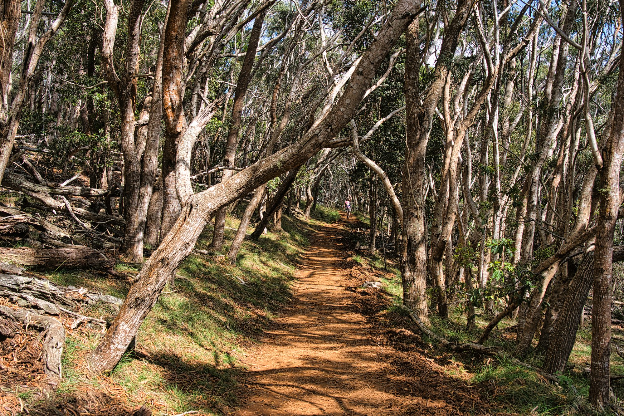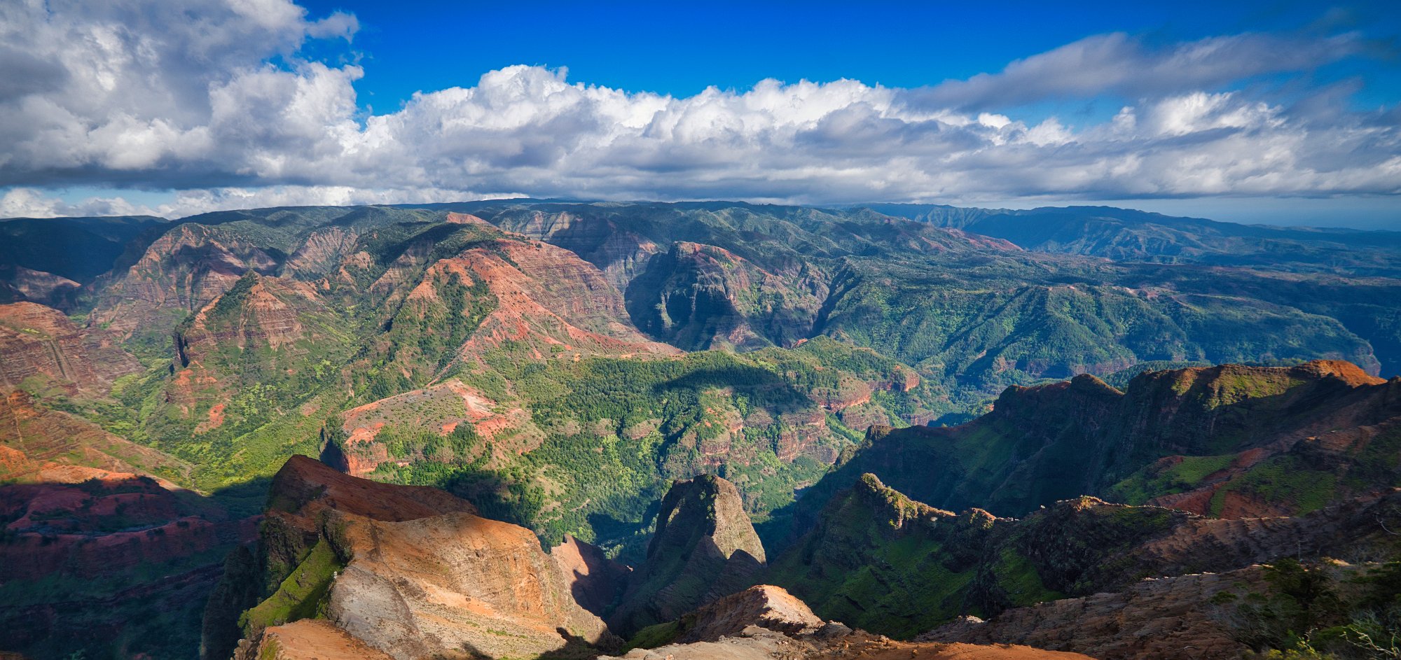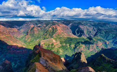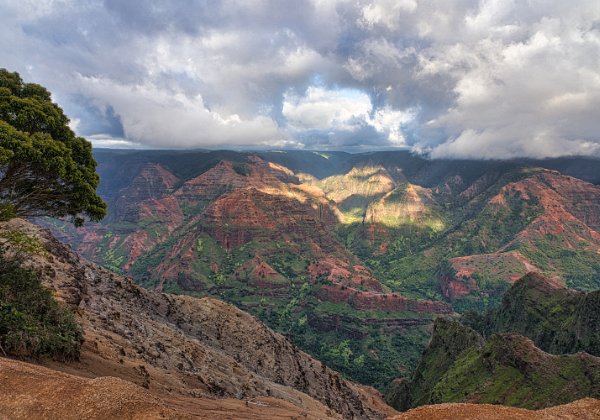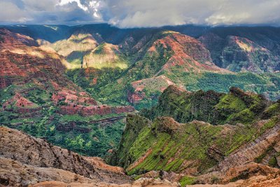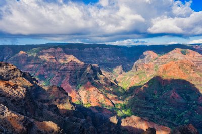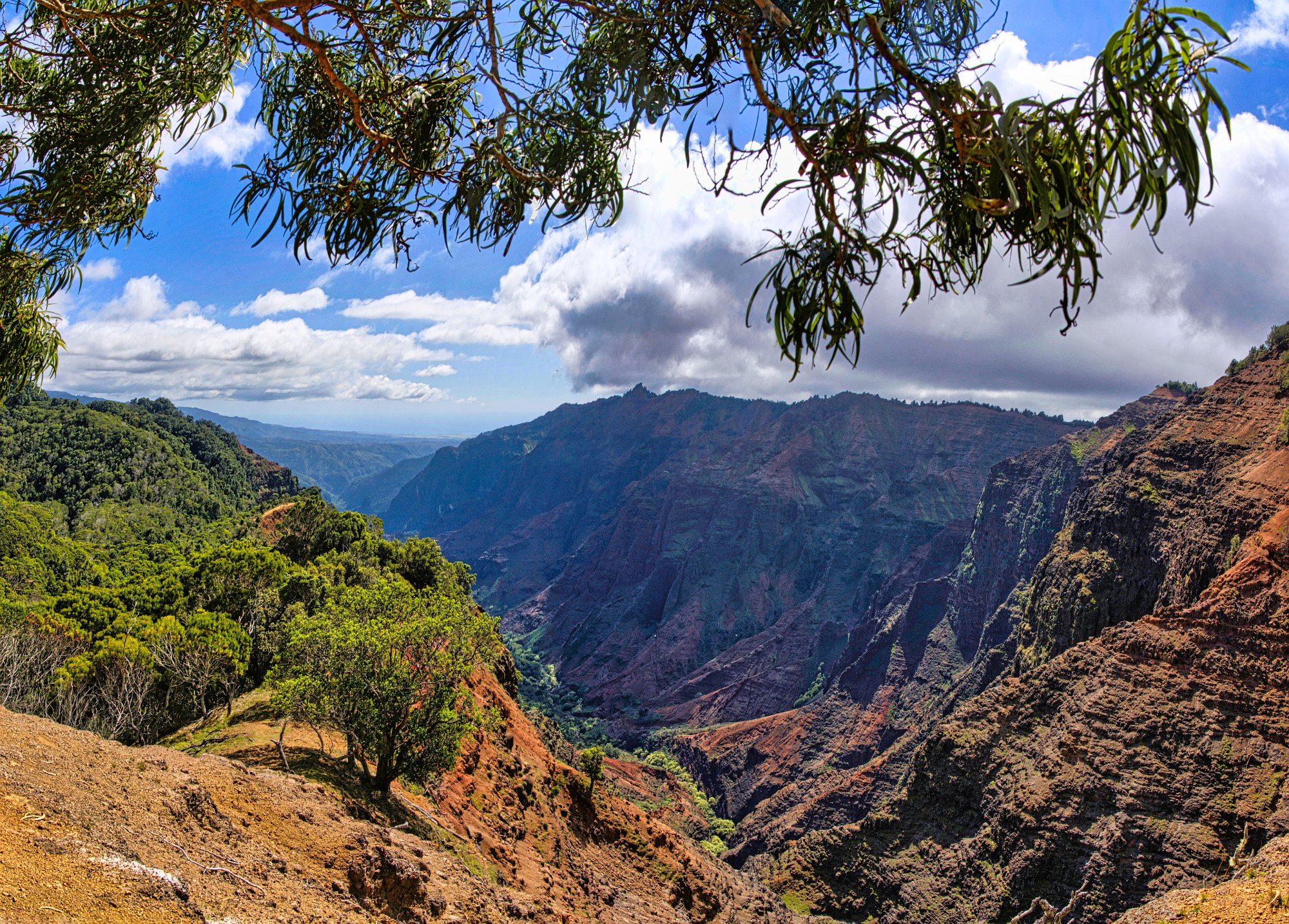 Der Rückweg war deutlich anstrengender, es ging immerhin bergauf. Auf dem Rückweg hielten wir noch einmal am Waimee-Lookout an. Da die Sonne immer noch recht hoch stand, war der Canyon gut ausgeleuchtet Manche Bereiche waren jedoch von den Wolkenschatten abgedunkelt, was schrille Kontraste ergab.