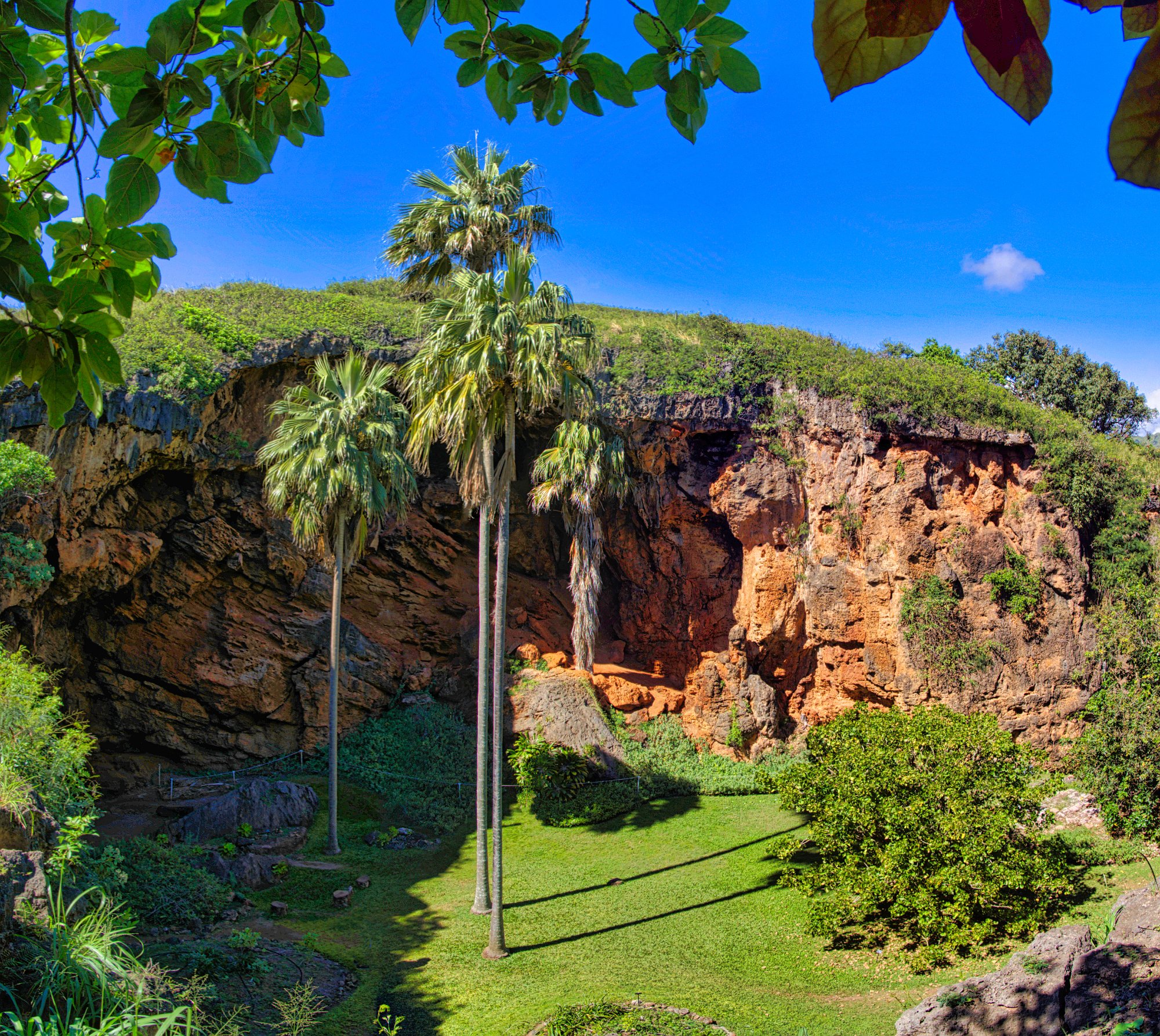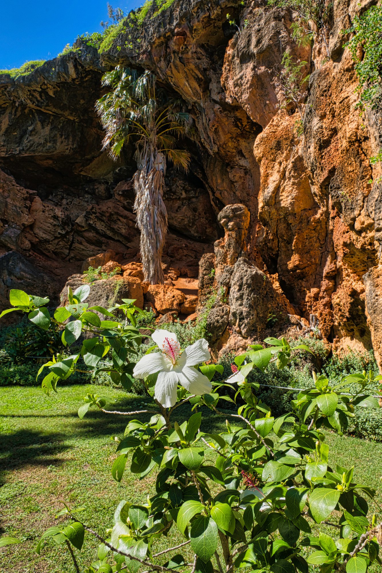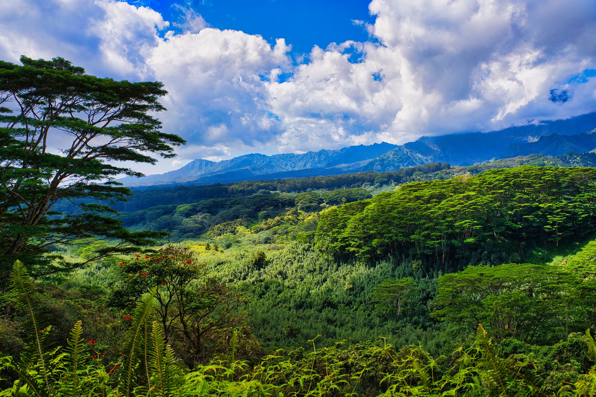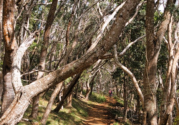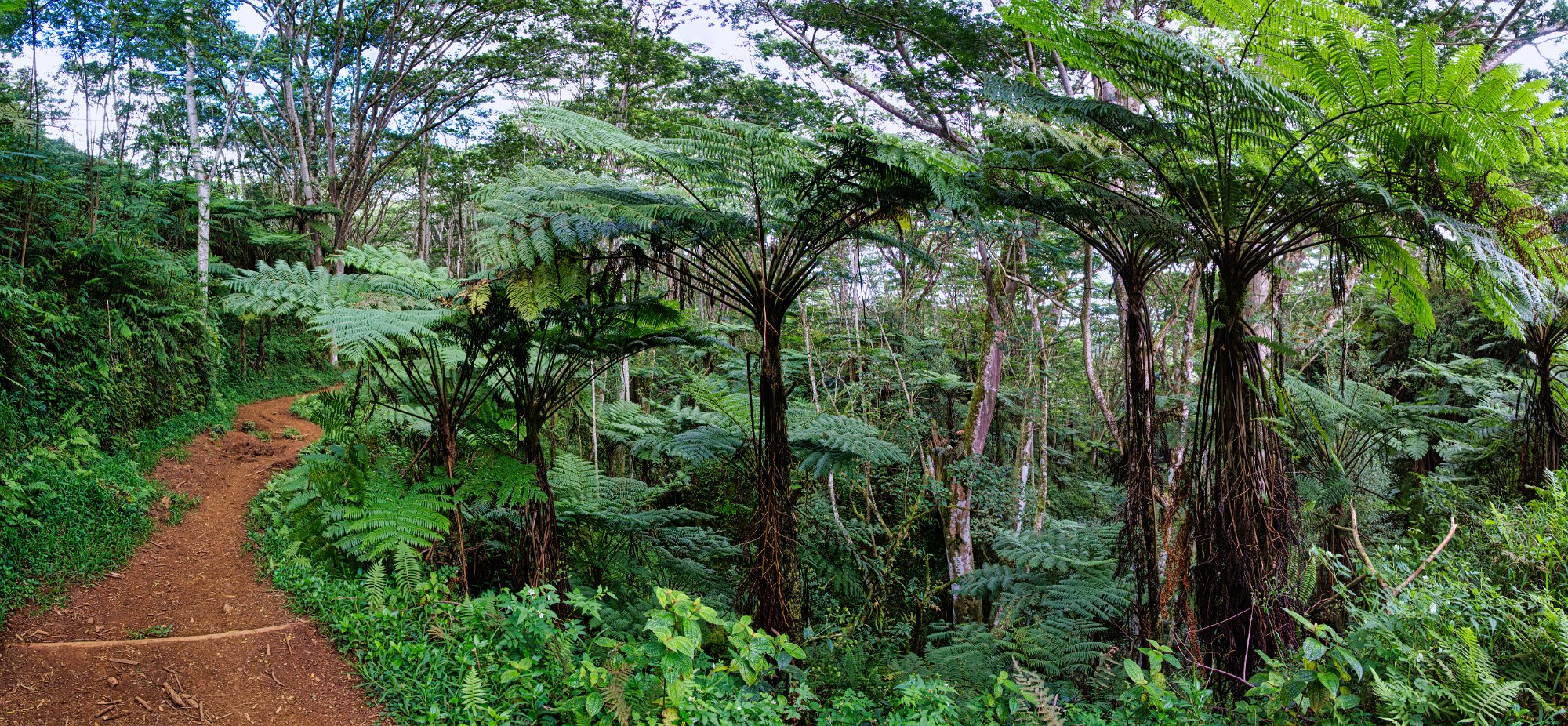 Die Vögel zwitscherten, die Sonne schien durch die Bäume, obwohl sich schon die ersten Wolken des Tages über den Bergkuppen zusammenzogen. Es war ja keine große Wanderung, 5,4 Kilometer hin und zurück, bei doch einigen Höhenmetern. Denn es ging stetig bergauf bis zu einem Picknickplatz, der leider besetzt war und wir uns entschieden Mittag auf dem Rückweg zu machen. Danach ging es leicht bergab in einen Talkessel, nicht allzu groß aber gefüllt mit dem Grün der Tropen. Was nicht grün war, war rot und blühte oder gelb. Die Baumfarne ragten aus dem Grün hervor.