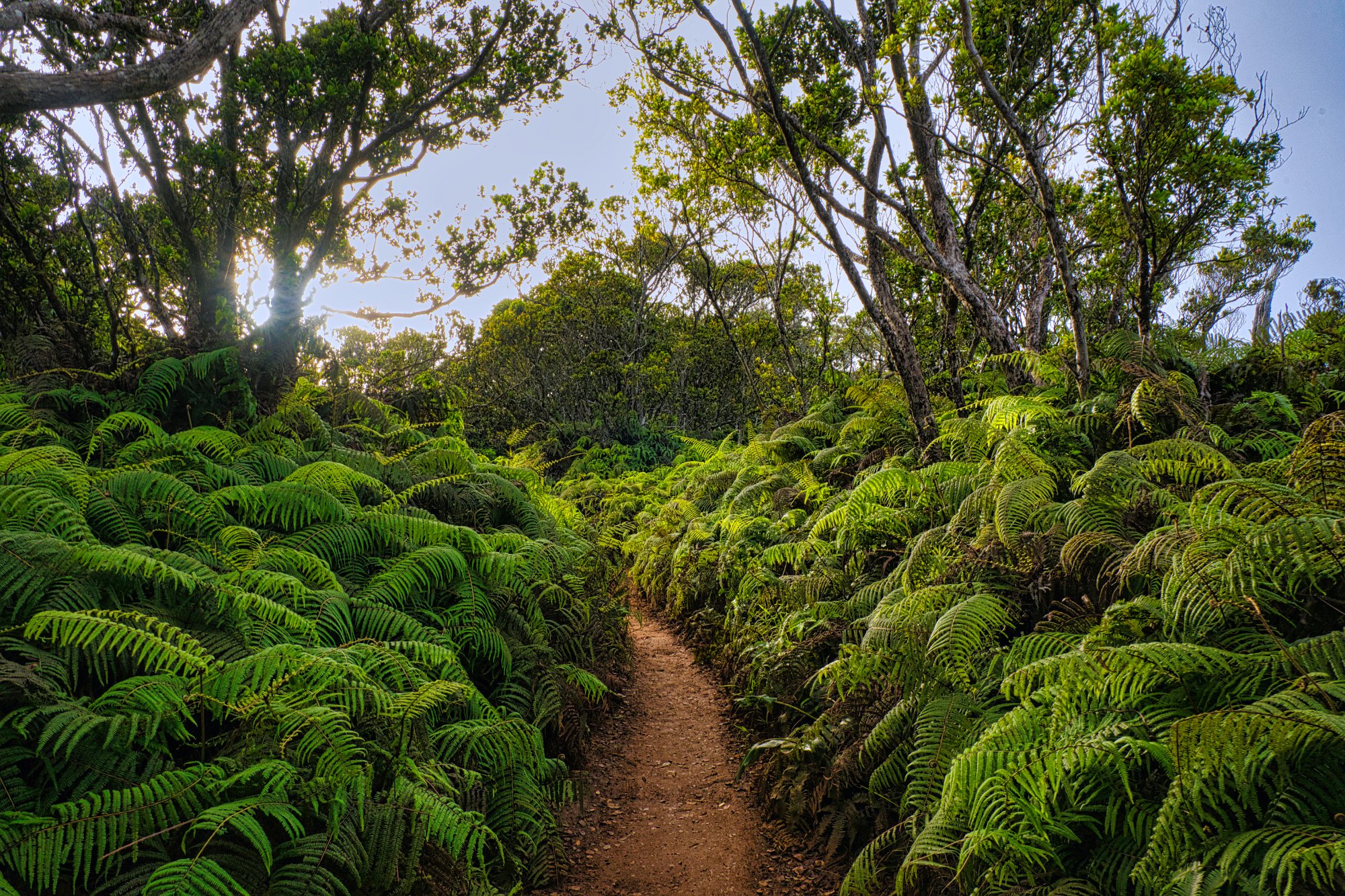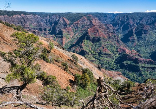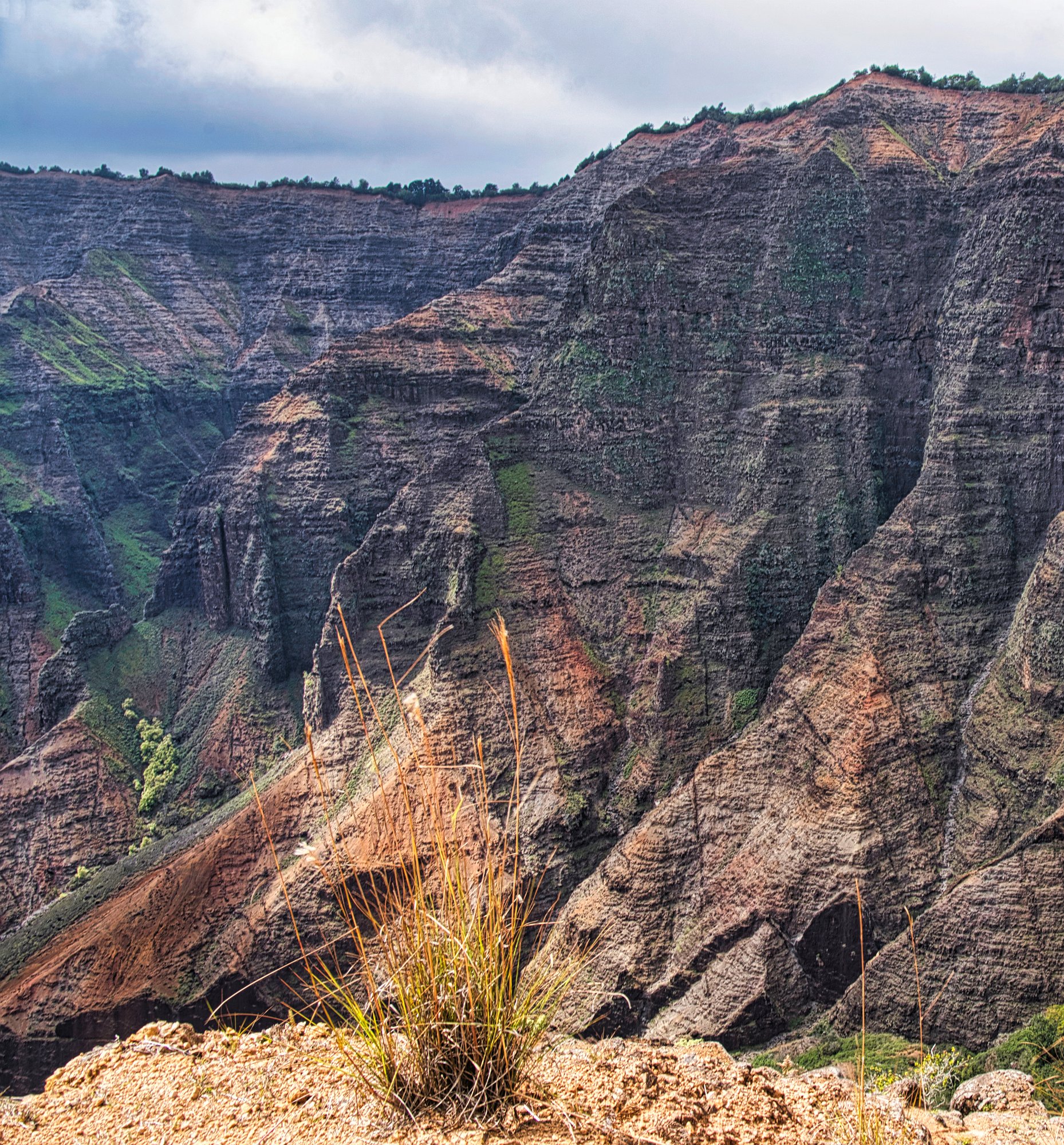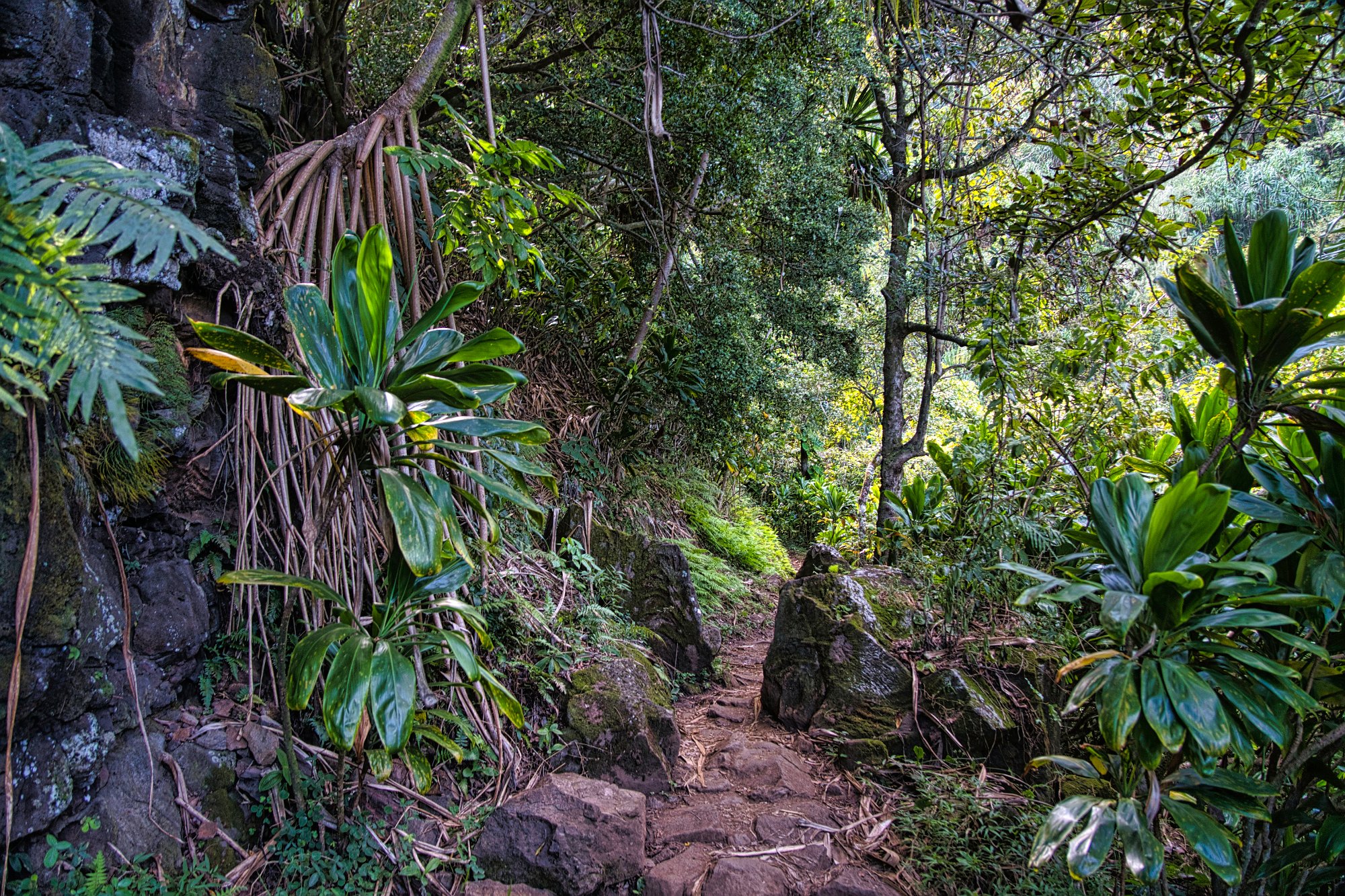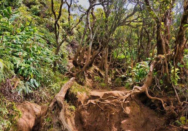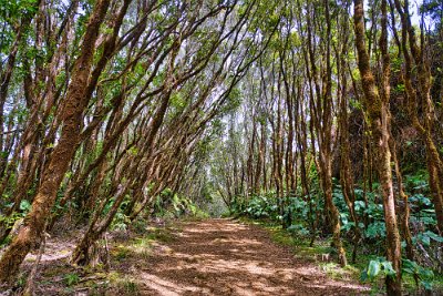 Wir bezahlten unseren Obolus von 20 $ am Automaten (man musste sogar die Autonummer eingeben) für Parken und Outlook und wanderten los. Es geht zuerst immer am Rand der Schlucht entlang (quasi auf dem Kamm). Der Weg ist zuerst breit und stark erodiert, wird dann schmaler, wahrscheinlich sind hier wesentlich weniger Leute gegangen. Man konnte ab und zu erahnen, was links unter uns lag, leider aber nicht richtig sehen. Wir liefen zuerst auf dem Pihea Trail. Das Wetter war sonnig, die Natur einfach schön. Moosbewachsenen Bäume bildeten ein Spalier und die Zwischenräume der Bäume wurden von Farnen ausgefüllt.