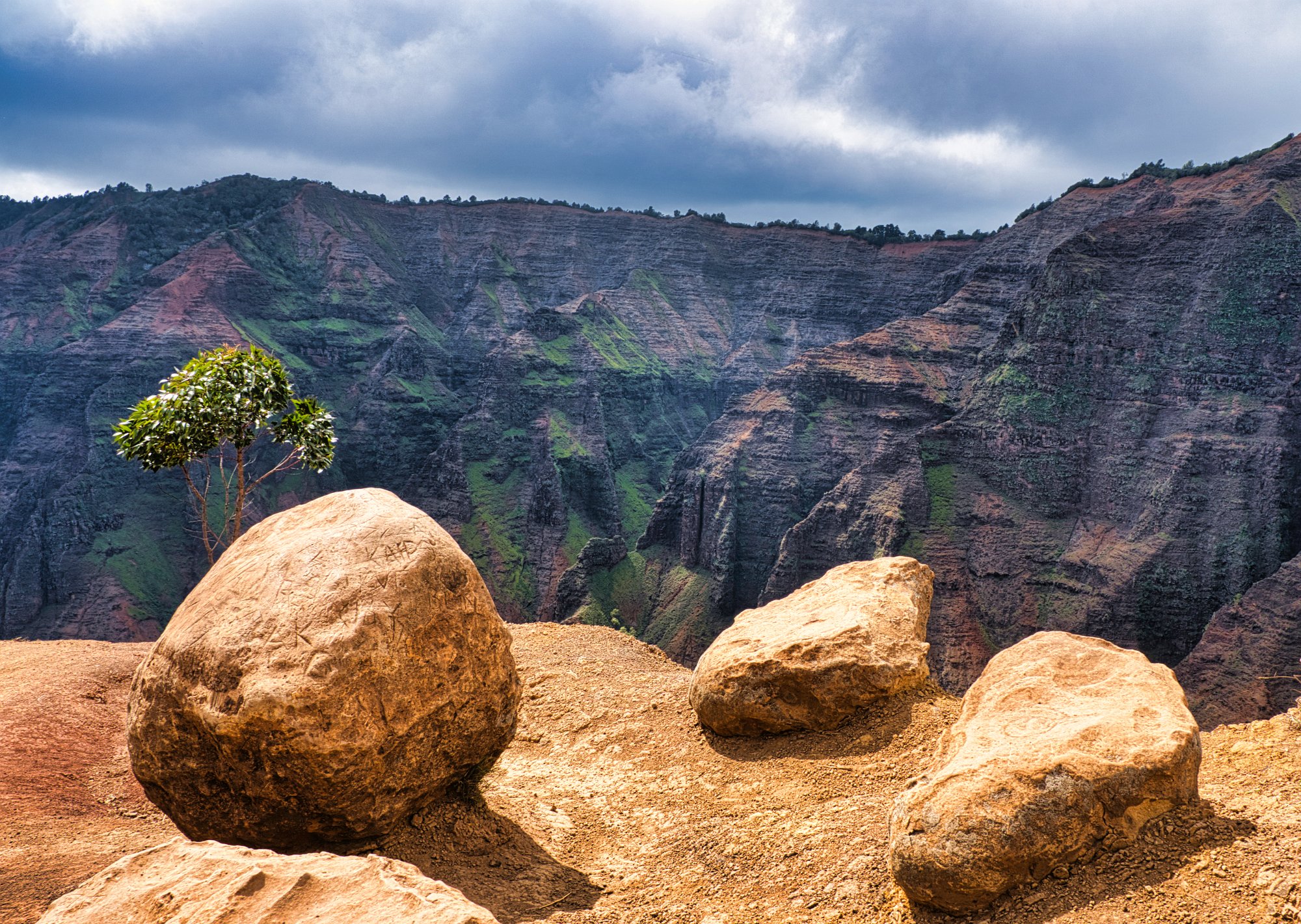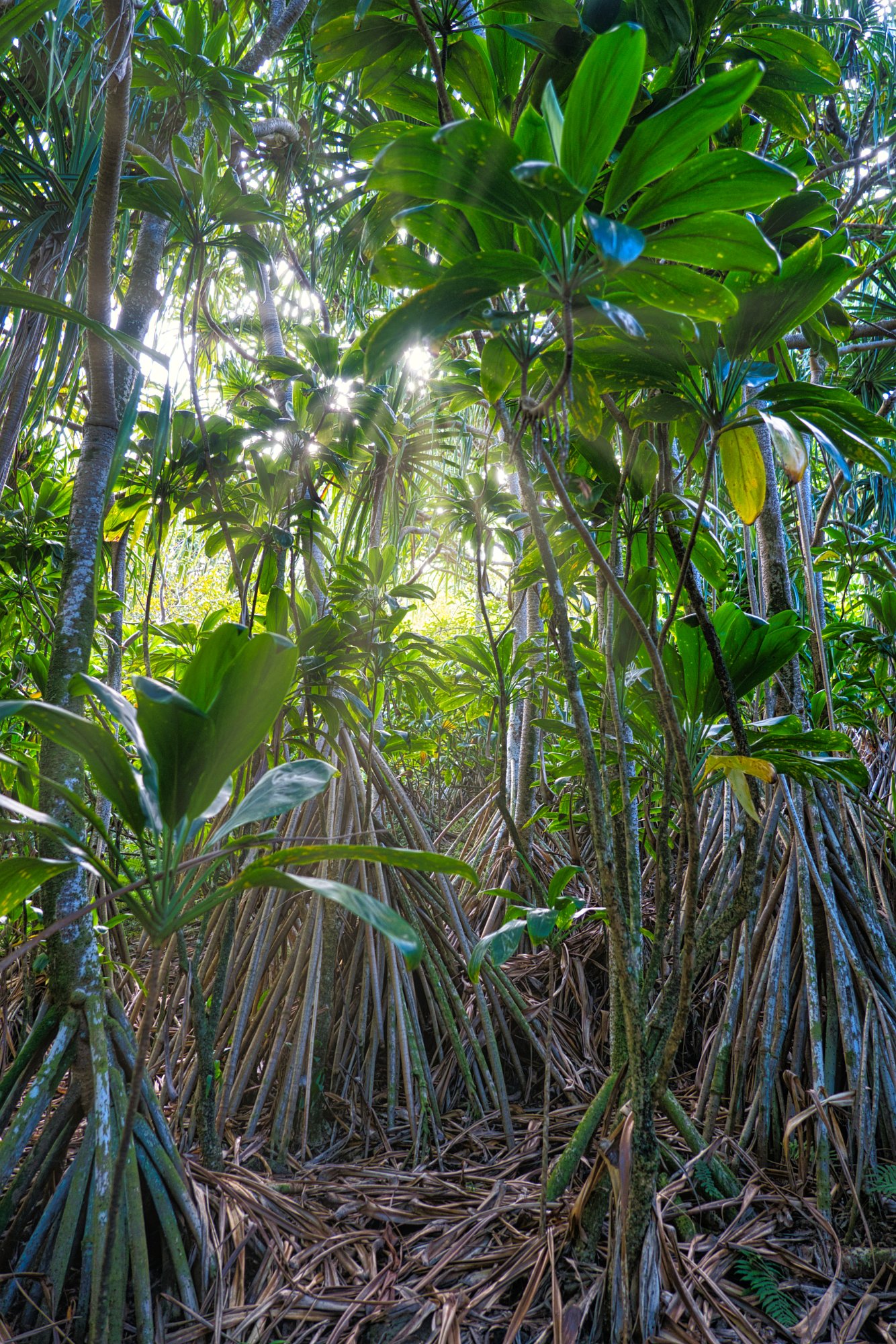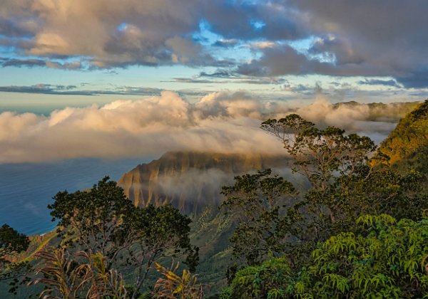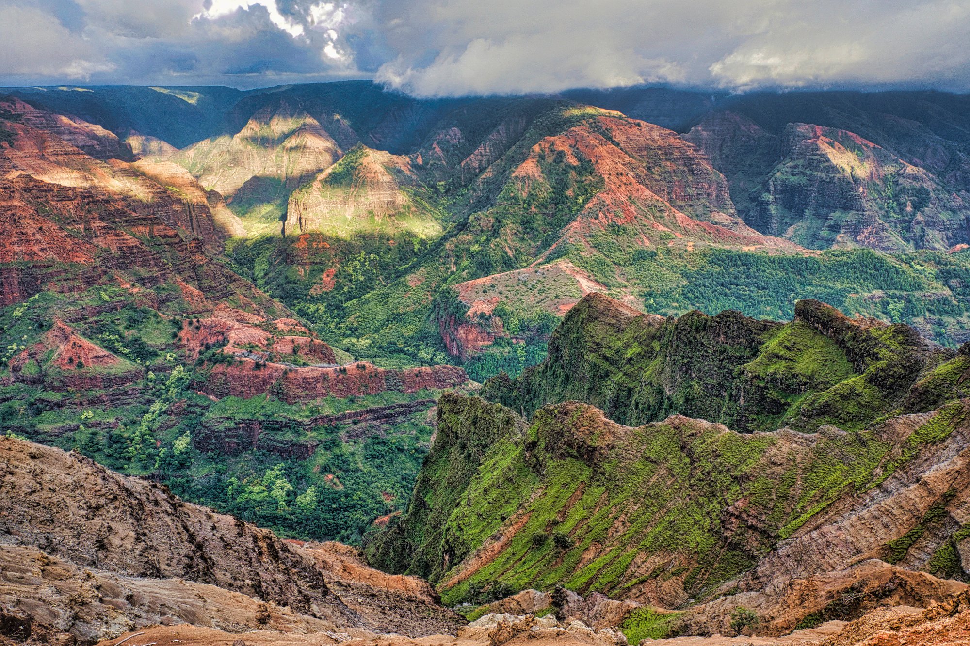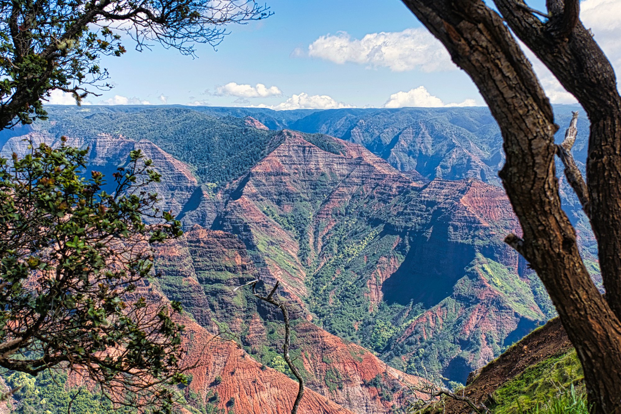 Wir bezahlten unseren Obolus von 20 $ am Automaten (man musste sogar die Autonummer eingeben) für Parken und Outlook und wanderten los. Es geht zuerst immer am Rand der Schlucht entlang (quasi auf dem Kamm). Der Weg ist zuerst breit und stark erodiert, wird dann schmaler, wahrscheinlich sind hier wesentlich weniger Leute gegangen. Man konnte ab und zu erahnen, was links unter uns lag, leider aber nicht richtig sehen. Wir liefen zuerst auf dem Pihea Trail. Das Wetter war sonnig, die Natur einfach schön. Moosbewachsenen Bäume bildeten ein Spalier und die Zwischenräume der Bäume wurden von Farnen ausgefüllt.