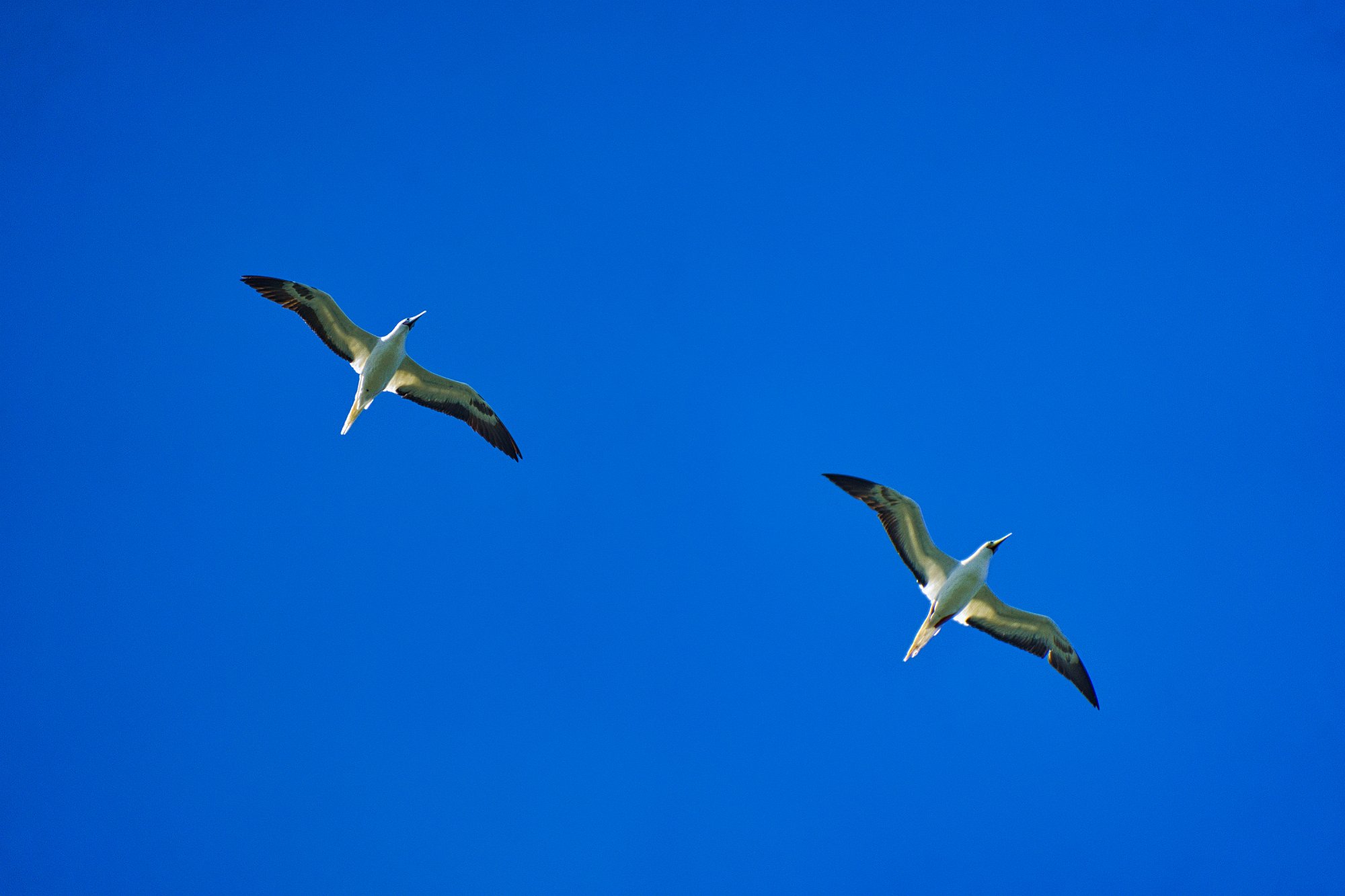 Die einheimische Bevölkerung vergnügt sich also im Wasser, wir laufen links an der Küste entlang und sehen über uns Seevögel. Es sind Rotfuß-Bubbies und Fregattvögel, die die Thermik perfekt ausnutzen und bei den Fregattvögeln denkt man manchmal, als würden sie an einer Stelle stehen und nur die Flügel dem Wind entgegenstellen, sodass sie in der Luft bleiben. Beide Arten sind ja bekannt, dass sie warten, bis einer etwas gefangen hat und ihm dann die Beute abnehmen. Sogar die Materialien für den Nestbau gönnen sie sich gegenseitig nicht und attackieren einander, um es dem anderen streitig zu machen.