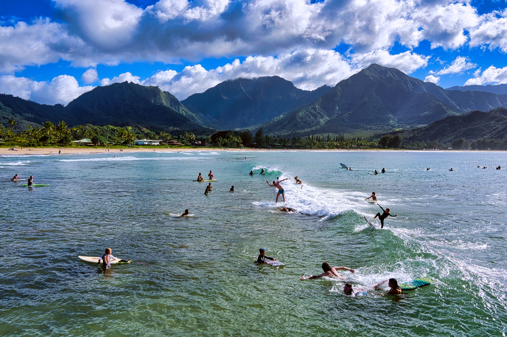 Dort wo die Palmen in der Ferne zu sehen waren, dort war auch der nächste Strand, in einer kleinen verträumten – na Stadt kann man wohl nicht sagen, vielleicht in einem romantischen Badeort. Die Parkplätze und es war das erste Mal auf der / den Inseln, dass reichlich Parkplätze vorhanden waren, waren voll. Hier tobte der Bär. Der Strand war malerisch, Palmen, schöner Sand, klares Wasser, nicht allzu große Wellen, wo Kinder und Urlauber ihre ersten Versuche mit den Surfbrettern unternahmen.