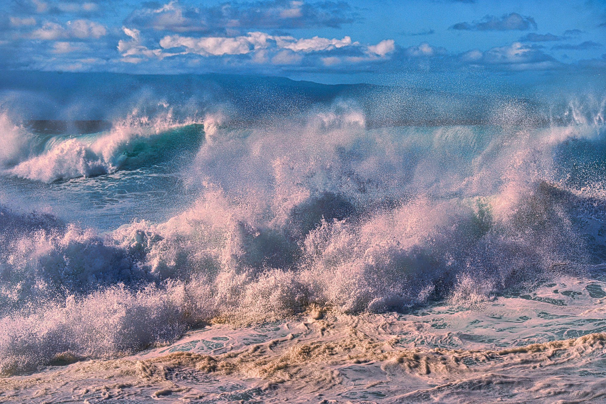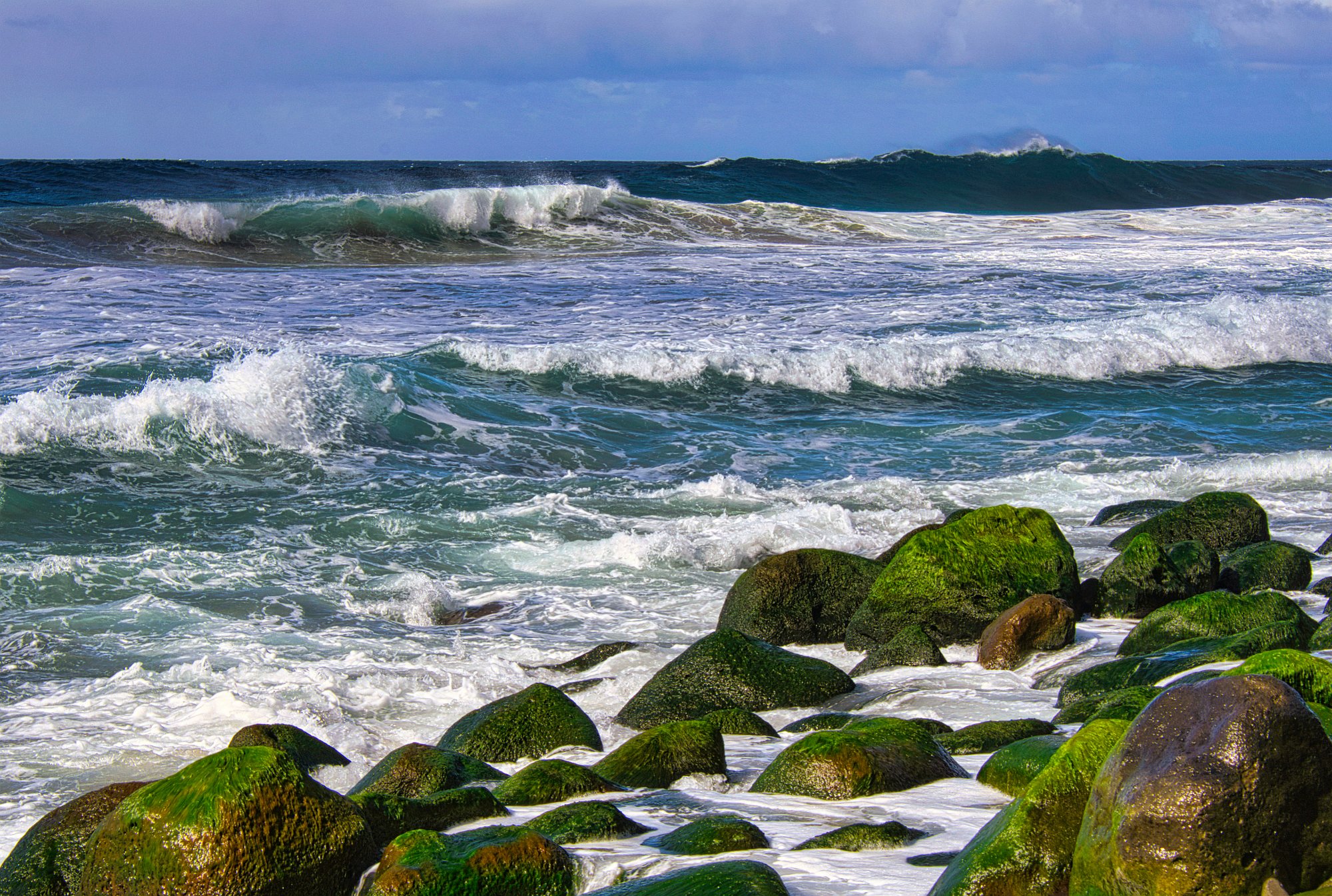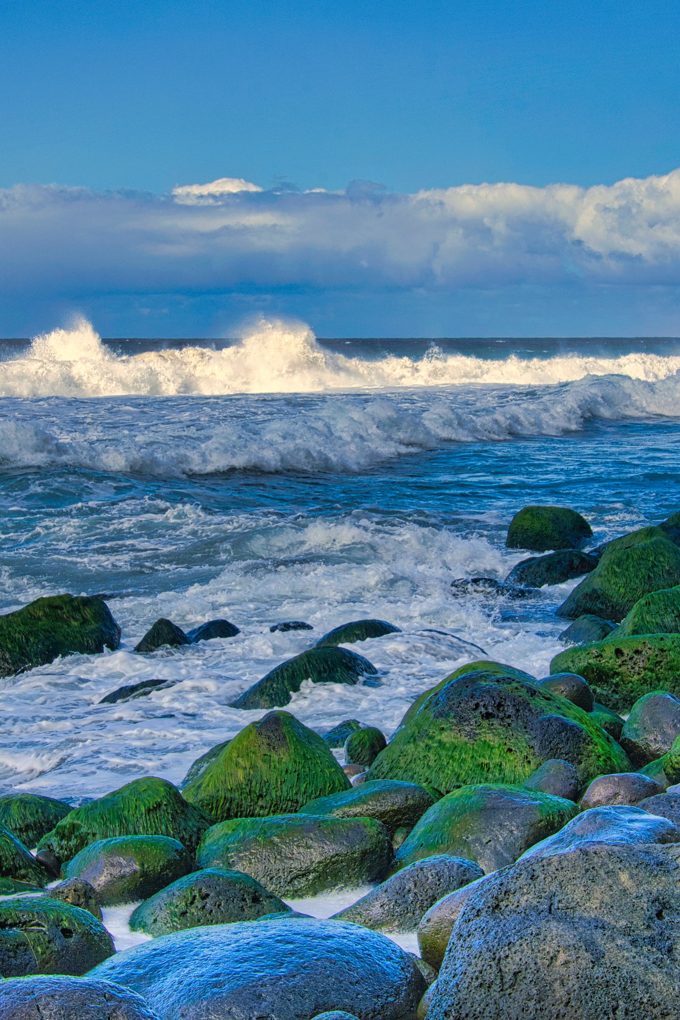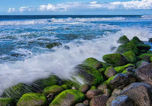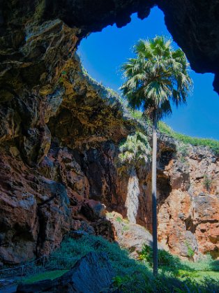 Das Meer ist schon ganz schön wild hier. Wir haben den Sandstrand verlassen und gehen auf Lavafelsen unterhalb der Steilküste bis zur Spitze der Halbinsel. Wenige Meter zu unserer rechten Seite brechen die Wellen an den Felsen und hohe Gichtberge spritzen in die Luft. Es gibt auch ein Blowhole, was aber nur schwappt und kaum bläst. Reingeraten möchte man dort aber nicht. Kleine Kletterpassagen würzen den Weg. An der Spitze der Halbinsel sind die Wellen besonders hoch. Toma wird es unheimlich und sie geht zurück. Ich verweile noch etwa eine halbe Stunde und mache Bilder von den hohen Gichtbergen, die sich bei besonders großen Wellen in wenigen Metern Entfernung auftürmen. Man spürt hier die Urgewalt des Wassers ganz unmittelbar.