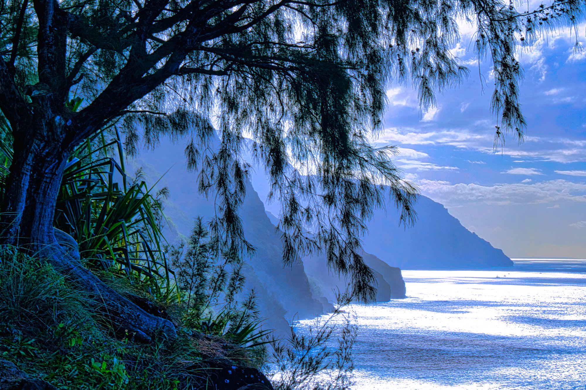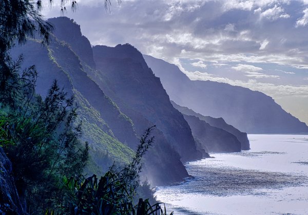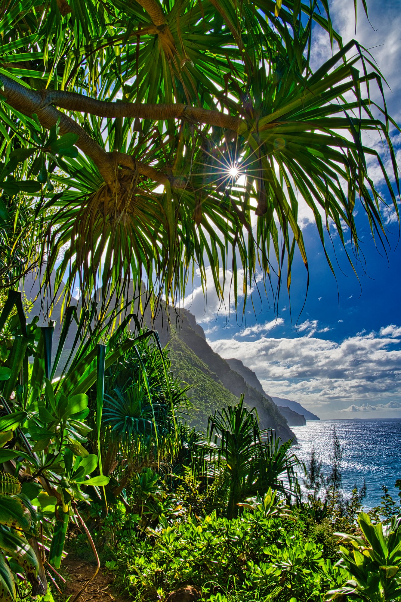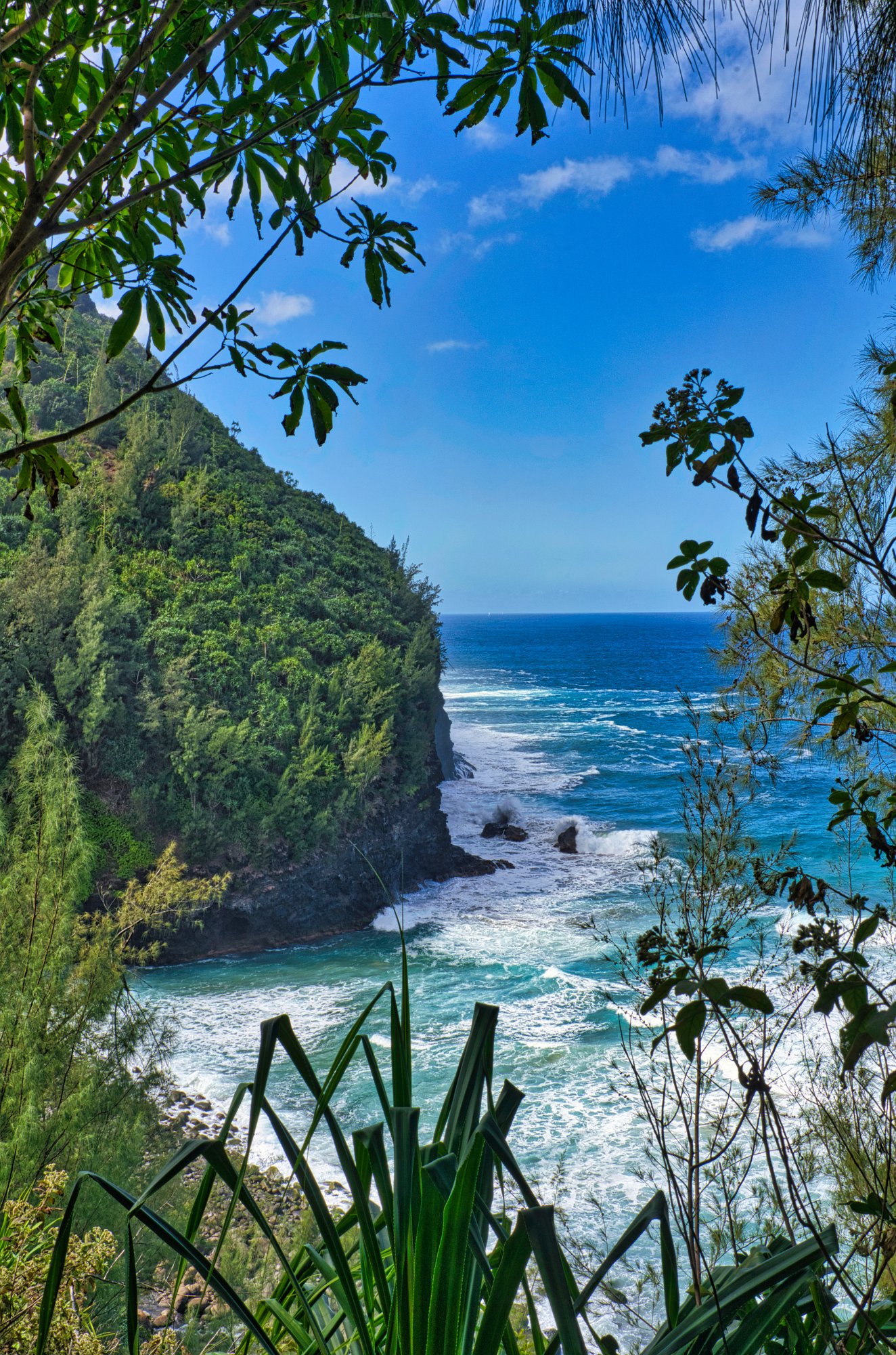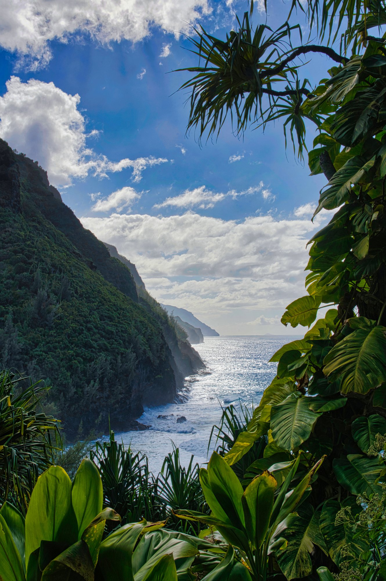 Die Sonne hatte es jetzt auch geschafft und stand über dem Meer und strahlte die Napaliküste an. Die Blicke nach oben in die Berge waren auf dem Rückweg besser. Unter uns das Meer, das toste. Es war wirklich laut. Es donnerte, wenn sich die Wellen an der Küste brachen. Die Farben sehr intensiv. Das Blau des Himmels und des Wassers, mit weißem Schaum und dem üppigen Grün im Vordergrund. Paradiesisch.