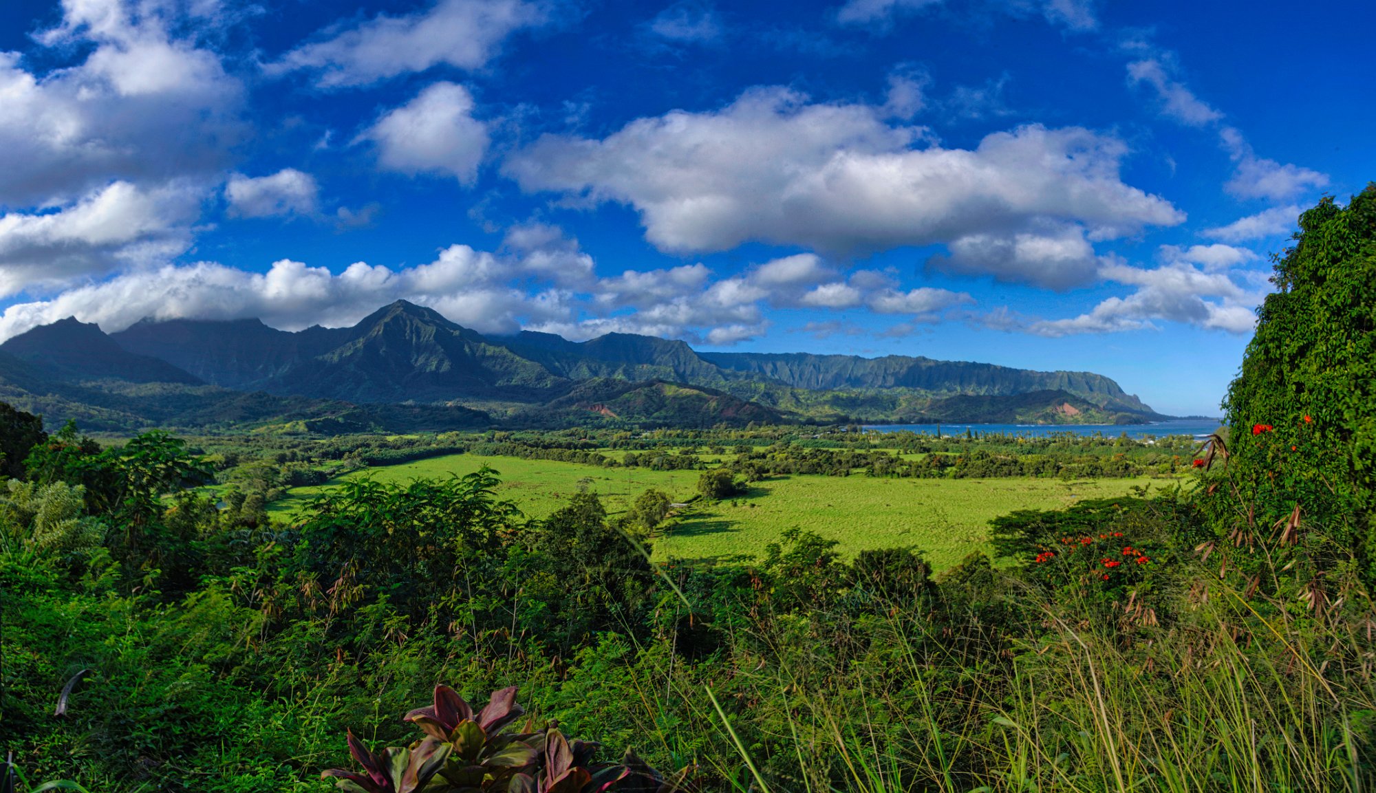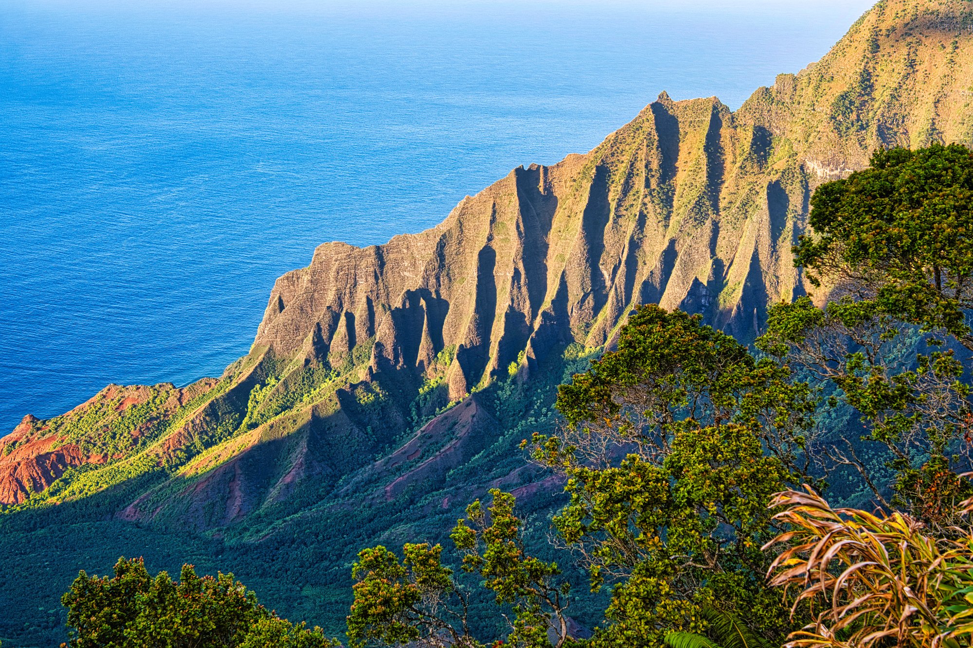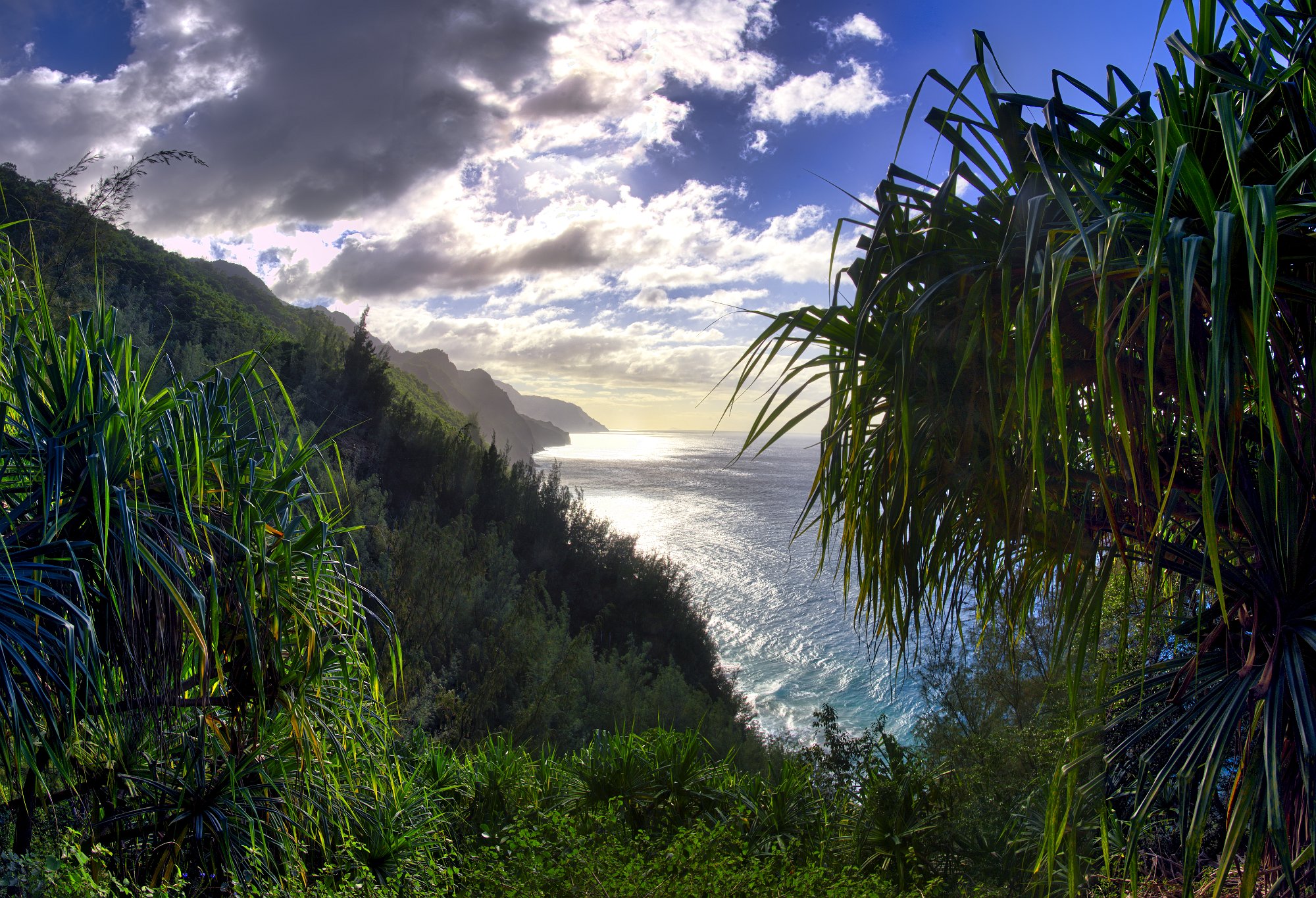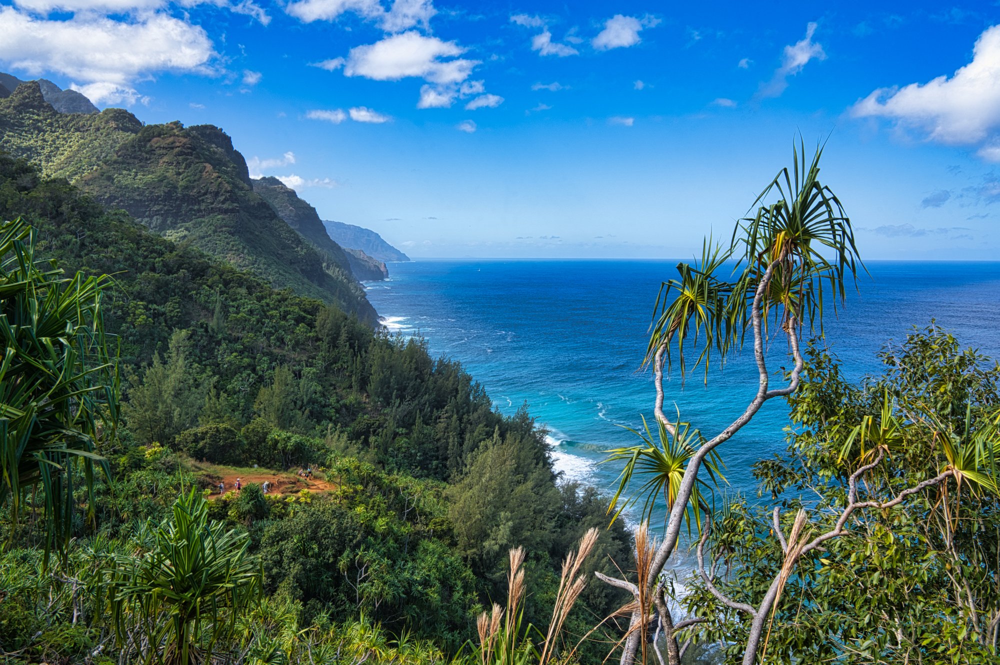 Die Sonne hatte es jetzt auch geschafft und stand über dem Meer und strahlte die Napaliküste an. Die Blicke nach oben in die Berge waren auf dem Rückweg besser. Unter uns das Meer, das toste. Es war wirklich laut. Es donnerte, wenn sich die Wellen an der Küste brachen. Die Farben sehr intensiv. Das Blau des Himmels und des Wassers, mit weißem Schaum und dem üppigen Grün im Vordergrund. Paradiesisch.