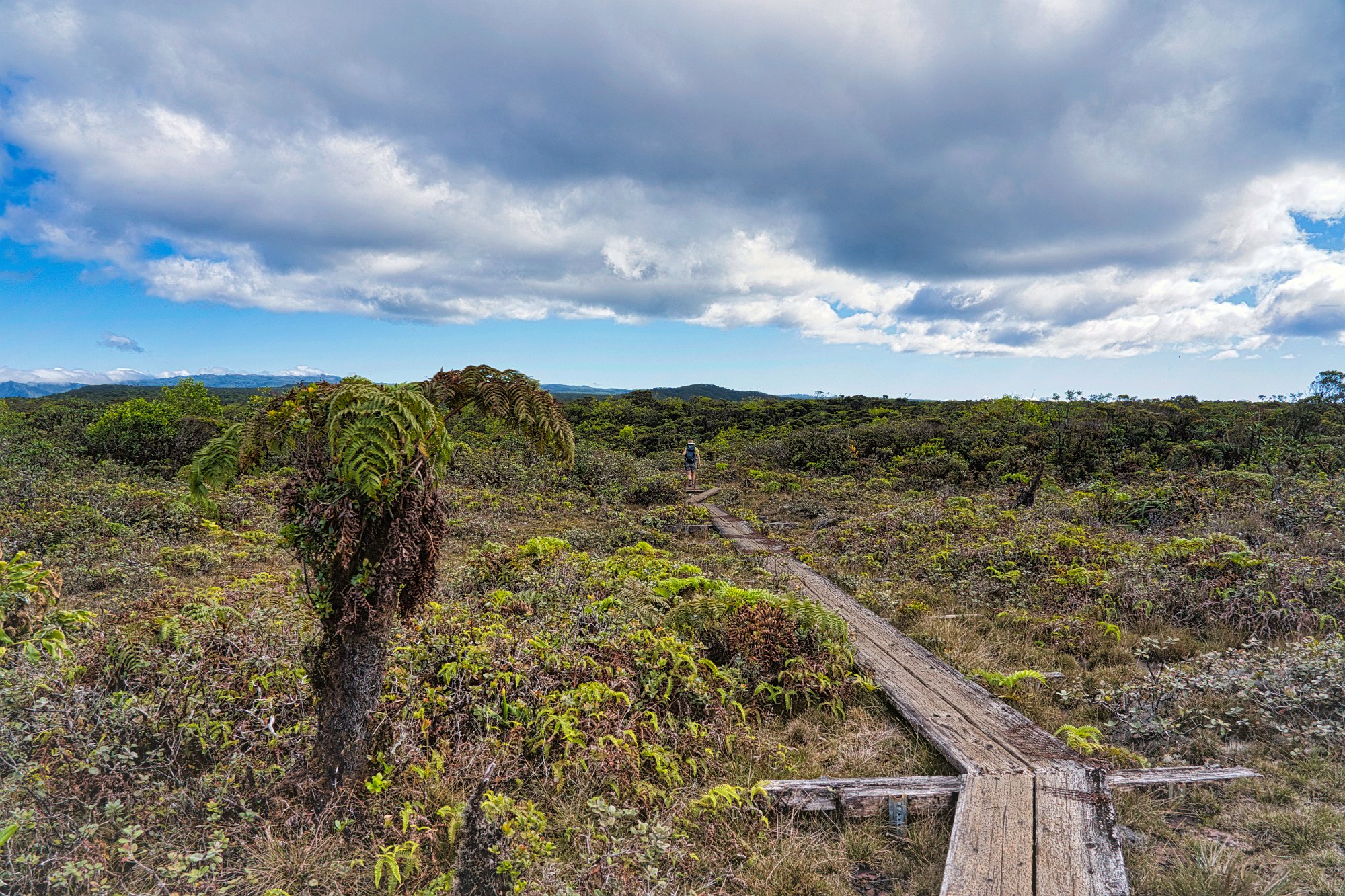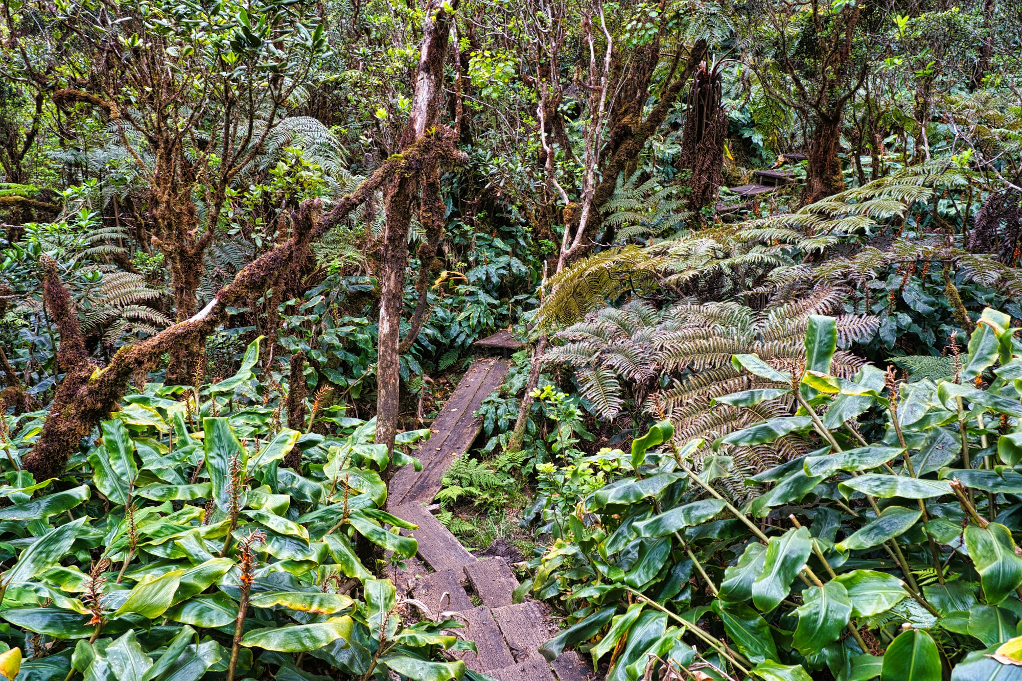 Der Pfad war fast durchgängig mit Brettern ausgelegt, mal sehr alte morsche, dann wieder sehr neue Hartholzpress-Bretter. Man musste mächtig aufpassen, da die Bretter nicht immer gut befestigt waren. Aber auf den neuen Brettern ließ sich sehr gut laufen. Links und rechts des Trails waren Blumen, Farne, viel Grün, dass auch ab und an den Pfad überwucherte. (Was sich bei kurzen Hosen nicht so gut machte. Unsere Beine waren am Ende des Tages ziemlich zerkratzt.)
