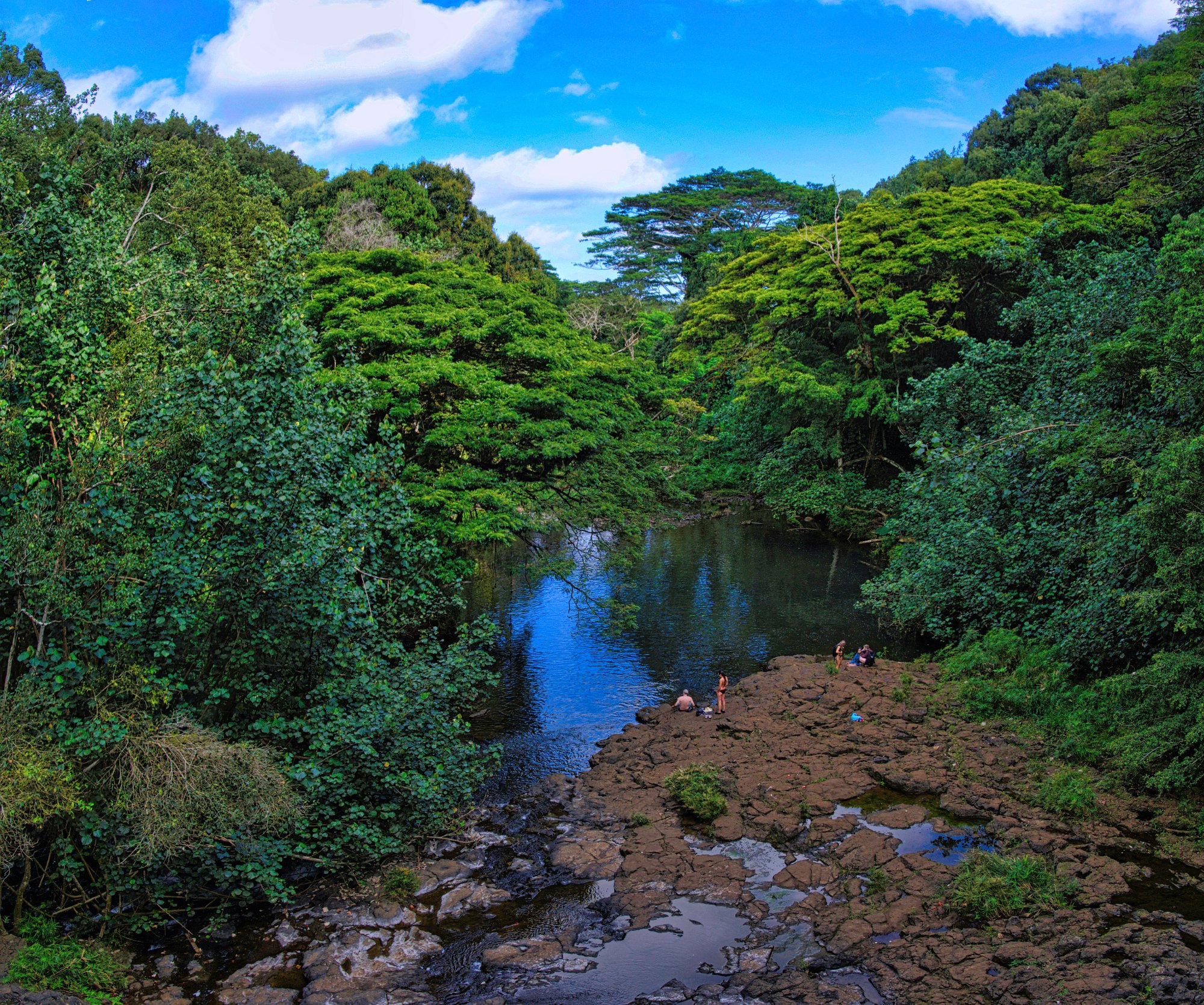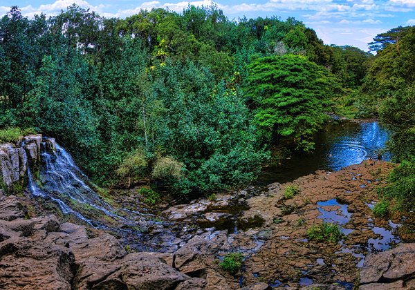 Als wir dachten, wir hätten die Wasserfälle erreicht und uns schon auf dem Rückweg machen wollten, nach dem obligatorischen Foto und doch ein wenig enttäuscht waren, sprach Toma Amis an und wollte wissen, ob es noch einen weiteren Wasserfall gab. Es sollten doch die bekannten Waimee-Fälle sein. Obwohl ich vermutet hatte, dass wir eh nur oberhalb der Fälle sein werden, war es aber trotzdem enttäuschend. Als wir dann die zweiten Fälle entdeckten, die schon ein wenig eindrucksvoller waren, befanden wir uns genau an der Stelle, wo das Wasser beginnt in die Tiefe herabzustürzen.