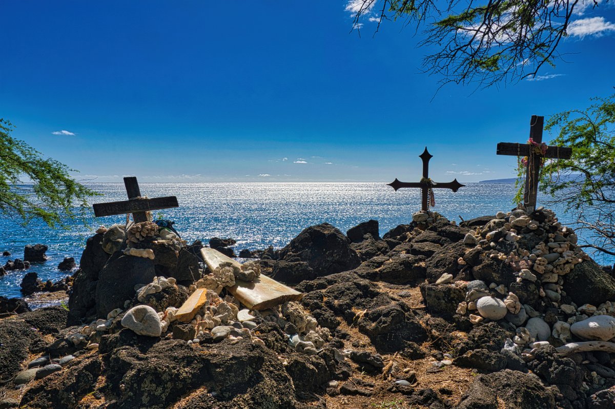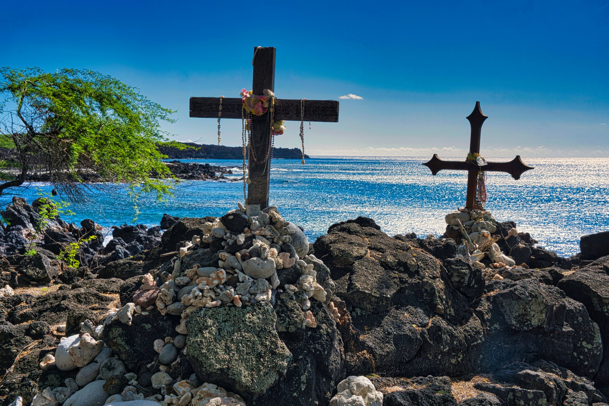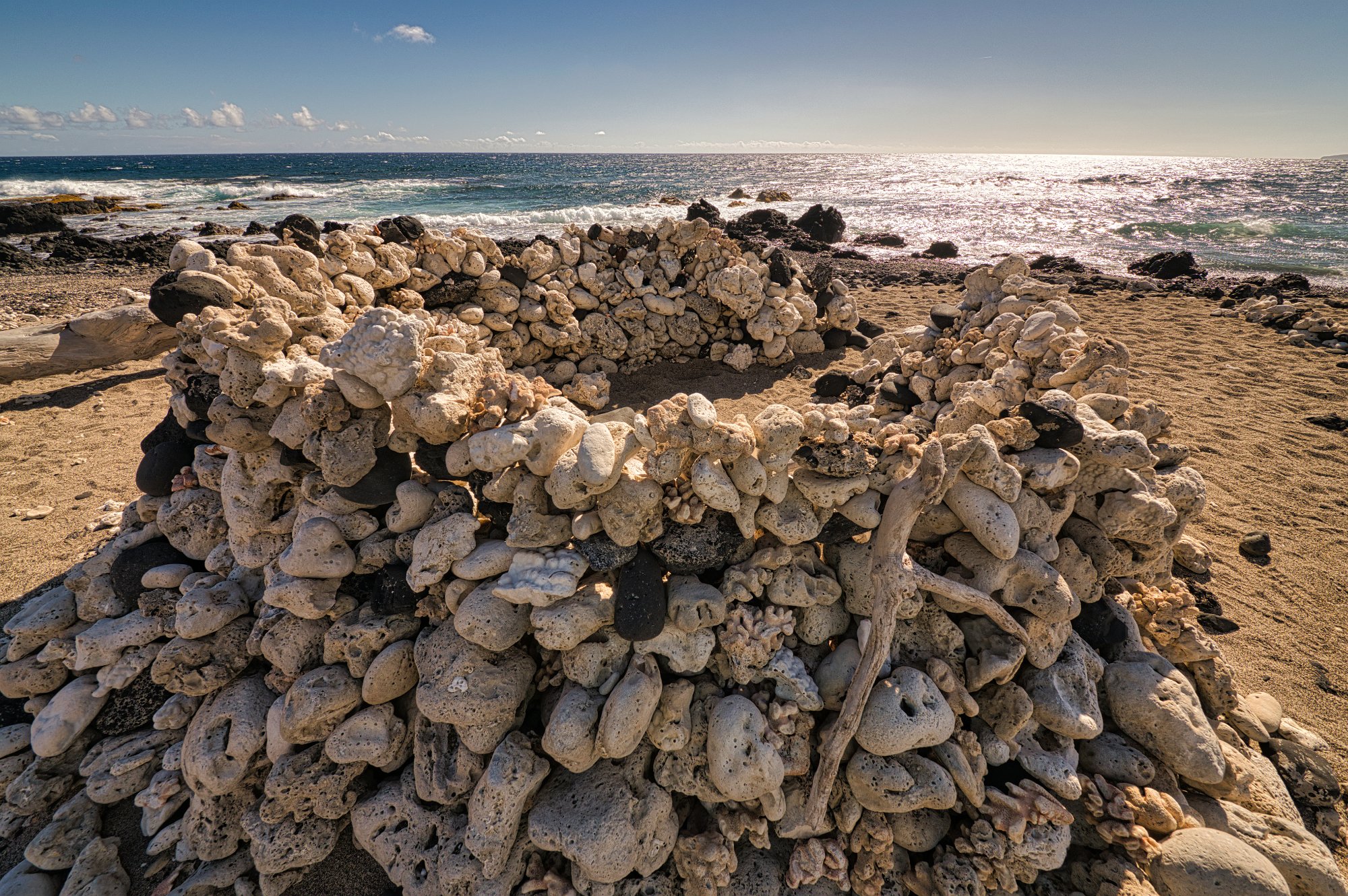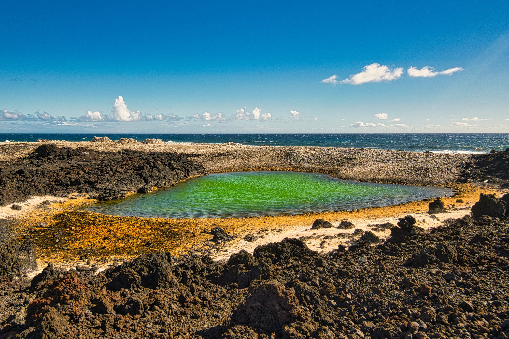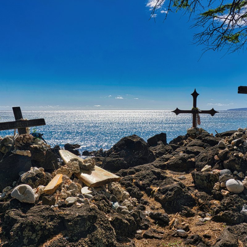 Nach dem Wäldchen ging es nun nur noch unter der gleißenden Sonne durch das Lavafeld. Es war schweißtreibend. Nach rund 50 Minuten waren wir am Leuchtfeuer. Unterhalb des Leuchtfeuers war ein kleiner See, grün und gelb schimmern, mitten in schwarzer Lava und am Rand gesäumt von weißen Steinen, wahrscheinlich Korallen in der Form eines Herzens. Sehr imposant. Wo die Lava auf das Meer traf wahren Hawaiianische Kultstätten, so eine Art Kreiswall aus weißen Steinen, zu einer Seite offen, mit Korallen und anderen Dingen wie Muscheln, … verziert. Die Bedeutung erschloss sich uns nicht.