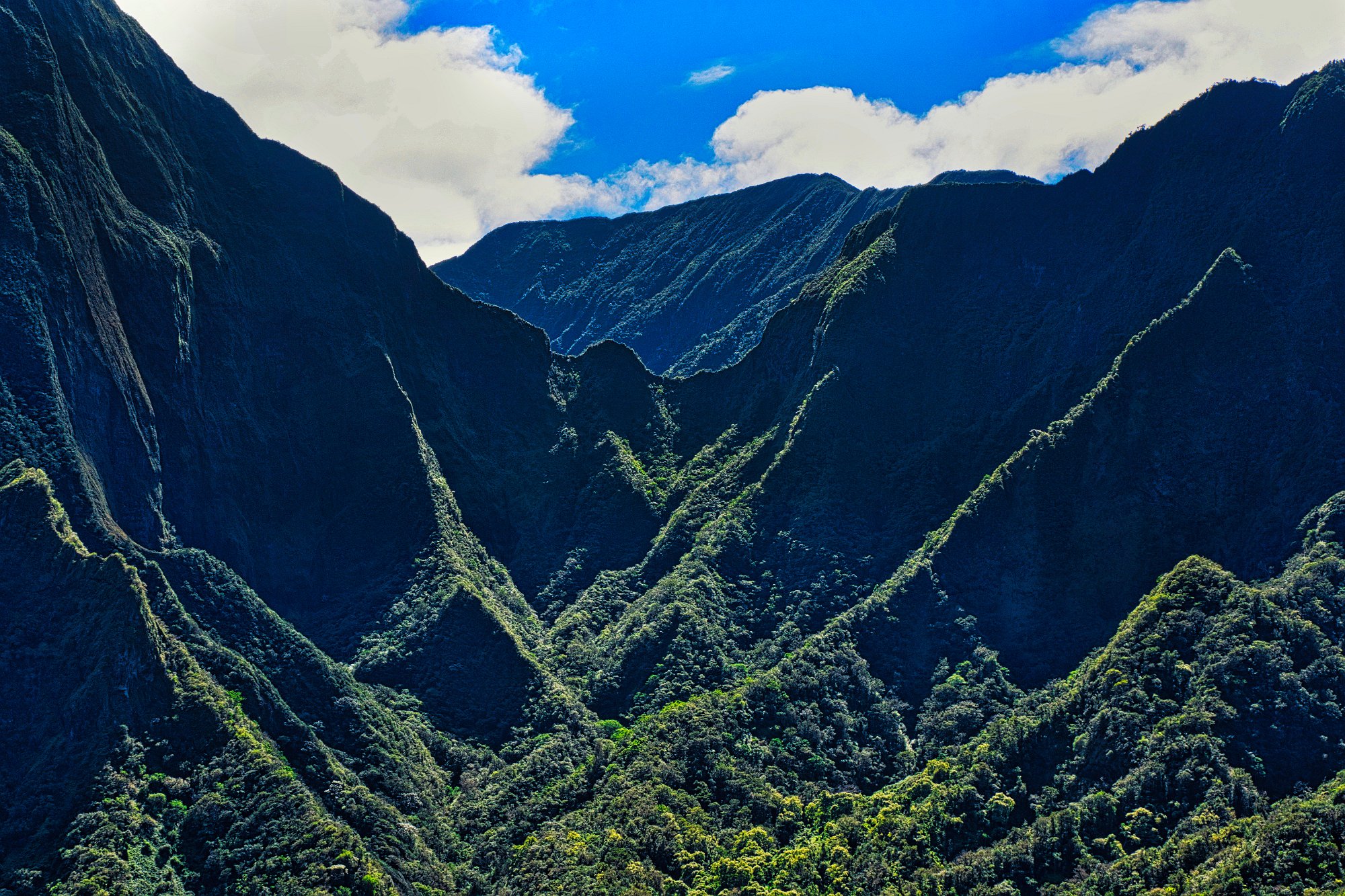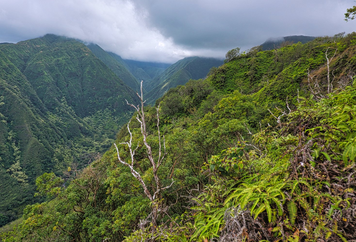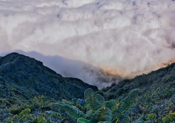 Bereits vom Parkplatz hatte man einen schönen Blick hinunter aufs Meer. Über den Bergen hingen die Wolken, doch hier unten schien noch die Sonne. Nach 80 Meter Aufstieg auf einer landwirtschaftlichen Straße betraten wir Waldgebiet. Es duftete, nach Currie oder Maggi. Der gesamte Weg war etwa 6 km, also 3 km und 400 Höhenmeter bergauf und 3 bergab. Wenn der Wald aus Nadelhölzern, großen… bestand, dann aus Eukalyptusbäumen, so war die Vegetation, als wir den Wald verließen, doch exotischer. Am ersten Lookout konnten wir in das Tal hinunterschauen, das von der Bergflanke, auf der wir uns gerade befanden, begrenzt wurde. Sehr grün, üppiges Grün und von ziemlich weit unten schwang sich ein Tropikvogel, die Thermik gekonnt ausnutzend bis in die höchsten Höhen, Ich hoffe, dass wenigsten ein Bild scharf genug ist. Wir kamen schon ins Schwitzen, obwohl es heute bedeutend angenehmer war zu gehen als gestern durch die Lavafelder. Schöne Ausblicke Richtung Meer und in das Tal zu unserer Rechten, über mangelnde Motive konnte man sich nicht beklagen. Der Gipfel bzw. der höchste Punkt des Trails war in den Wolken und ein feiner Nieselregen kühlte den Körper, der bergauf doch heiß gelaufen war.