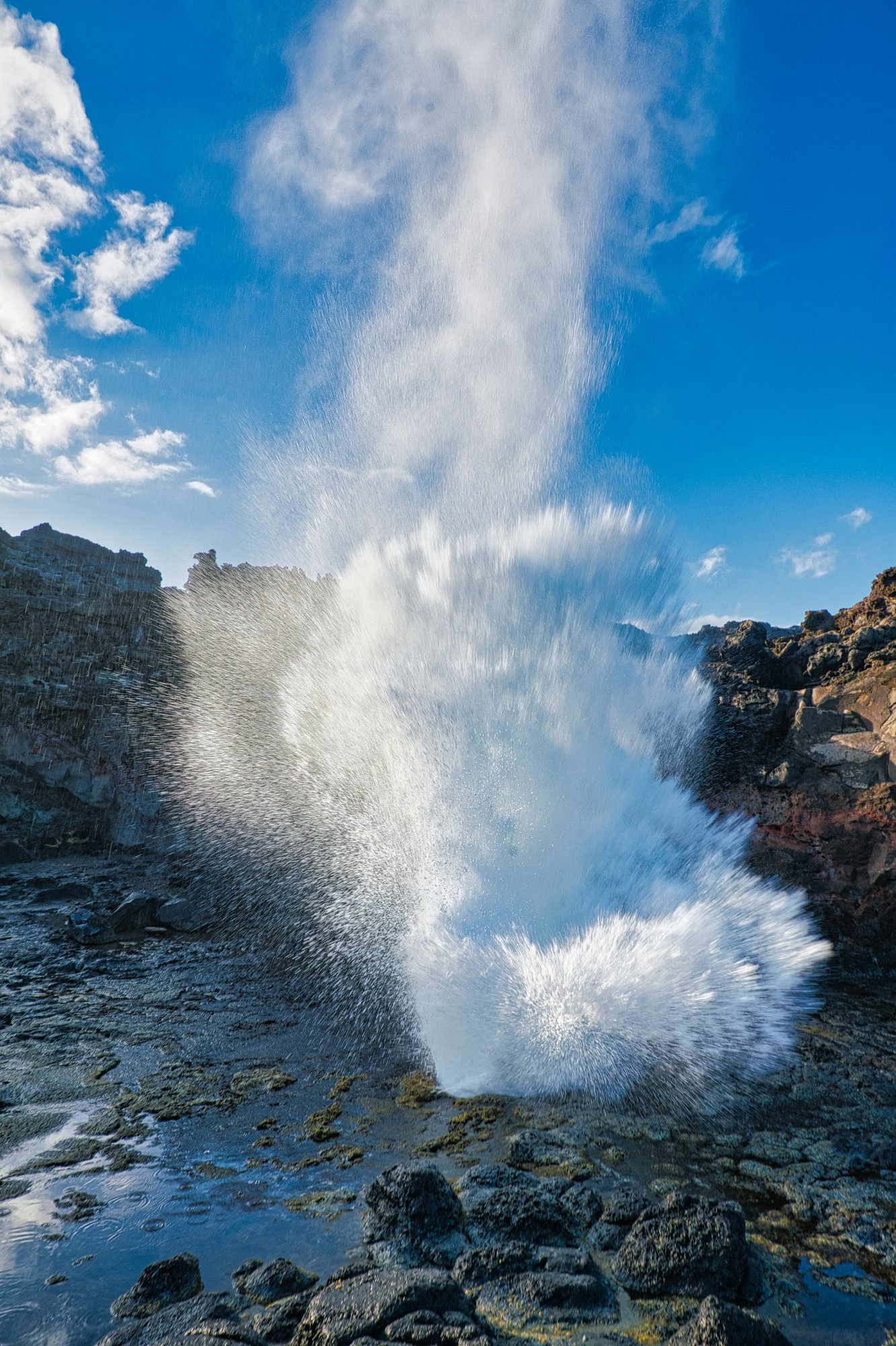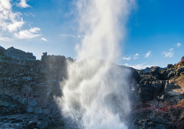 Die vom Meer heranrollenden Wellen schoben Luft mit Wasser durch ein Loch in der Lava und es ergaben sich fantastische Fontänen mit einer Höhe von vielleicht-25-30 Meter Höhe.