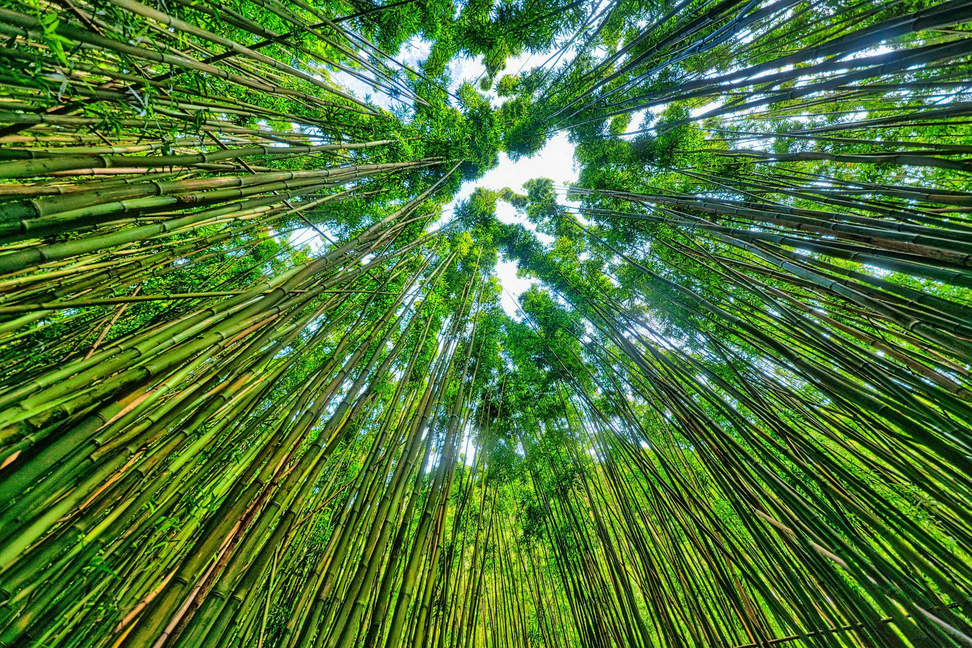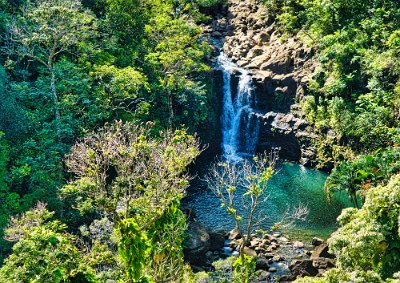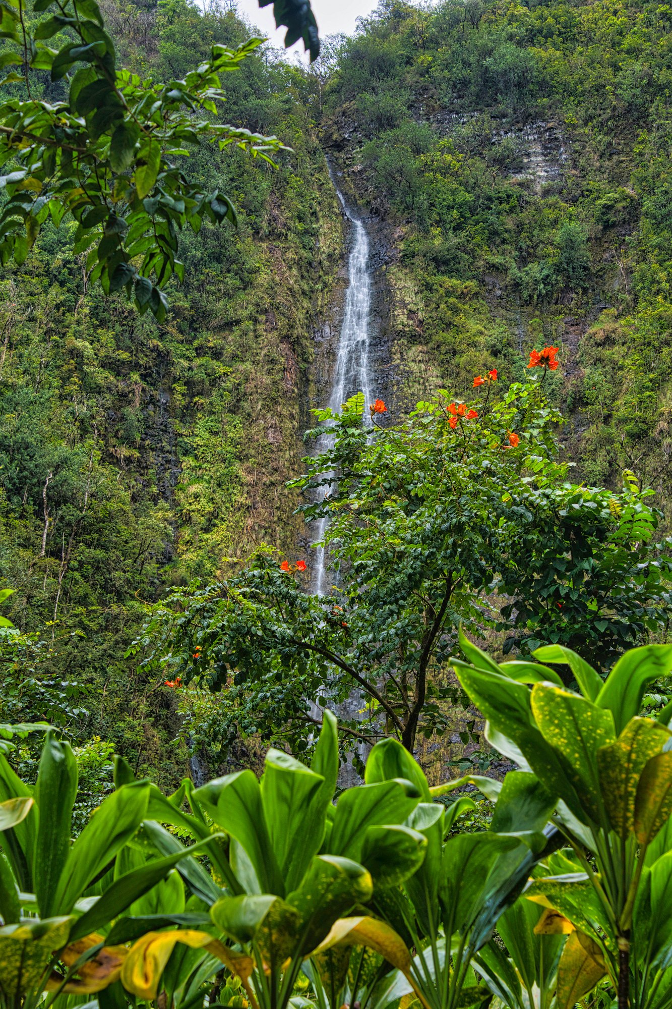 Der erste Höhepunkt auf dem Weg war ein riesiger Fikus. Die Flora war überhaupt überwältigend. Viele exotische Pflanzen säumten den Weg. Dann kamen zwei Pools in die zwei Wasserfälle sich ergossen. Über eine Brücke ging es über den Fluss und da war auch der Beginn des Bambuswaldes. Wir tauchten ein in etliche 10 Meter hohe Bambusstangen, die so dicht waren, dass man fast eine Taschenlampe benötigte. Dieser Bambuswald erstrecke sich von den Pools fast bis zum Ende des Weges und war wunderschön. Die Bambusstangen rauschten im Wind und klapperten, wenn sie gegeneinander-stießen. Große Teile des Weges waren mit Holz ausgelegt, eine Art Verandaholz, gut zu laufen, auch nicht rutschig. Die Sonne kam selten durch die Wolkendecke, aber der Bambus ließ sie dann noch seltener durch seine dichten Blätter hindurch. Wir liefen entlang des Baches, der von den Wasserfällen kam. Nach einer guten Stunde waren wir am Ziel. Vor uns zwei Wasserfälle eingebettet in eine üppige Flora, rote Baumblüten und alle mögliche Pflanzen, die man auch in Deutschland als Grünpflanzen im Blumenladen kaufen kann.