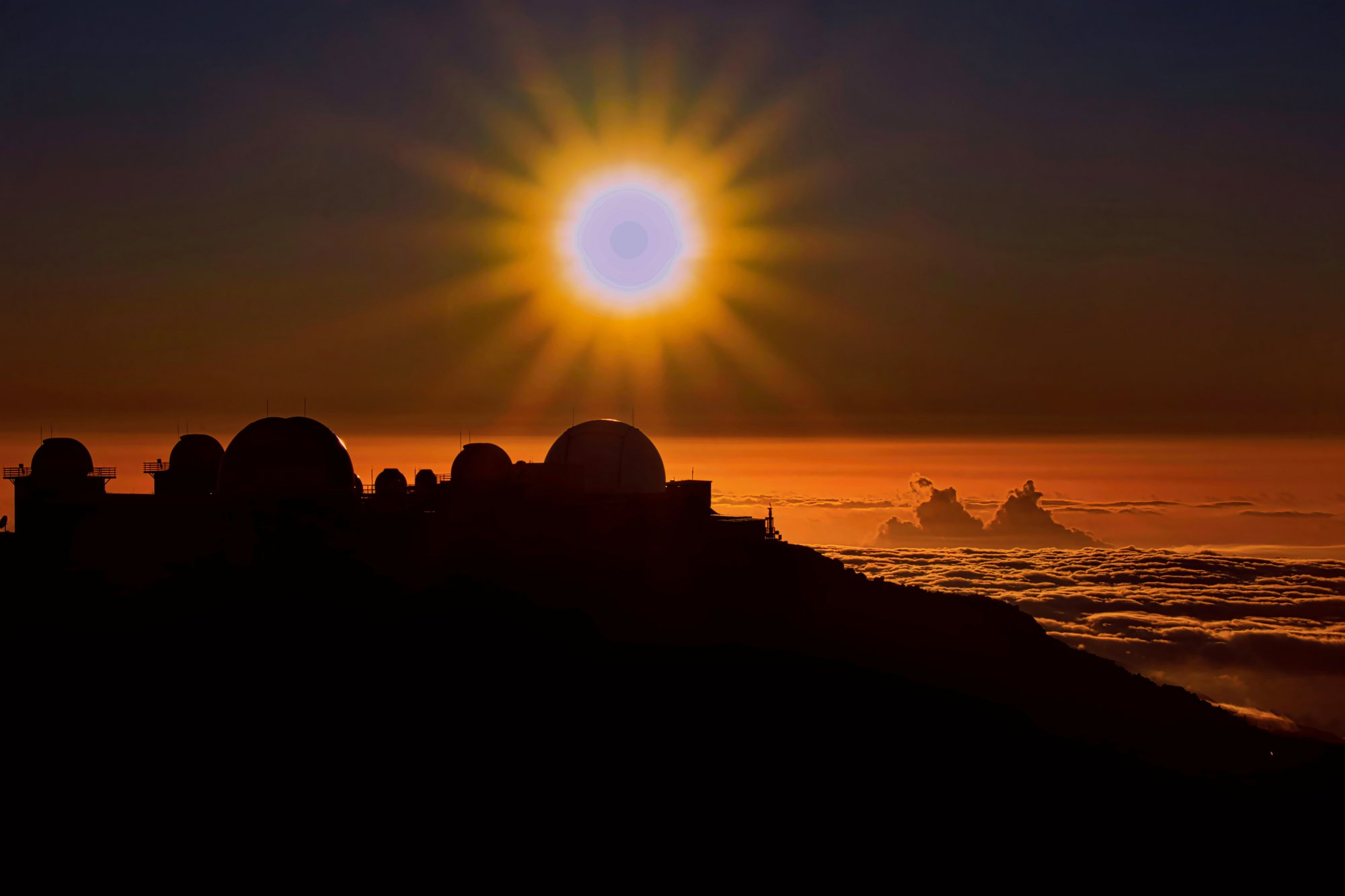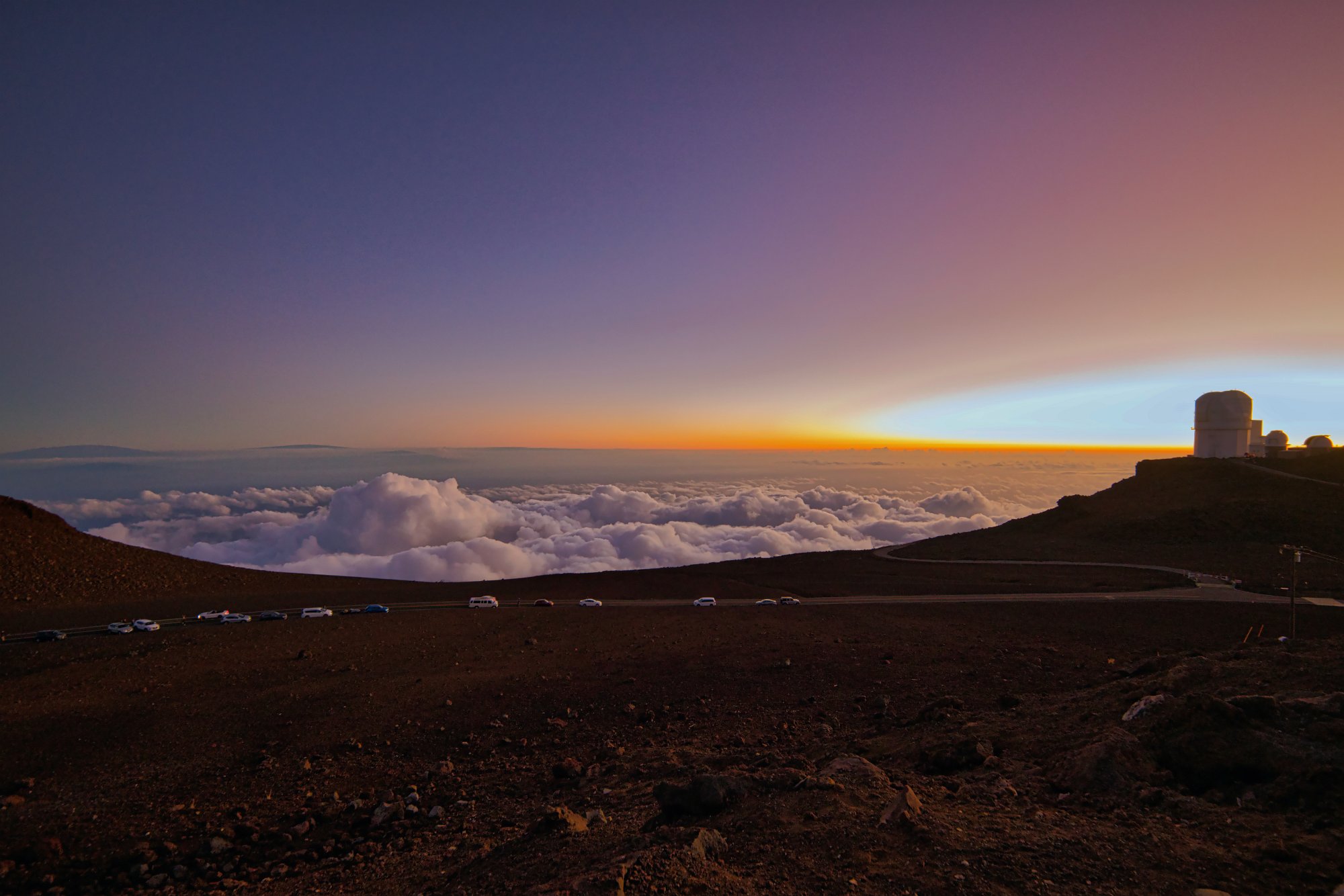 Der Gipfelparkplatz war überfüllte, sodass wir auf dem Seitenstreifen der Straße zum Observatorium Platz nehmen mussten. Von der noch 10 Minuten zu Fuß und wir waren mitten in einer Menschenmenge, die alle Richtung Westen blickten. Es war schon ein traumhafter Anblick so über den Wolken die Sonne untergehen zu sehen. Berauschende Farben, imposante Wolken, die Teleskope im Vordergrund und hinter uns der rot-bräunliche Vulkankrater, getaucht in blaues Licht und hinter ihm eine weiße Wolke, auf die wir hinabblickten.