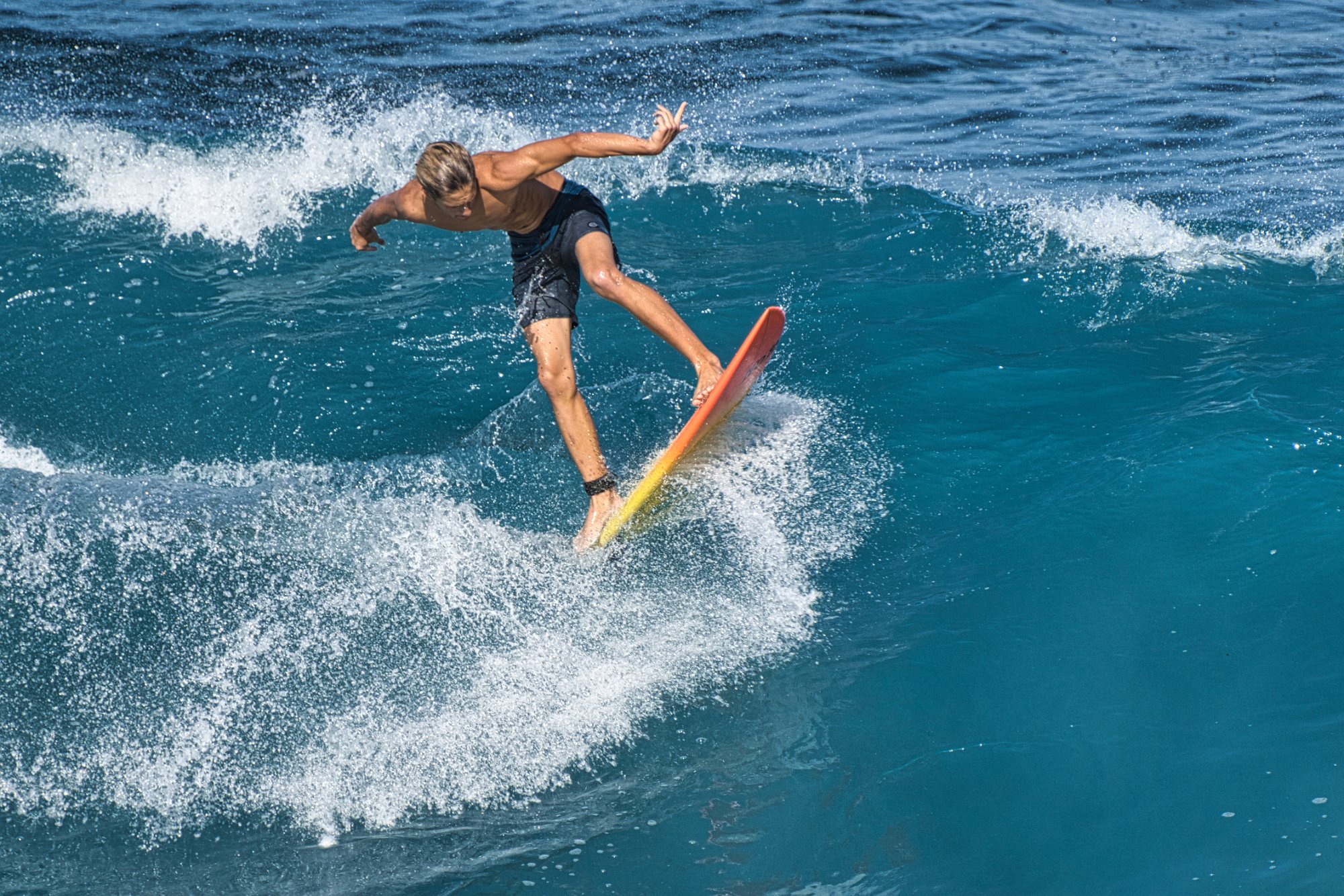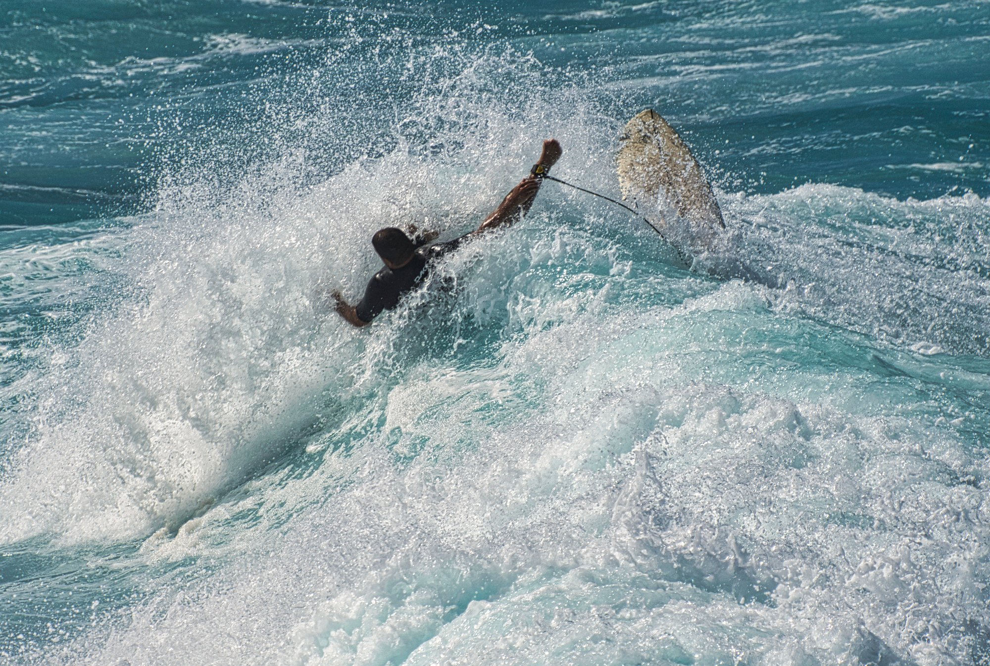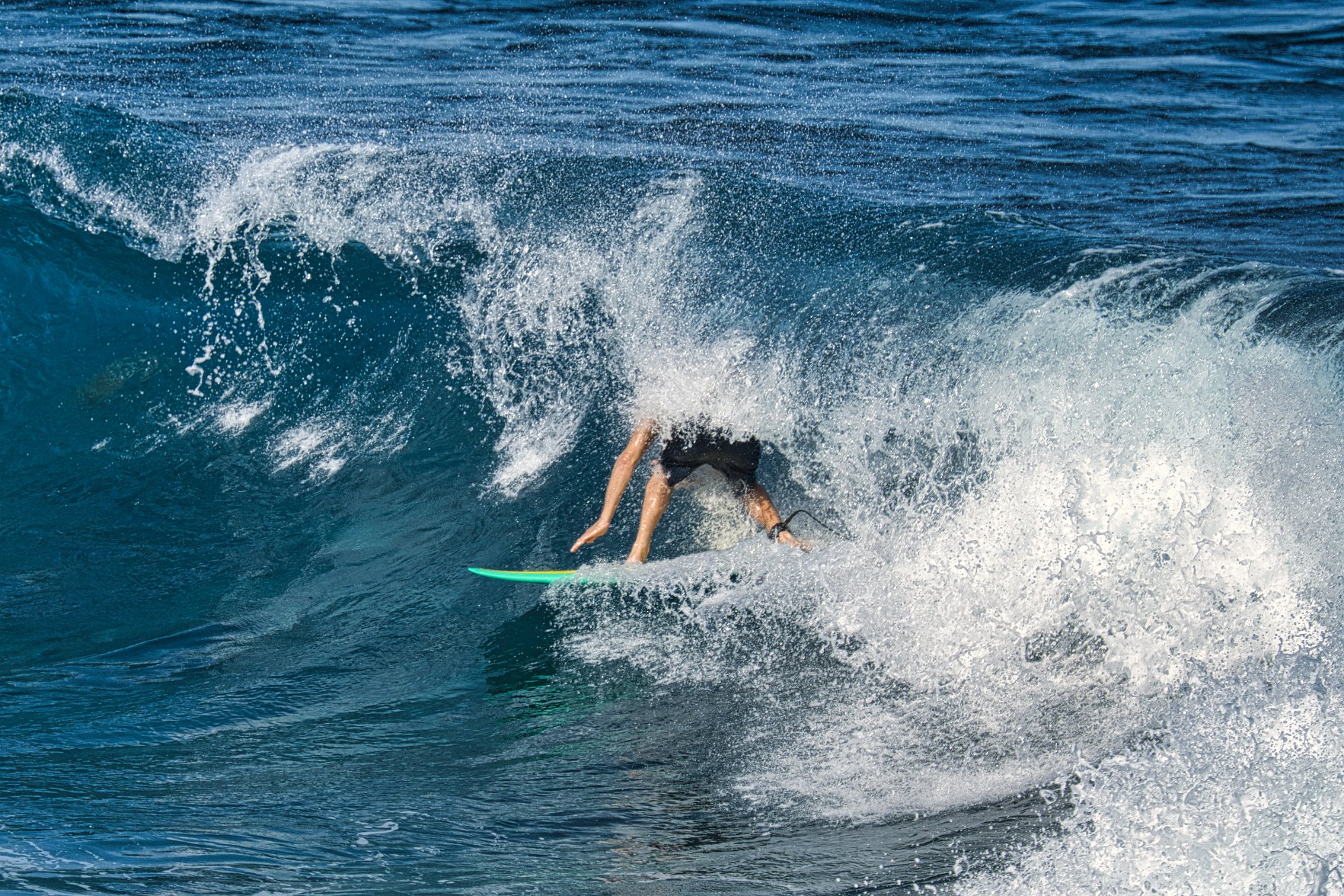 Nächster Stopp sollten die Wasserfälle werden, wir hielten aber an der Bucht, wo die Surfer auf den Wellen reiteten zum ersten Mal an. Blaues Meer, Sonne, Wellen, braune durchtrainierte Körper, eine Brandung die sich an dem Lavagestein am Ufer brach und die Gischt uns entgegenspritzte, eine klare Einladung zum Verweilen und Fotografieren.