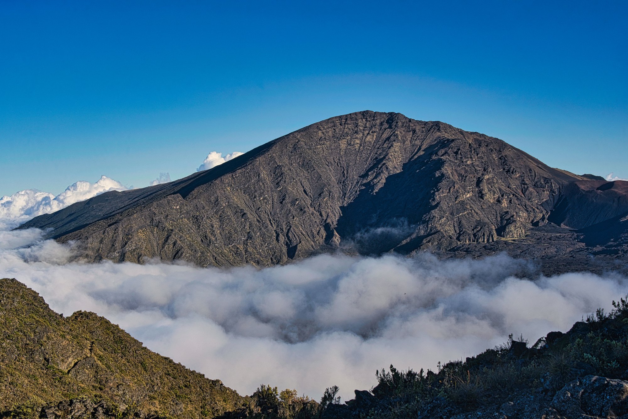 An der zweiten großen Kehre nach dem Visitor – Center machten wir einen Stopp und liefen den Haleakala -Trail bis zum Aussichtspunkt auf den gleichnamigen Krater. Die aufziehenden Wolken waren oberhalb des Visitorcenters von jetzt auf gleich verschwunden und wir befanden uns über ihnen bei grellem Sonnenschein mit atemberaubendem Blick auf die Wolken und das Meer darunter, was ab und zu sichtbar wurde. Mit diesem Blick zu unserer Linken und dem Berg auf der rechten Seite wanderten wir etwa 40 Minuten bergab, genossen dann einen schönen Blick in den Krater, stiegen aber nicht hinab, schossen viele Fotos und gingen zurück zum Auto. Unterwegs trafen wir neben den Touristen auch ein Amipärchen im Rentenalter, das mit Campingausrüstung auf einer mehrtägigen Tour rings um den Vulkan wanderte.
