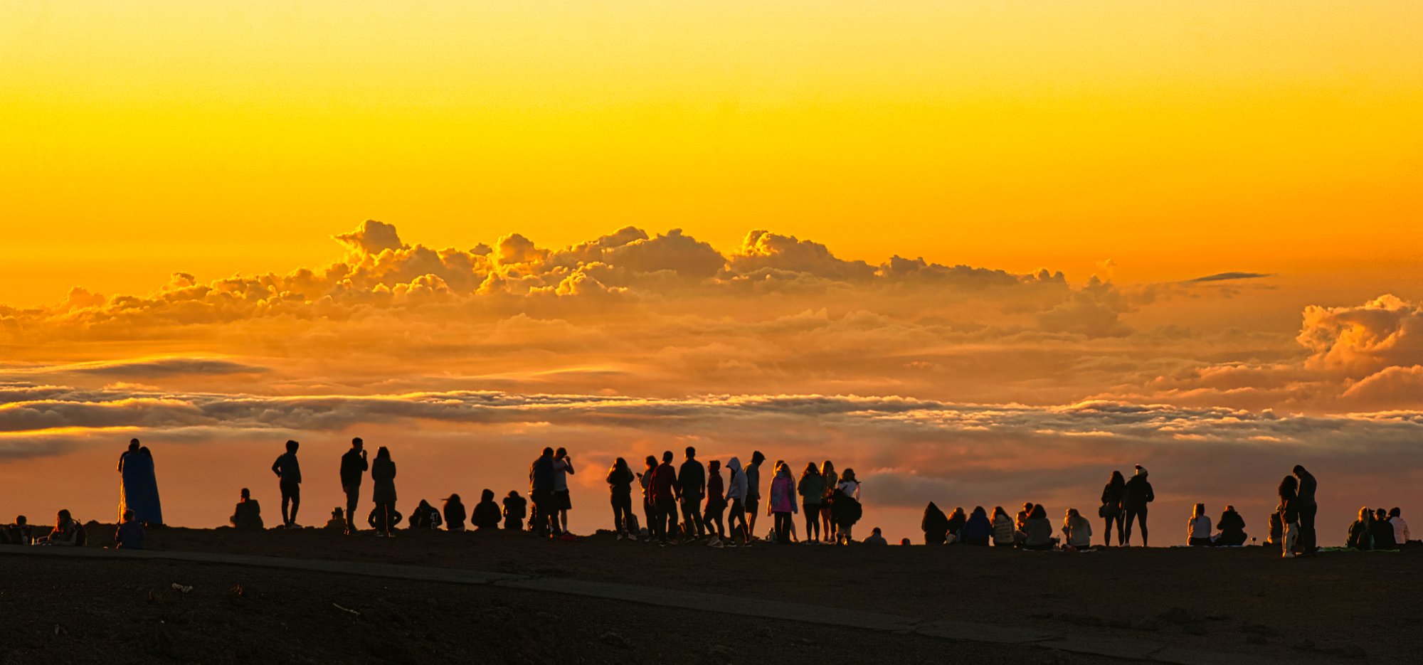 Wir waren ganz oben und konnten so den Menschen zuschauen, wie sie aufgereiht auf dem Kraterrand standen, bewaffnet mit Handys, Ferngläsern oder Fotoapparaten und der untergehenden Sonne huldigten. Hätten sie sich an die Hände gefasst, es wäre eine Menschenkette um den halben Kraterrand entstanden.
