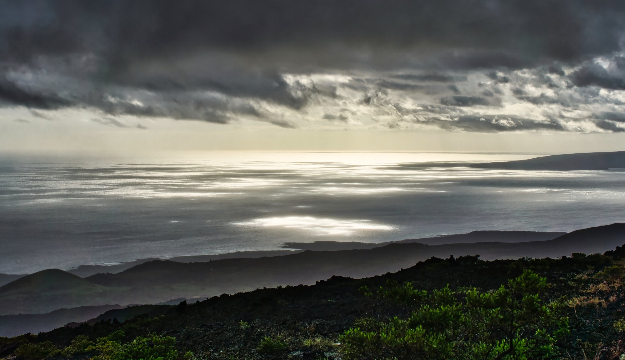 In der Nähe des Sonnenuntergangsspots (ich berichte) regnete es stärker, doch auf dem Meer bracht die Sonne an einigen Stellen durch die Wolkenschicht und das Wasser glänzte silbrig. Straße und Meer, viele schöne Aufnahmen.