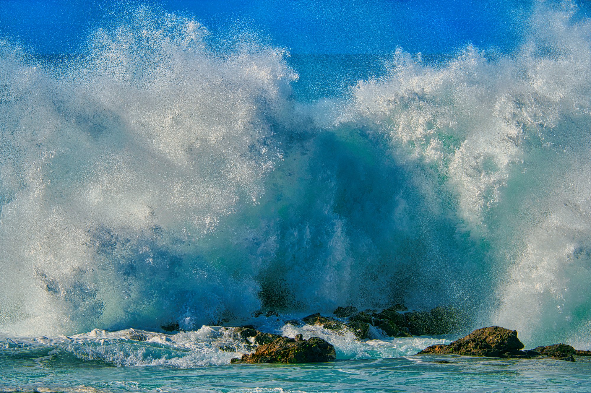 Die Anzahl der Erholenden hielt sich in Grenzen. Parkplatzprobleme gab es gar keine. Am dritten Strand machten wir dann Mittag und vor uns lagen zwei größere Lavasteine (Felsen), an denen sich die Wellen brachen. Viel Zeit das perfekte Foto zu machen, mit den Belichtungszeiten etwas zu experimentieren um entweder scharfe Tropfen oder Wasserstrahlen (Wischer) zu bekommen. Blauer Himmel und fotogene Wolken bildeten den perfekten Hintergrund.