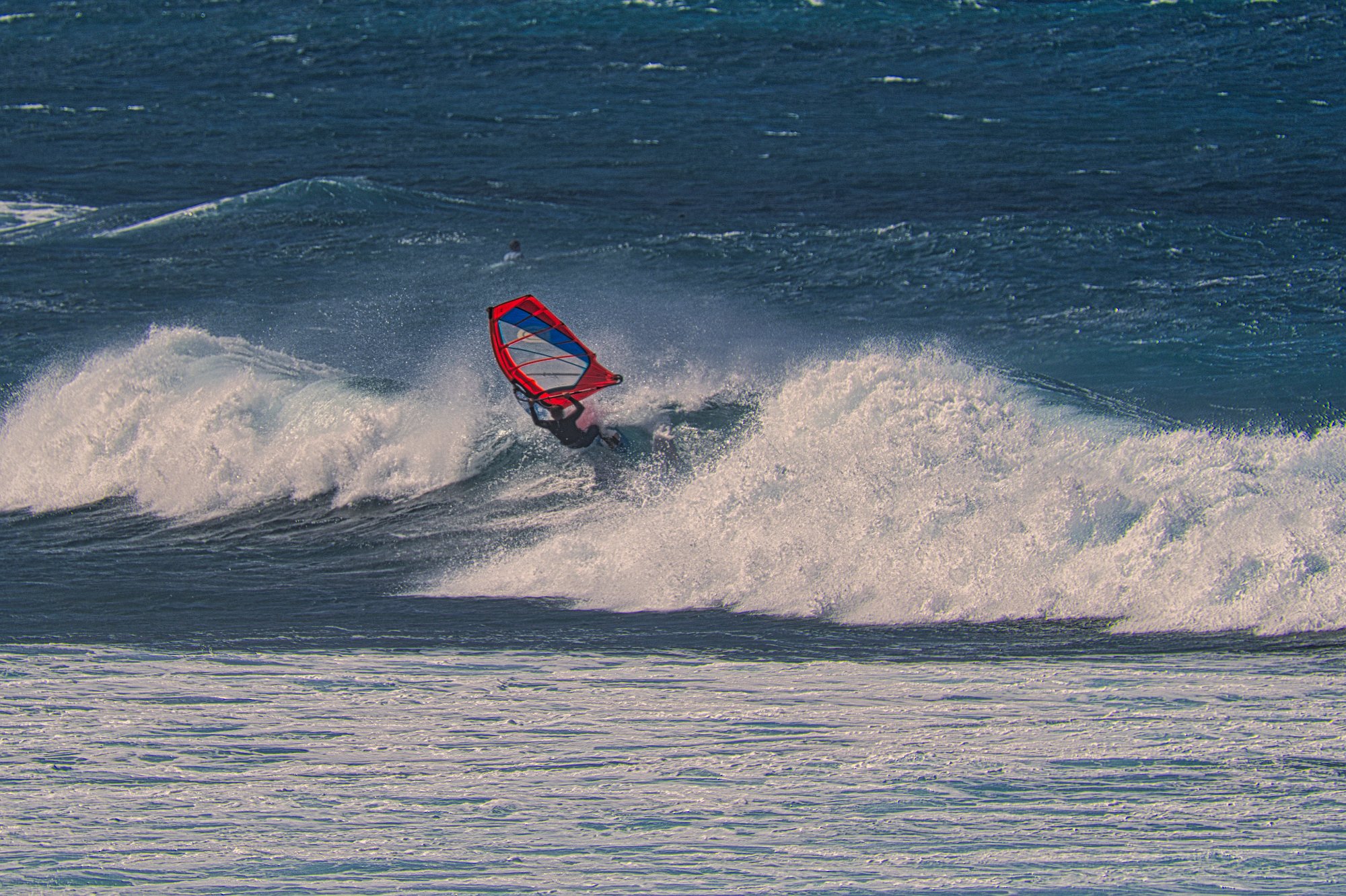 Wie die Surfer mit ihrem Brett dann vom Meer in Richtung Strand fuhren, mit atemberaubender Geschwindigkeit und auf den Schaumkronen tanzten, sich drehten und dann vom Wellenkamm hinunterschossen, das Surfbrett inklusive Segel in dem Schaum der Welle verschwand und nach Bruchteilen von Sekunden wiederauftauchte, es war zum Schwindlig werden. Schauen wir mal, was mein Tele geleistet hat, denn sie waren doch sehr weit weg von der Anhöhe, von der wir sie beobachteten.