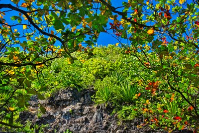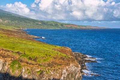 Kurz vor dem Parkplatz sahen wir noch einen roten Kardinal. Dann setzen wir die -Westumrundung fort. Die Aussichten waren nicht viel schlechter als auf der Straße nach Hana. Länger Abschnitte waren nur einspurig befahrbar. Einmal musste ich zurücksetzen bis zu einer Ausweichstelle, Rückwärtsfahren- nicht meine Spezialität und dann ging es noch an der rechten Seite steil bergab, und das ohne Wegbegrenzung und Seitenstreifen. In der nächsten Bucht etwa 50 m hinter uns zwängte sich der große Pickup dann vorbei.
