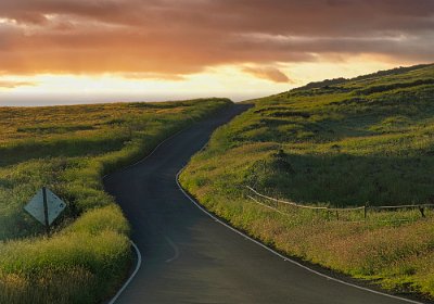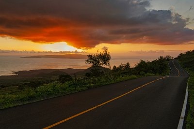 Ich gab also alles, um noch rechtzeitig an einen Sandstrand im Westen der Insel zukommen. Der Sonnenuntergang war heute besonders schön und leider konnte ich nicht anhalten, wir mussten ja noch im Hellen am Strand ankommen. Was wir auch schafften und Toma genoss den Stillen Ozean und ich fotografierte im letzten Moment die knallrote Sonne, wie sie im Meer verschwand.