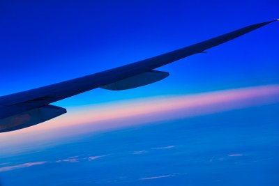 Wir haben die Turbulenzen hinter uns gelassen, es rumpelt aber trotzdem noch ordentlich. Unter uns, nun viel tiefer ist immer noch eine geschlossene Wolkendecke zu sehen. Die Sonne ist untergegangen, zumindest unter die Wolken. Jetzt haben wir die rosa-blaue Phase am Himmel, die mir persönlich besonders gut gefällt. Wir scheinen gegen eine Windströmung zu fliegen, den leichte Wolken ziehen am Fenster vorbei. Und es wackelt.