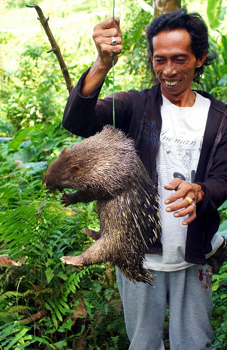 1Totes Stachelschwein auf Bali Dieses tote Stachelschwein fanden wir gleich zu Beginn unserer Wanderung durch den Regenwald auf Bali. Unser Guide informierte den Bauern, der am Rande des Waldes seine Hütte hatte. Als er das tote Stachelschwein sah, war er entzückt über den Fang und die unerwartete Fleischmahlzeit, die das Tier für ihn bedeutete.