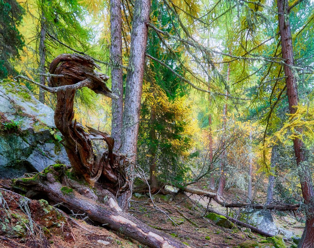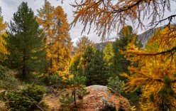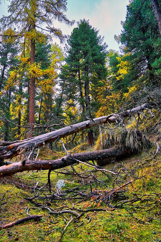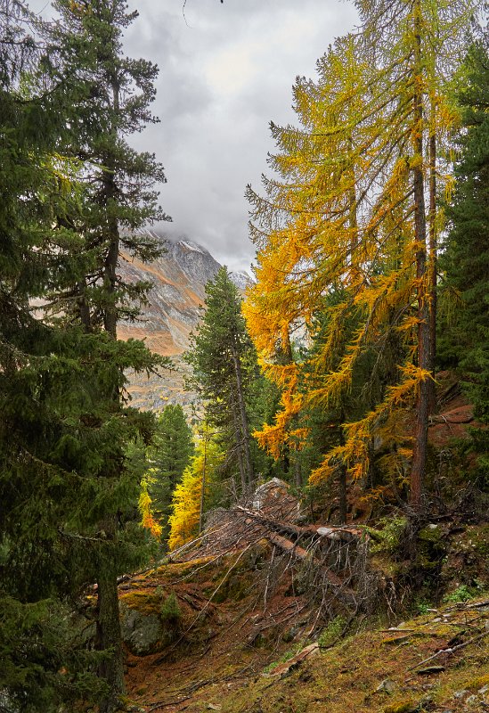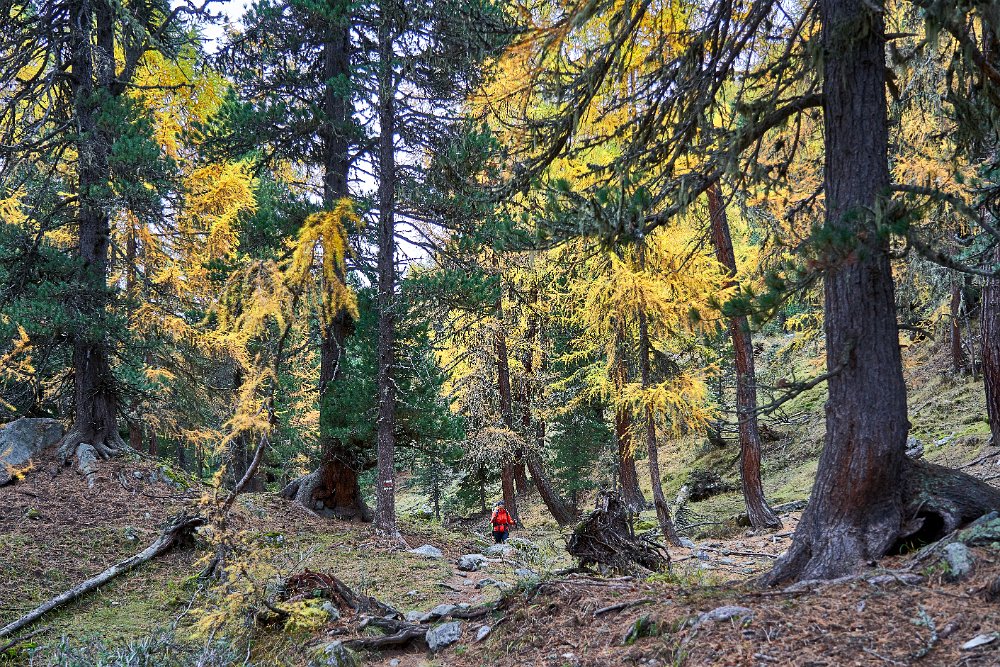 Der Aufstieg, der dann begann, durch den Wald war sehr schön. Dadurch fühlte er sich auch nicht so anstrengend an. Denn der Wald gab einige seiner Geheimnisse preis. Erst sahen wir Eichhörnchen, dann eine Gämse, die sich nicht so leicht aus der Ruhe bringen ließ. Erst als wir auf weniger als 10 Meter herangekommen waren, bequemte sie sich aufzustehen und davon zu traben, keinesfalls fluchtartig. Schöne Bilder und Videos gelangen. Da wäre der Hase fast vergessen gewesen. Doch was man nicht hat, wiegt schwerer als jeglicher Besitz. Kurz darauf sahen wir eine ganze Herde Gämsen und weiter oben noch einmal ein einzelnes Exemplar, das sich überhaupt nicht aus der Ruhe bringen ließ. So konnte ich Toma im Vordergrund mit der Gämse fotografieren.