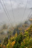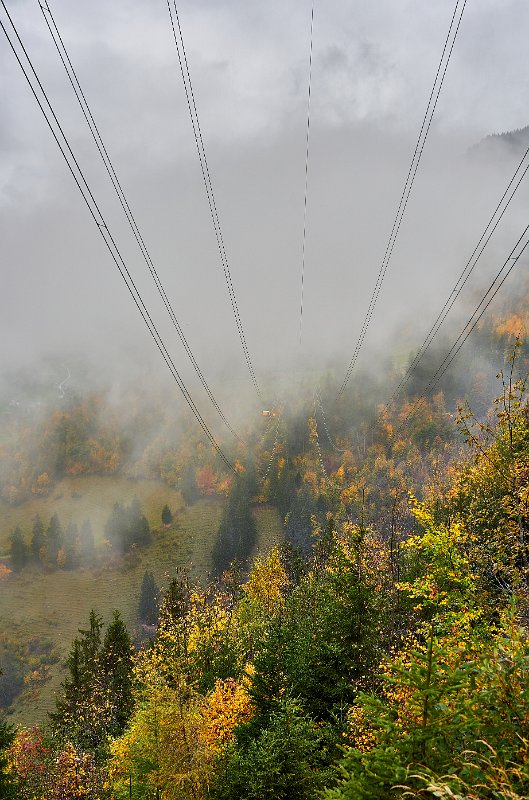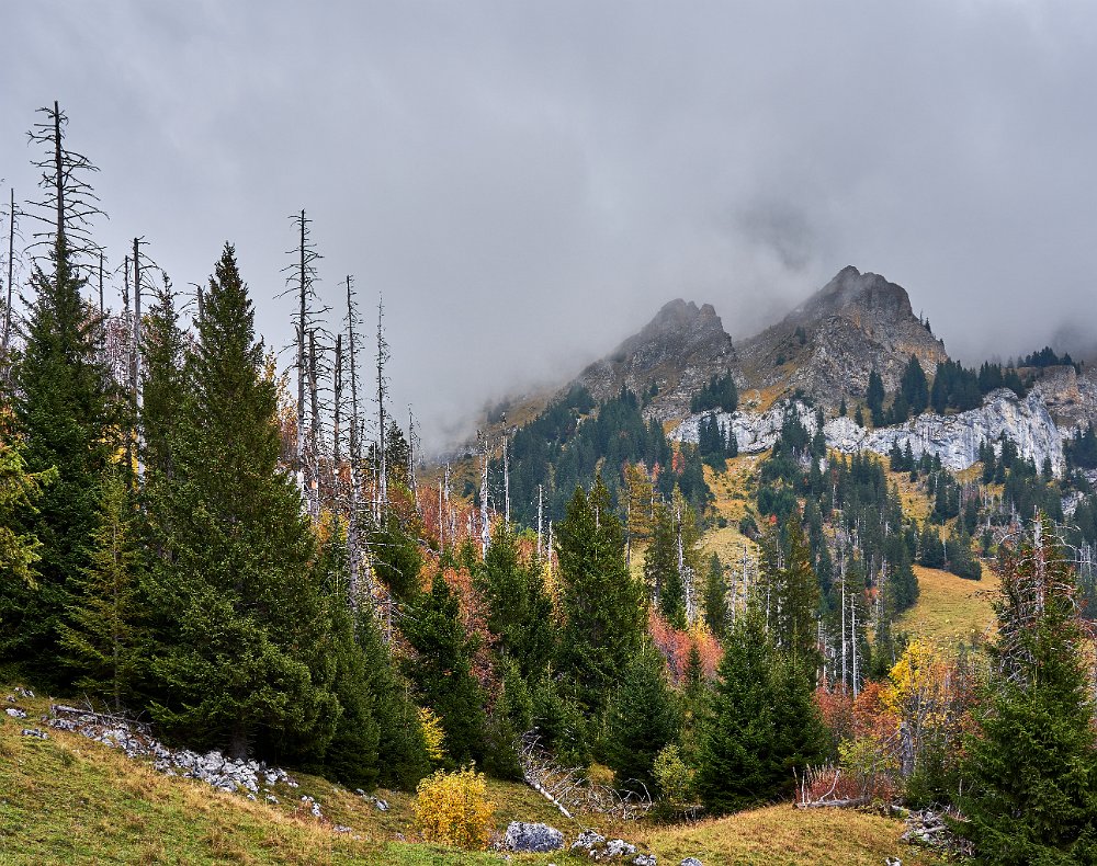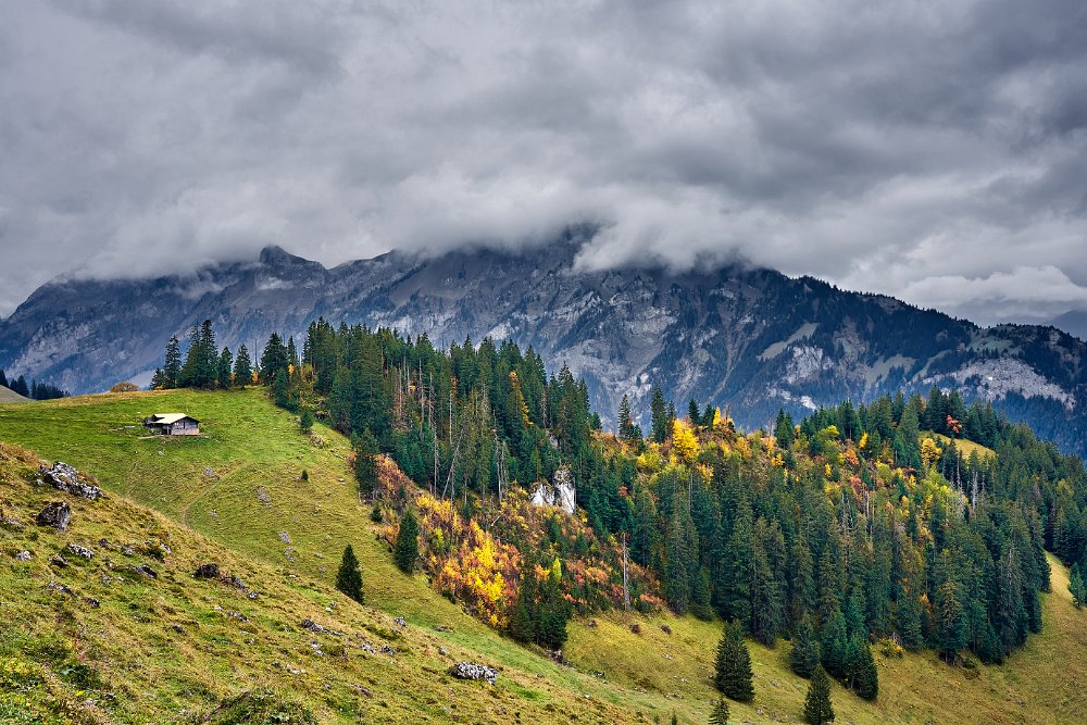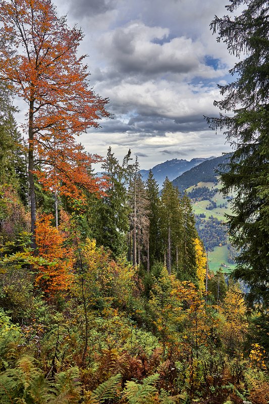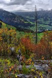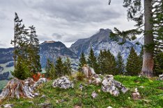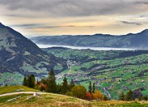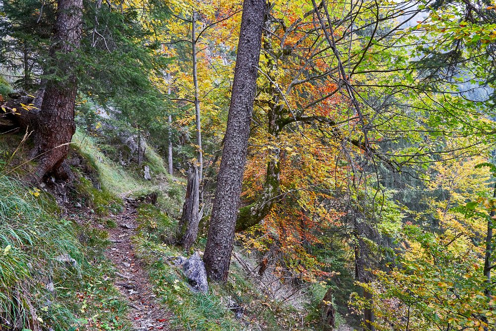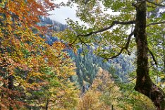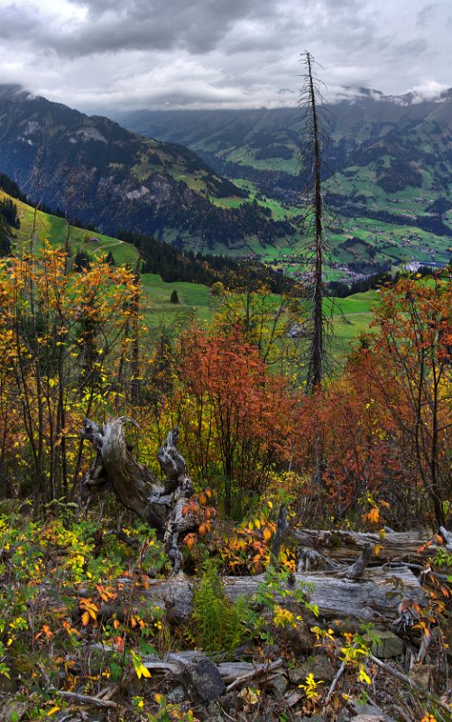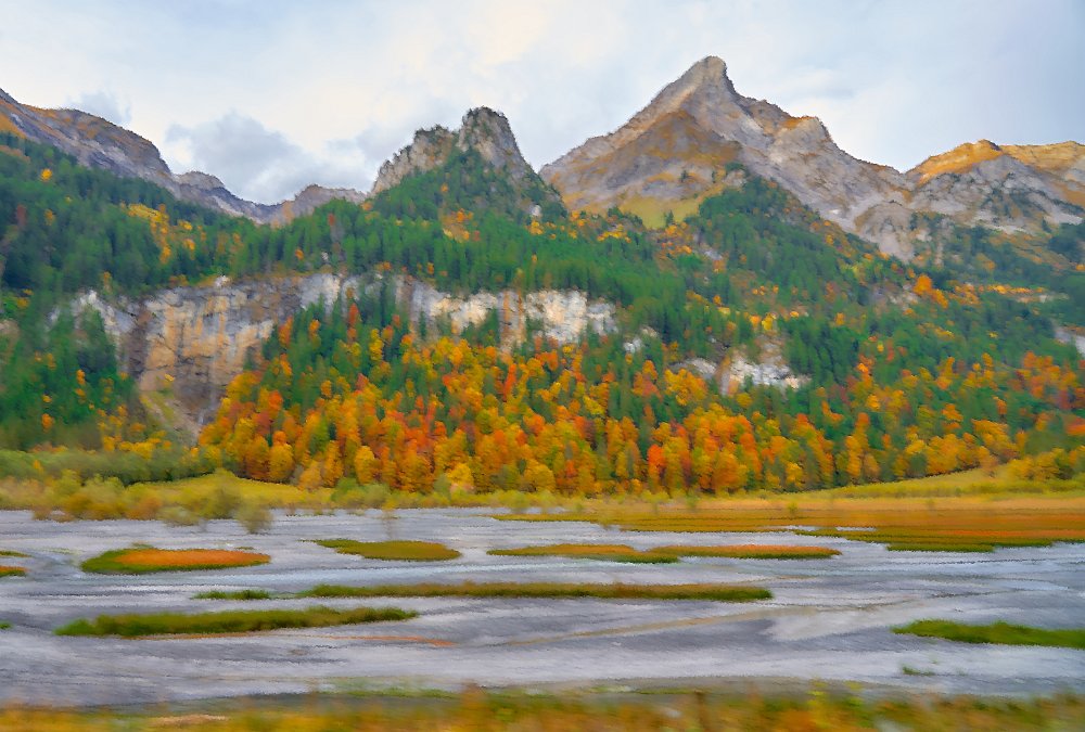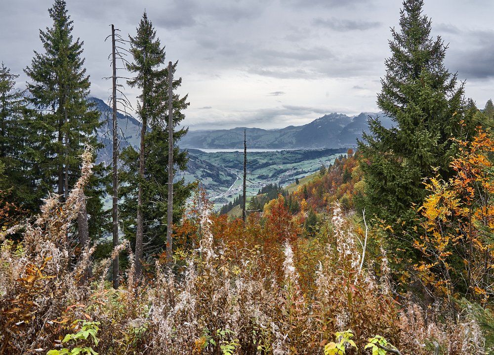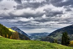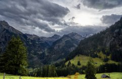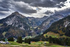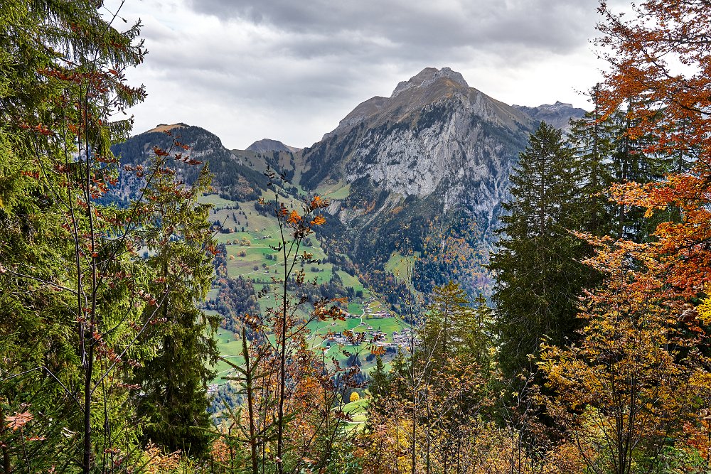 Da alles um mich herum so harmonisch, traumhaft romantisch war, brauchte ich nur noch mit dem Zeigefinger abzudrücken. Frühstück und auf zum Postbus, der wenige Minuten entfernt im Hotelzentrum der Griesalm schon auf uns wartete. Der Post Bus legt auf der Strecke von der Griesalm nach Kiental die steilste Strecke zurück, die ein Bus in Europa bergauf oder bergab überwinden kann. 28 % Steigung sind zu meistern und kurz danach geht es durch die engere Stelle herausgearbeitet aus dem Felsen, die ein Bus in Europa durchfahren kann. Weiter vorbei am Wasserfall, am Hexenkessel mit Posthorn-Getöse, das uns wieder mit unserer vorjährigen Tour im Geiste verband. Eine wunderschöne Fahrt gespickt mit Highlights. In Kien gingen wir wenige Schritte bergab zu Seilbahn, die mit und für uns die heutigen Höhenmeter absolvieren sollte. Oben angekommen hatten wir schon mal wieder 56 SF für Transportleistungen ausgegeben. Von der Bergstation bis Kantersteg, unserem heutigen Etappenziel waren es 5 Stunden und 35 Minuten zu gehen. Eine machbare Aufgabe. Wir liefen auf dem Lötscher Panoramaweg (Nr. 56) und nicht, wie es die Via-Alpina vorschrieb, über de Blümlialp. Denn es sollte nach Auskunft des Seilbahnbetreibers in der Talstation etwa gegen 12.00 Uhr regnen. Windig und wolkig war es schon und die ersten Tropfen bekamen wir schon bei der Bergfahrt im Sessellift ab. Auf der Blümlialp würde es wegen der Höhe schneien, die Wolken die Sicht eintrüben und das Risiko wollten wir nicht eingehen. Außerdem viele Höhenmeter, vor allem viele bergab. Die Alternative über den Panoramaweg begann auch mit einem Aufstieg. Vielleicht eine ¼-Stnde, dann ging es im Travers weiter. Toma musste sich bald umziehen, damit sie gegen Mittag fertig war, wenn der Regen kommen würde. Das dauerte eine Weile. Es tropfte aber jetzt schon mal weniger mal mehr. Es war jedoch zum Aushalten. Wir kamen zügig voran, wobei sich aber das Panorama in Grenzen hielt, da die aufkommenden Wolken keine besonders gute Fernsicht erlaubten. Aber der Thunsee war zu erkennen und wenn der Blick ins Tal sich öffnete und dann noch Laubbäume im Vordergrund das Bild verzierten, hüpfte das Herz des Fotografen vor Freude. Ab und zu verlief der Weg mal auf Wirtschaftswegen, kurze Stücke Asphalt waren auch dabei, aber im Wesentlichen war es ein schöner Weg. Zumindest bis zu der Raststelle, die wir für unser Mittag nutzten. Ein überdachter Unterstand, Sicht, sogar eine Toilette. Während des Rast zog es sich endgültig zu und als wir weitergingen, hieß es volle Regenausrüstung anlegen. Wir waren noch nicht allzu weit gegangen, als auf dem weiteren Weg Absperrbänder waren, und wir entschieden, dieser indirekten Aufforderung Folge zu leisten und den Weg nicht weiter zu gehen. Das bedeutete wir mussten vom Panoramaweg absteigen. An Panorama war eh nicht mehr zu denken und den Weg hatte man uns ja auch vermasselt. Wir stiegen ab und das bis ins Tal, da kein Weg in Richtung Kantersteg führte. Am Bahnhof dann nach links und bald danach ging es auch wieder hinauf. Steil, anstrengend im Regen. Die Stöcke halfen. Warm geworden, zumindest von innen, trafen wir oben, ziemlich weit oben, wie es uns vorkam, wieder auf den Panoramaweg. Das ging dann eine Weile gut, bis wieder der Weg sehr deutlich versperrt war. Wieder mussten wir absteigen. Als wir aus dem Wald herauskamen, stand da ein Schild mit Halt, nicht weitergehen, Gefahr von Sprengungen. Na prima. Der Asphaltweg führte uns zum Ausgang eines Autotunnels und wenige hundert Meter weiter war auch eine Bushaltestelle. Als ich auf den Fahrplan und dann auf die Uhr schaute, waren die Zeiten deckungsgleich, wenn der nächste Bus fahren sollte. Obwohl neben dem Bushalteschild wieder ein Schild war, das nach Kantersteg zeigte (und 50 Minuten angab), war es Toma doch zu ungewiss, wo wohl dieser Weg wieder enden würde, in welchem Sperrgebiet. Also warteten wir auf den Bus. Nur ein paar Minuten und waren auch sehr schnell in Kantersteg. In der Information buchten wir ein Zimmer im Hotel zur Post, im Coop kauften wir Weintrauben und Proviant für den morgigen Tag und nun bliebe nur noch über das Abendbrot zu berichten. Doch so spannend war es nicht.