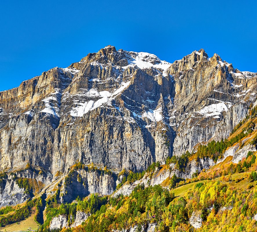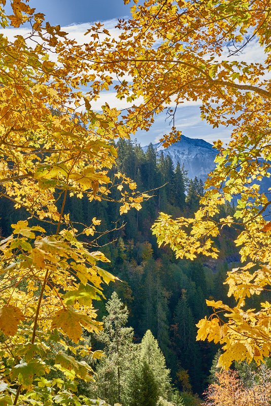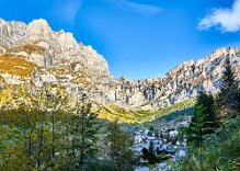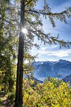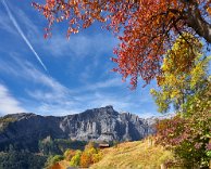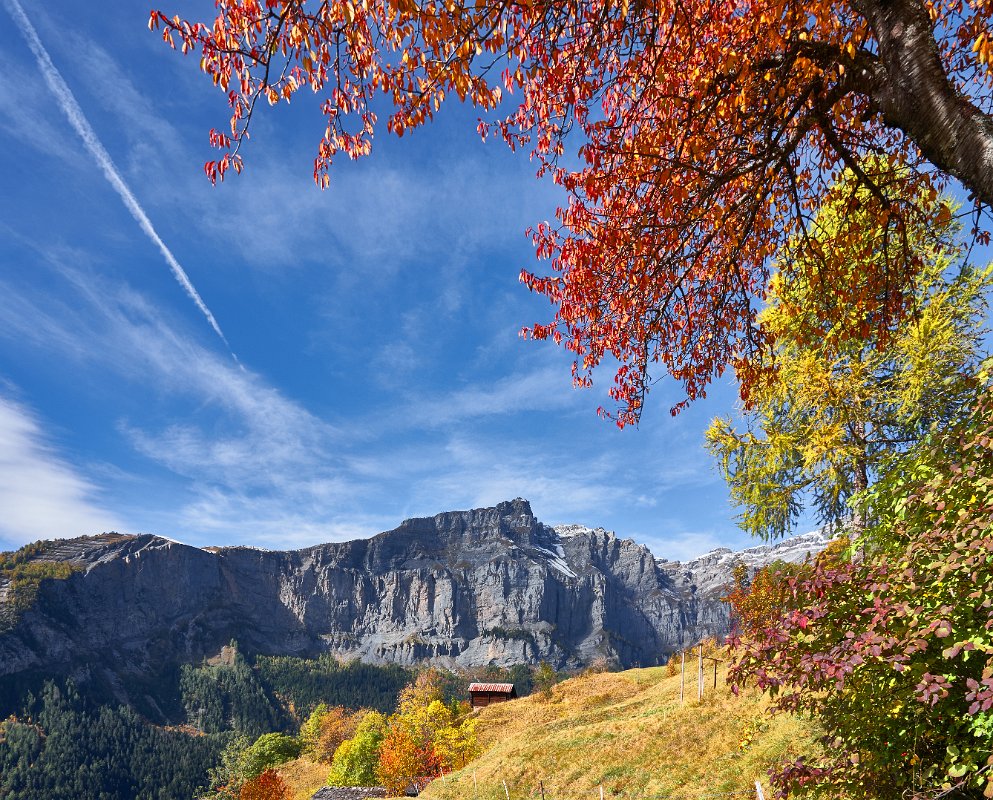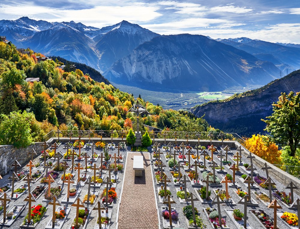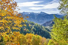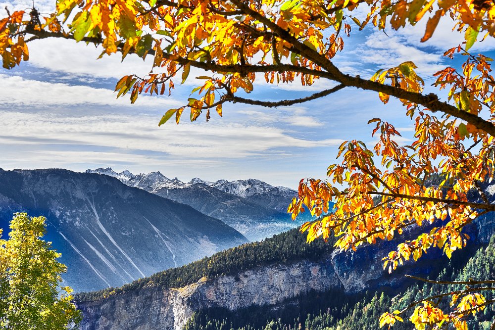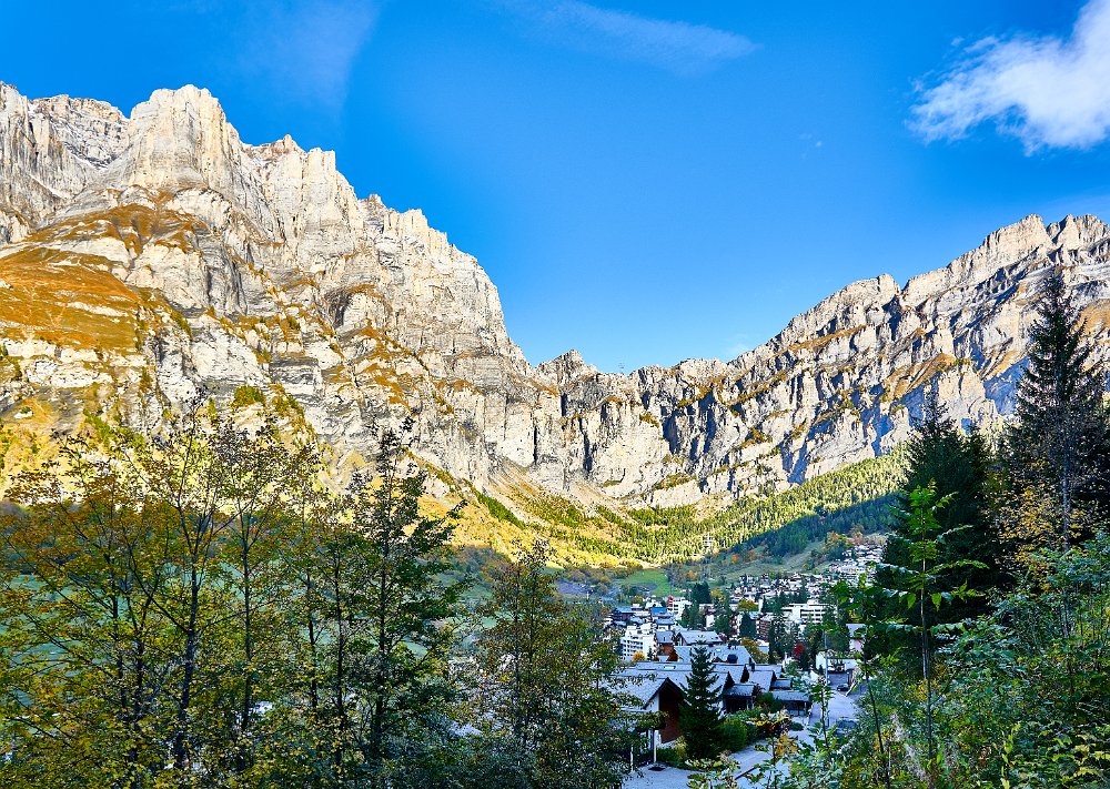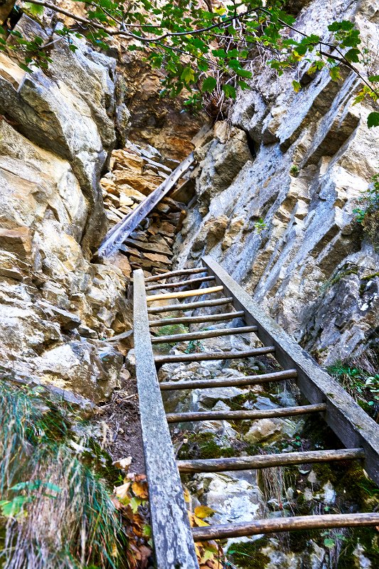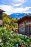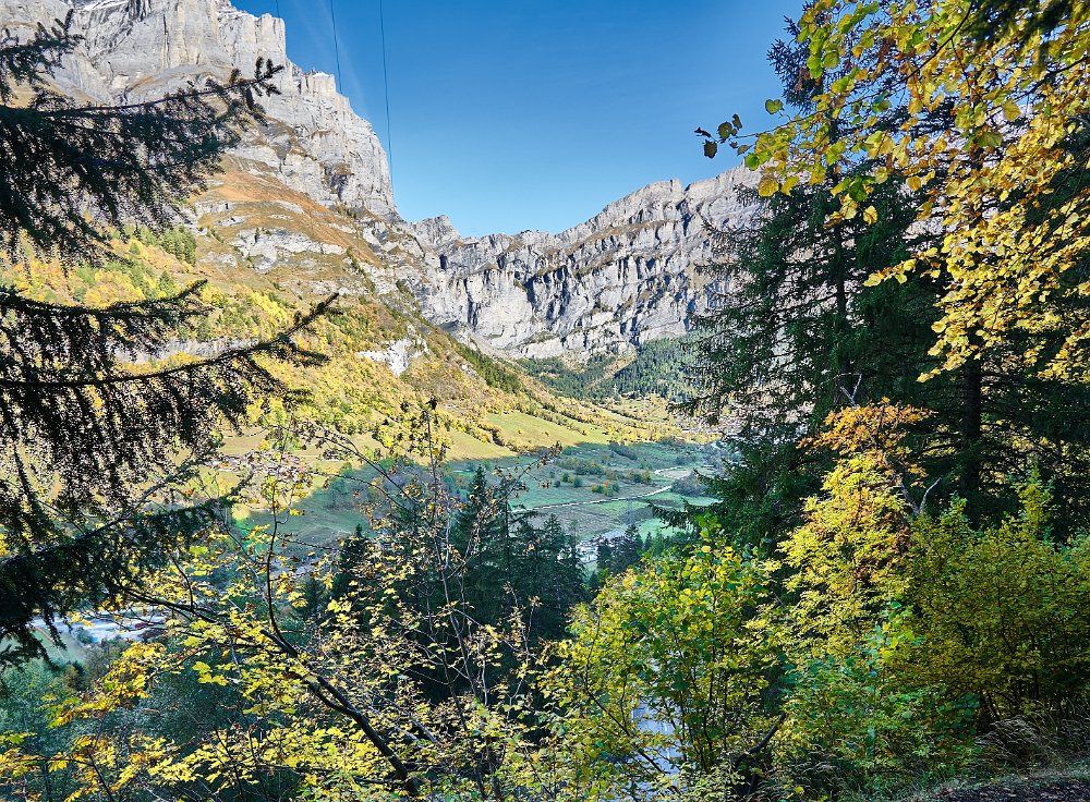 Reichliches Frühstück, gegen 9.30 Uhr gingen wir los in Richtung Albinen. Die Zeitangaben waren bereits im Ort sehr verschieden. Wir sollten sie heute überhaupt nicht verstehen. Der Wanderweg (der direkte) führt über die Leitern, die laut Reiseführer (Via-Alpina -Dokumenation) über 8 Leiern 100 Höhenmetern bergauf. Als ich vor den Leitern stand, lehnte ich das Vorhaben ab. Toma versuchte mich mit aller Macht zu überzeugen, ging die erste Treppe hoch und sagte es wäre ganz einfach. Ich packte die Stöcke weg, den Fotoapparat und ging bis zum Ende der ersten Leiter. Der Übergang zur zweiten Leiter beendete dann auch meinen verzweifelten Akt der Selbstüberschätzung, denn da hätte man ohne Sicherung einen gewagten Schritt gehen müssen, der wenn es schief ging, am unteren Ende der ersten Leiter geendet hätte. Also Kommando zurück, getreu dem Schwur der Friesenbergscharte, kein unnötiges Risiko. Wir suchten einen anderen Weg der sich mit der Straße anbot, die ich unter uns befand. Wir folgten der Straße bis zum Tunnel. Rechts vom Tunnel ging der Weg nicht nach Albinen, also musste der Weg durch den Tunnel dort hinführen. Toma liebt zwar Leitern aber keine Tunneln. Ich lief also schauen, wie lange der Tunnel war. Etwa fünf Minuten. Ich holte Toma und als wir den Tunnel gemeinsam passiert hatten, sahen wir einen Wegweisern zu den Albinen -Leitern, mit hoher Wahrscheinlichkeit zum oberen Einstieg. So war es dann auch. Nach einer weiteren Viertelstunde waren wir in Flaschen und weiter ging es in Richtung Albinen. Das Wetter war sonnig und die Ausblicke, die sich immer wieder vom Weg in Richtung Bergen boten, waren einfach toll. Heute wurde die zweite SD-Karte voll, so unwiderstehlich waren die Motive auf dem Weg. Farben, Farben und einfach eine Landschaft, die fotogener nicht sein konnte. Die Zeitangaben für die Distanz Leukerbad – Albinen schwankten zwischen 1 Stunde 20 und zwei Stunden. Wir benötigten 3 Stunden. In Albinen, im Restaurant Sonnenblick, das seinen Namen zurecht trug, machten wir Mittag.