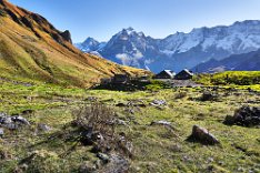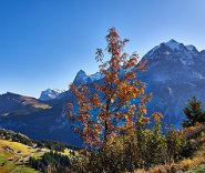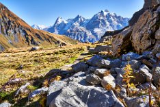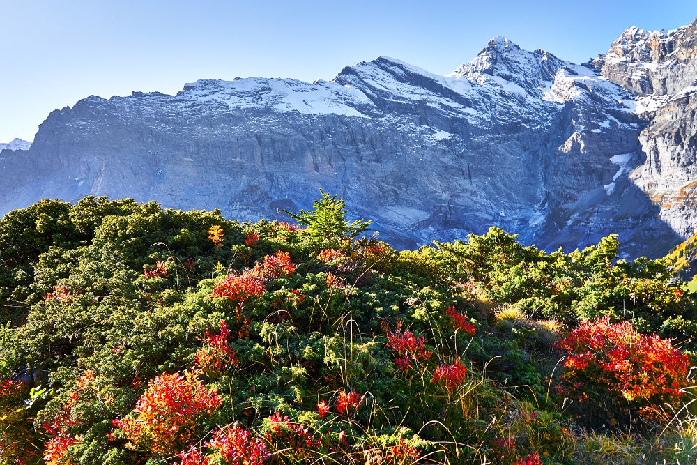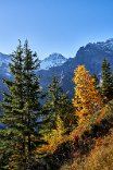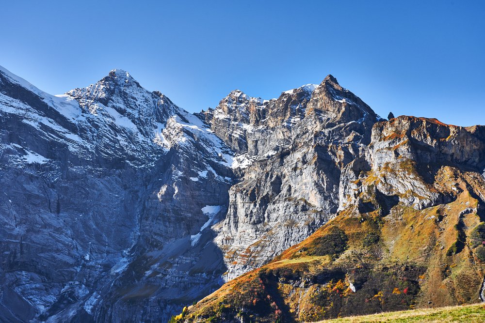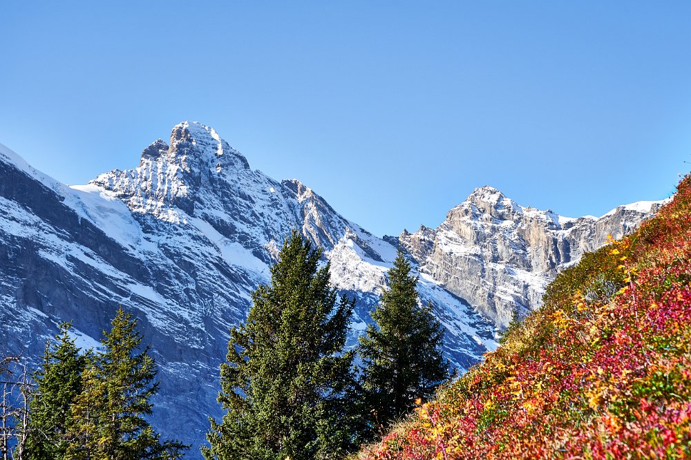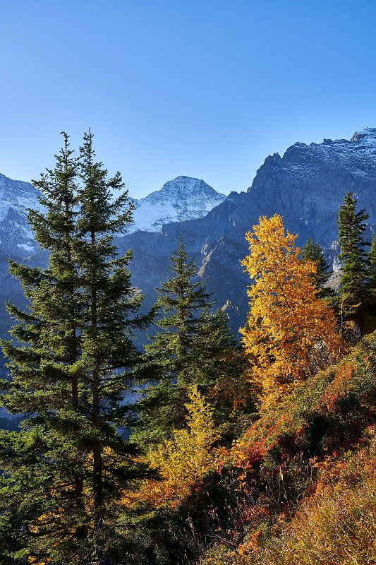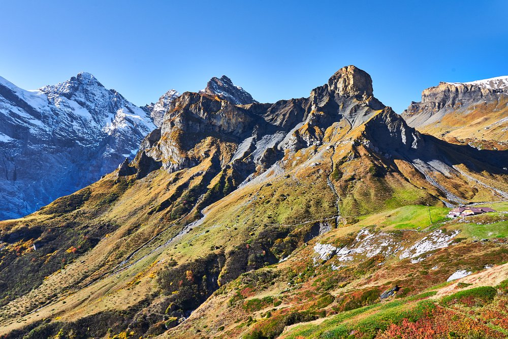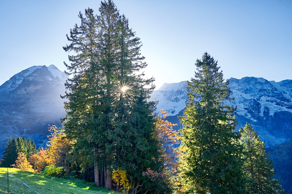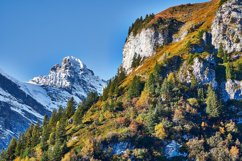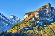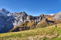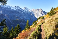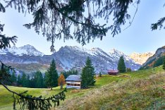 Die Sonne war noch hinter den Bergen, man roch sie aber schon. Es ging in Richtung Spilbodenalp, erst leicht, dann steil bergauf. Als die Sonne hinter den Bergen hervorbrach, begann das Glück des Fotografen. Wunderschöne Landschaft, gerade bilderbuchmäßig, vereinzelte Bäume in den herbstlichen Farben, im Sonnenlicht glänzende schneebedeckte Bergkämme. Superb, eine Nachverarbeitung wird kaum von Nöten sein.