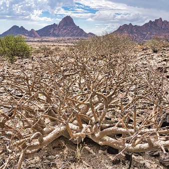 Die Vegetation, vor allem Butterbaum, Balsambaum, Boscia albitrunca, Wüstenkohlrabi und Euphorbia, ist hier reichhaltiger als in der Umgebung, da die Wolken hier öfters abregnen.
