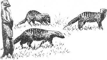 Another species which lives in groups is the BURCHELL'S ZEBRA. Although zebras are usually associated with open plains country, they are found in Manyara wherever there is a stretch of open grassland. Zebras live in either family units containing up to a dozen females and young, or bachelor herds of mainly immature males. Each family is controlled by a stallion, which defends it both against potential rivals and against predators. Foals 84'e born in all months except the dry sea9Olll.